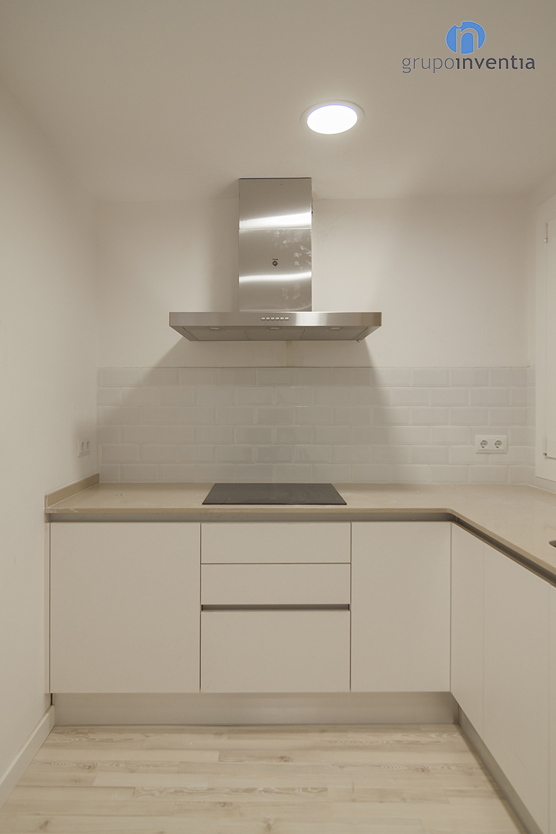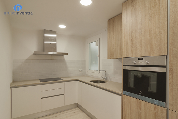 Una de las estancias que vio mejorado su equipamiento tras el paso de Grupo Inventia fue la cocina. La reforma de cocina de calle Biada se distribuyó en forma de L, consiguiendo así una organización perfecta del espacio. En la parte derecha de esta cocina, antes de la encimera, se colocó un mueble de cocina en el que se encastraron los electrodomésticos. En este caso, la nevera queda camuflada por la puerta del armario, mientras que el horno y el microondas sí que están visibles.