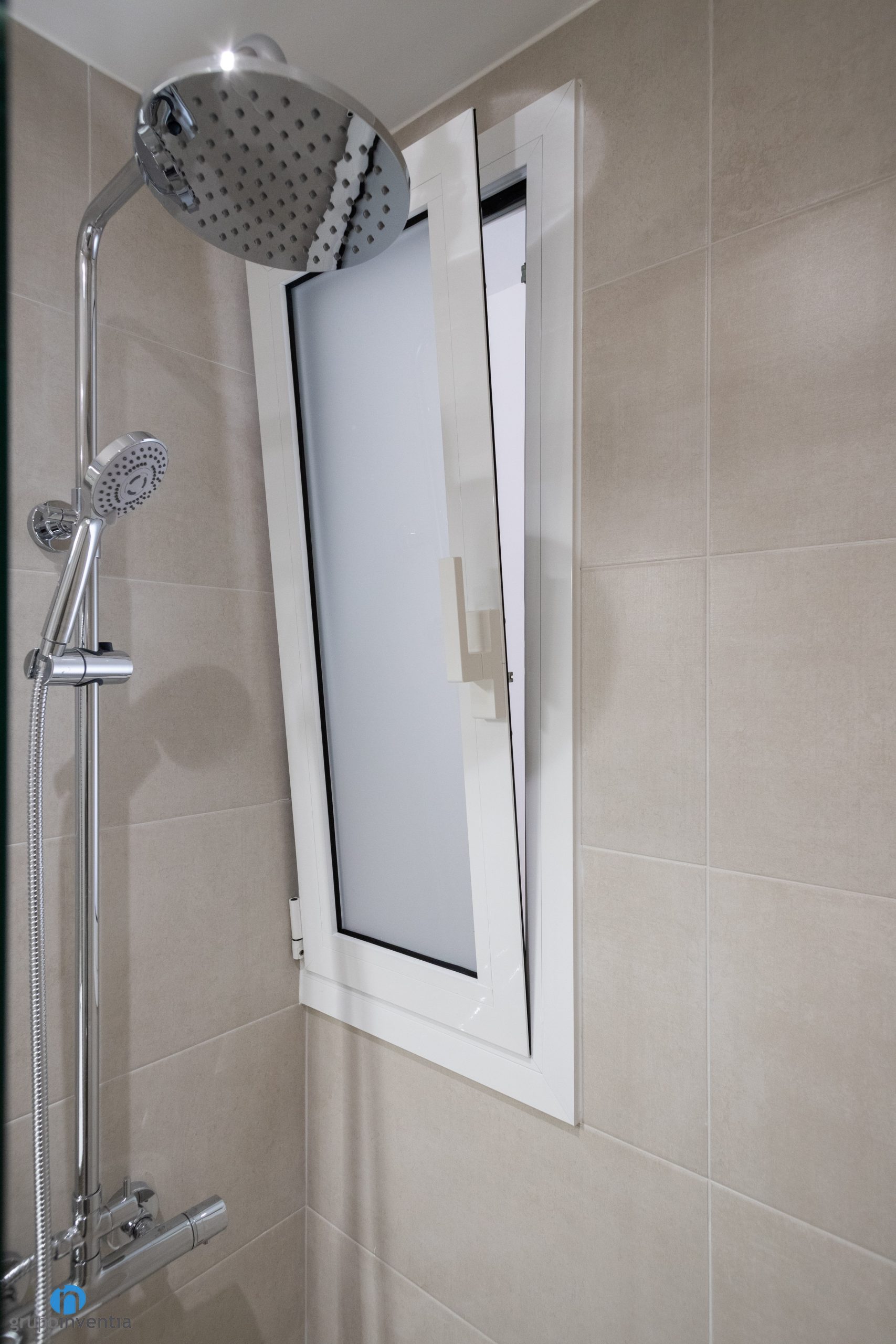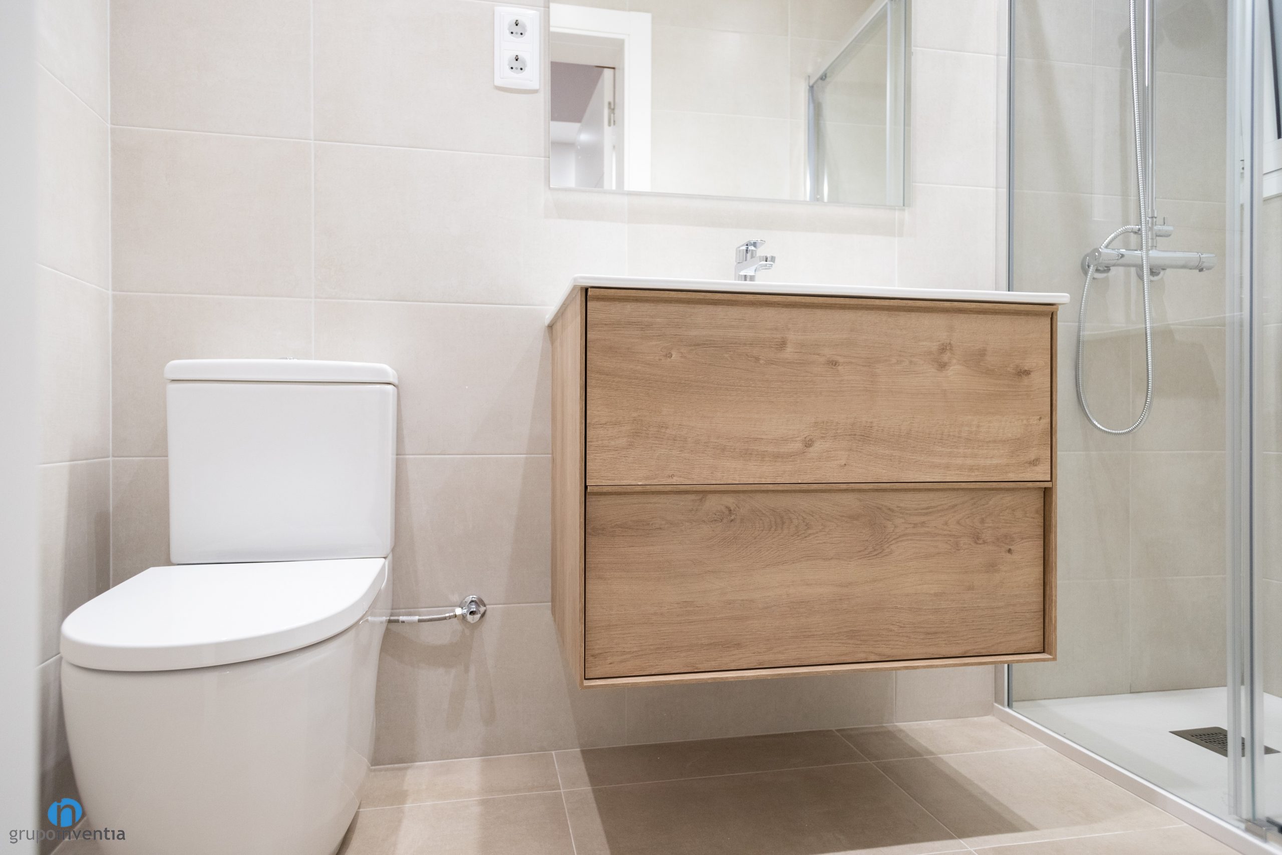A su izquierda se ubica el inodoro y a su derecha la zona de aguas. Para este último elementos se ha instalado un plato de ducha y unas mamparas de puertas correderas que lo protegen. Nuestro catálogo en nuevos elementos para el baño es amplio y variado. Conseguir el cuarto de baño de tus sueños será muy sencillo.