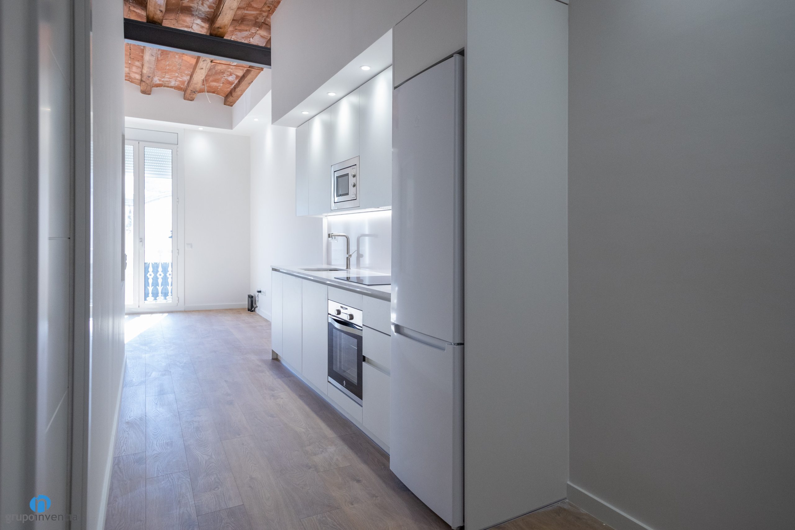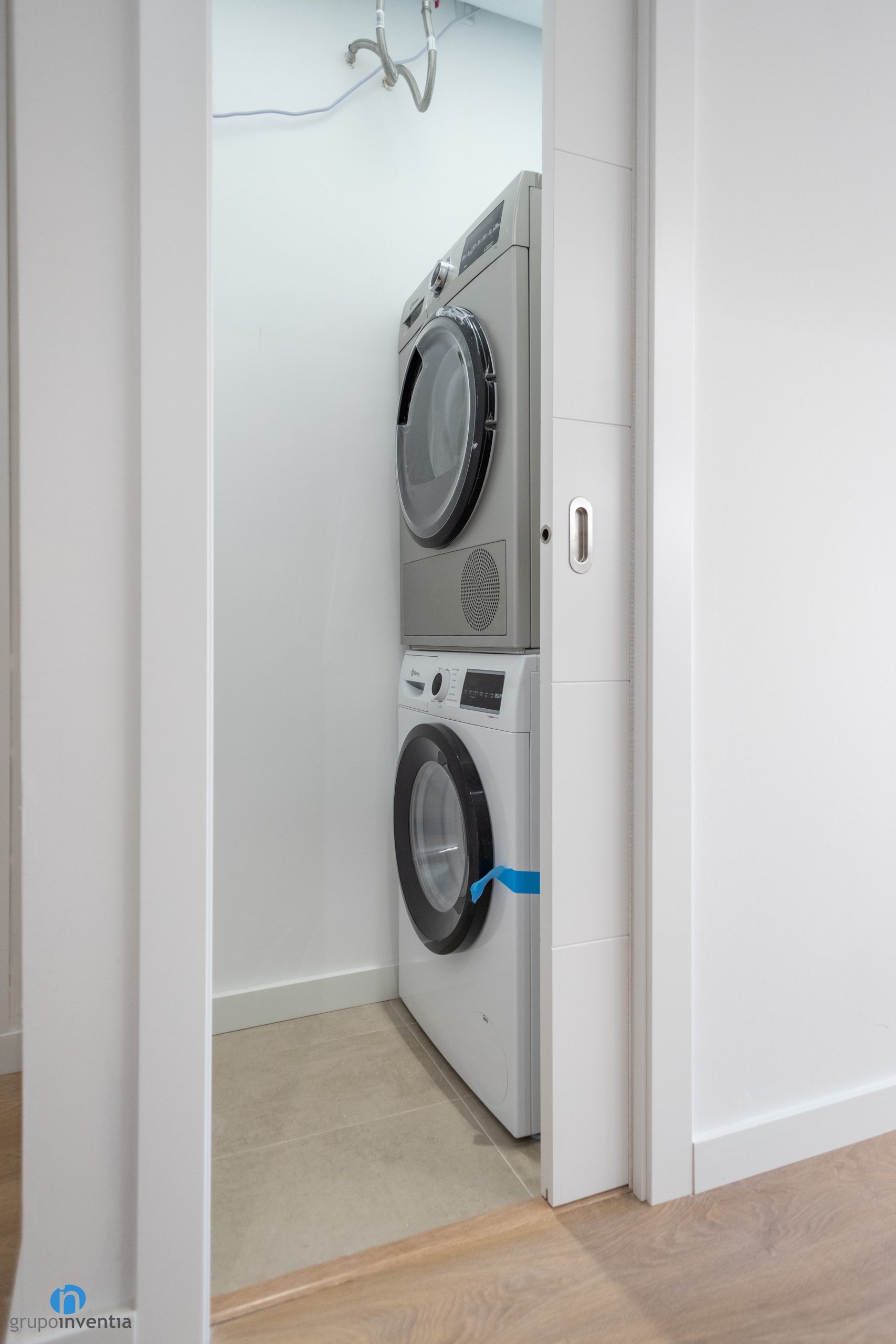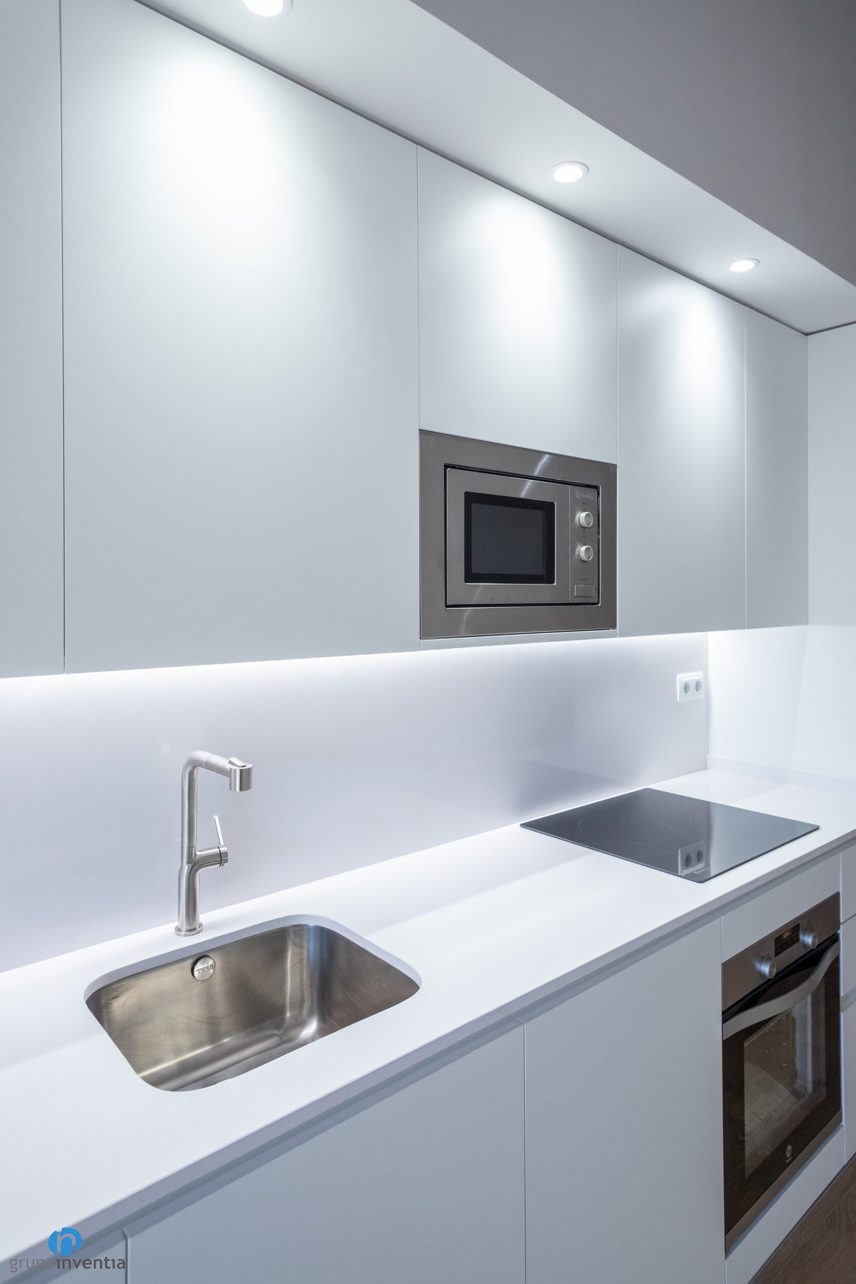 Otro de los espacios estrella en nuestras reformas integrales son las cocinas. Para esta ocasión hemos trabajado con una reforma de cocina abierta y con una distribución lineal. El mueble de cocina mantiene el color blanco y queda muy bien integrado en la nueva imagen global. Sobre todo al contar con capacidad de almacenaje en la parte inferior y superior de la encimera. Estos espacios también se ha utilizado para integrar el horno y el microondas, respectivamente.