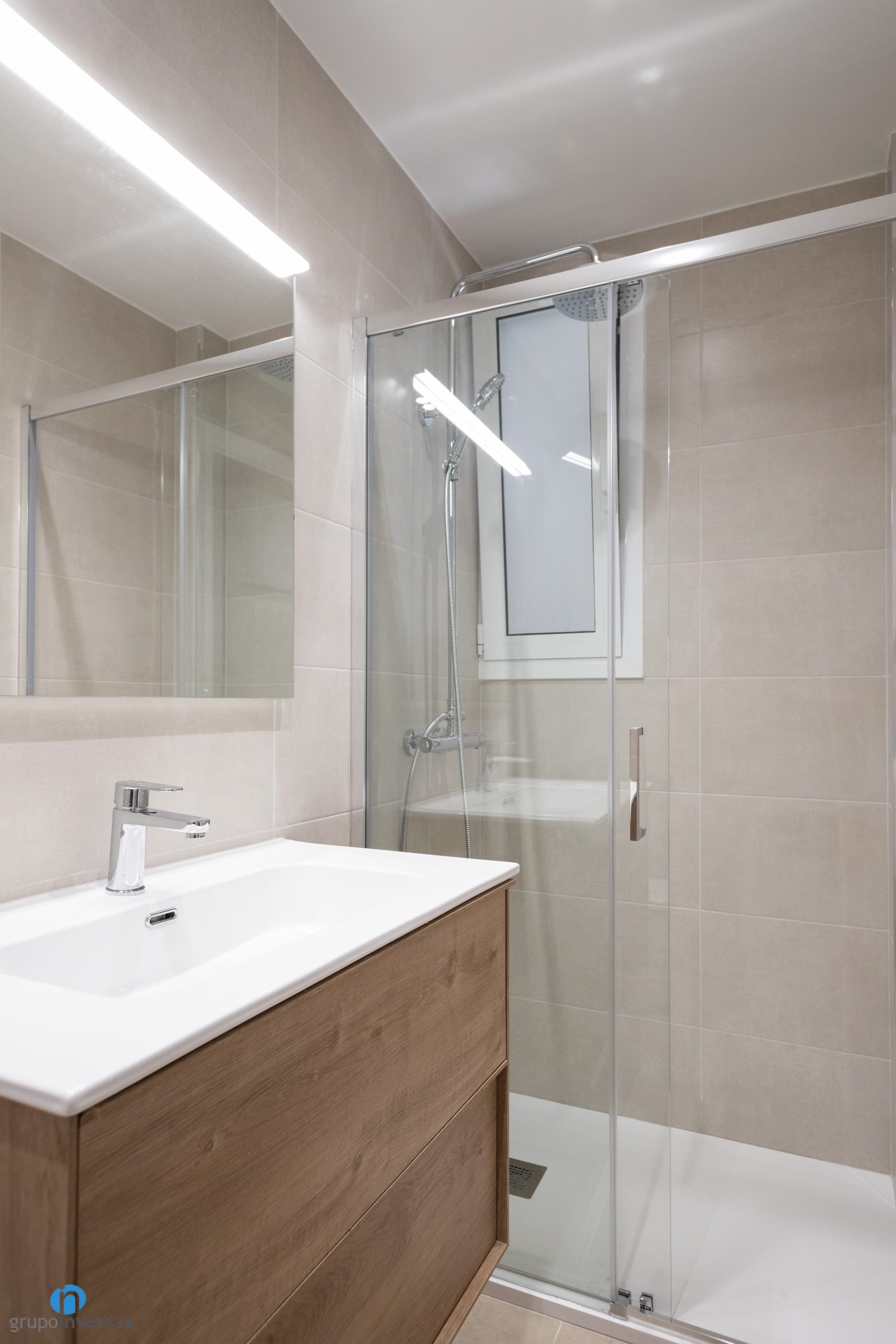 Nuestra oferta en reformas integrales también incluye la mejora y modernización de los cuartos de baño. En este piso de Barcelona hemos reformado la imagen y el equipamiento sanitario de un baño. Ahora dispone de un lavabo flotante con dos cajones para almacenaje productos de higiene y garantizar un orden efectivo en la estancia.