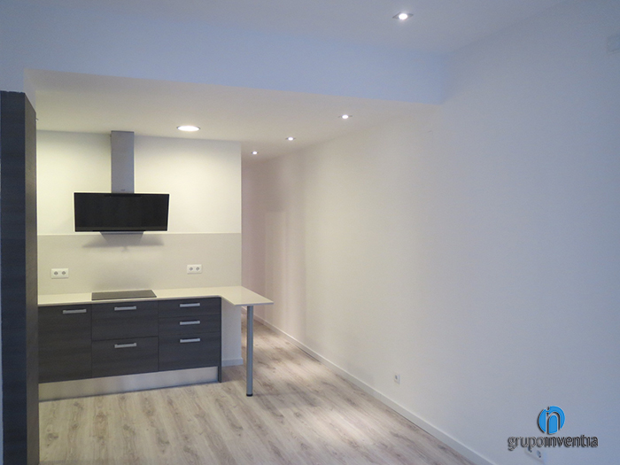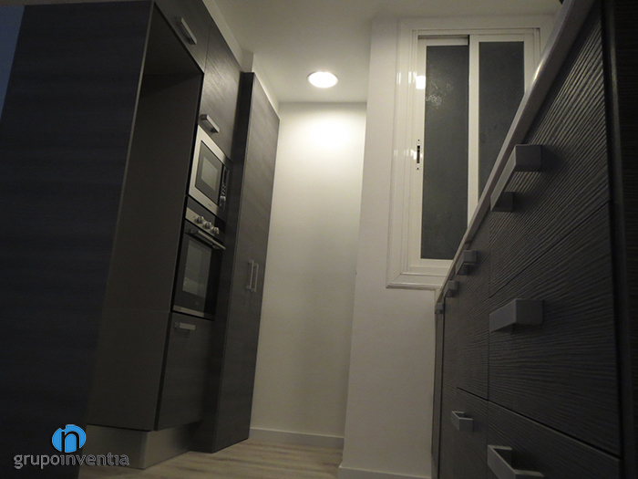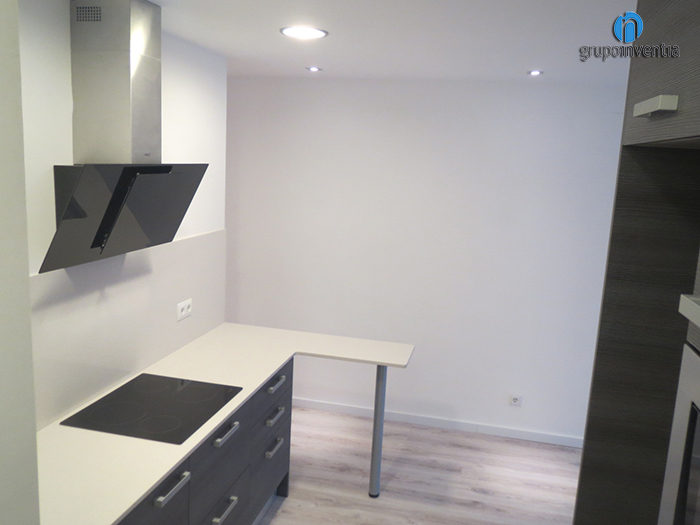Uno de los puntos interesantes de este inmueble era la cocina. Esta, aunque cuenta con su propio espacio, es abierta a la sala principal, por lo que se tuvo que trabajar para conseguir un diseño de cocina al que no le supusiera ningún problema esta característica. Para ello, se pensó en una distribución en dos frentes, en el que uno de los lados estaría destinado a los electrodomésticos y el otro a la zona de trabajo. En este último espacio, se instaló una encimera alargada en la que se colocó un fregadero y una placa vitrocerámica. Lo más destacable de la encimera, aparte de su tamaño, es que se curva al final, consiguiendo así una barra de cocina en la que poder realizar cualquier tarea o ingesta diaria.