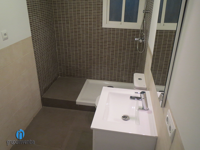 Por lo que respecta a la reforma de baño, se aprovechó todo el espacio disponible para conseguir un espacio práctico y funcional sin restar movilidad a su usuario. En el renovado cuarto de baño se instaló un lavabo con armario incorporado, un inodoro y un plato de ducha, envueltos en azulejos beige hasta media altura en las paredes y un suelo amarronado que se une con el mosaico de la pared de la ducha. Con esta precisa combinación de colores, se consigue crear sensación de amplitud y profundidad, haciendo del baño un lugar menos angosto.
