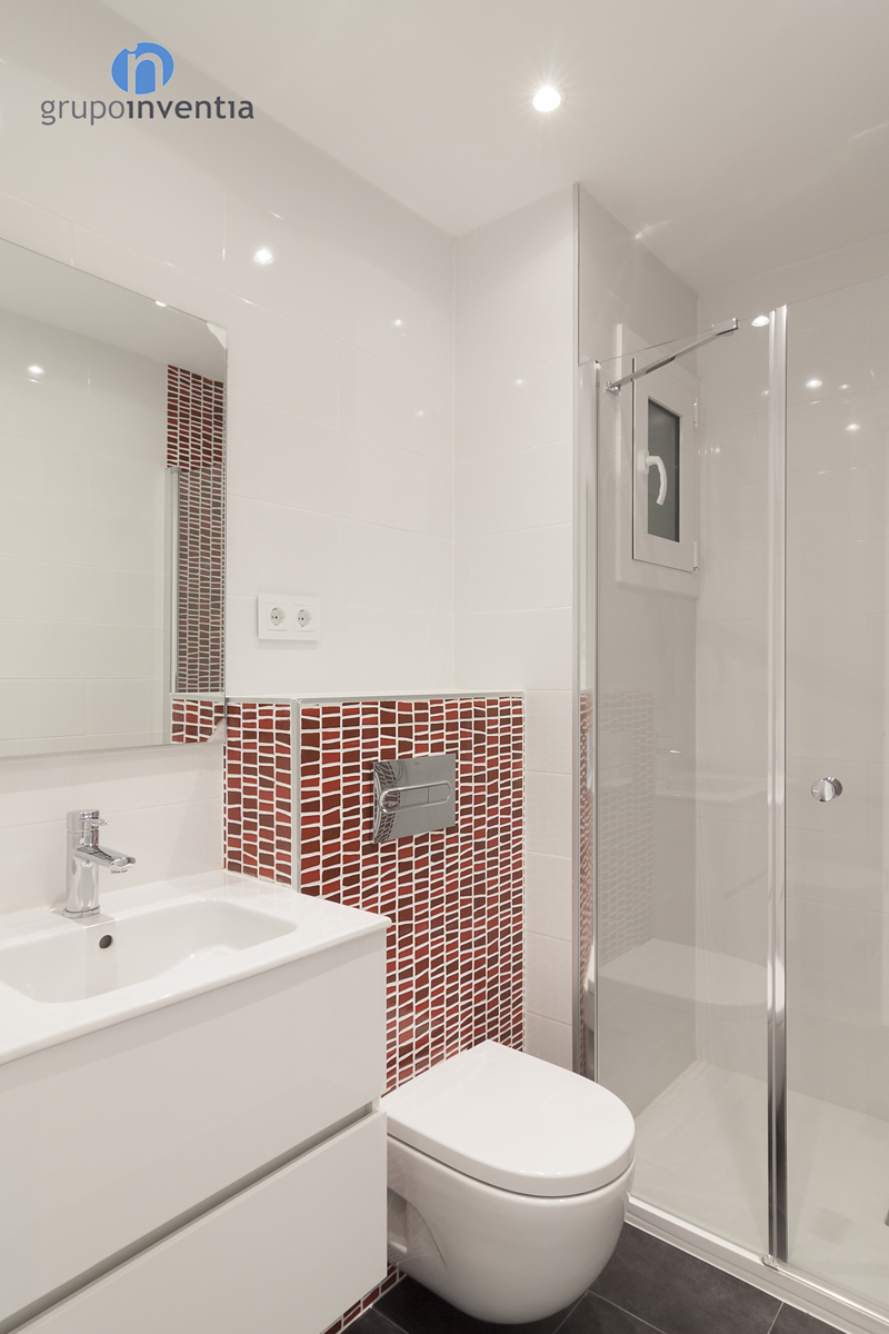 En la reforma de baño se siguió el patrón de diseño de la vivienda, en el que el color blanco es el gran protagonista. Sin embargo, en esta estancia, además de colocar un pavimento de un tono más oscuro, la pared en la que está colocado en inodoro se alicató hasta media altura con azulejos en mosaico de color rojo, proporcionando un toque de color muy agradable.