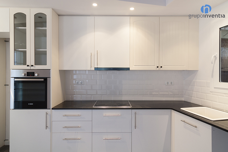 Para la reforma de cocina, que era abierta al comedor, se pensó en una distribución en forma de L, ya que de este modo todos los elementos quedarían perfectamente organizados. En el extremo de la parte más alargada de la encimera, se colocó un hueco a medida para la nevera, además de encastrar el horno.