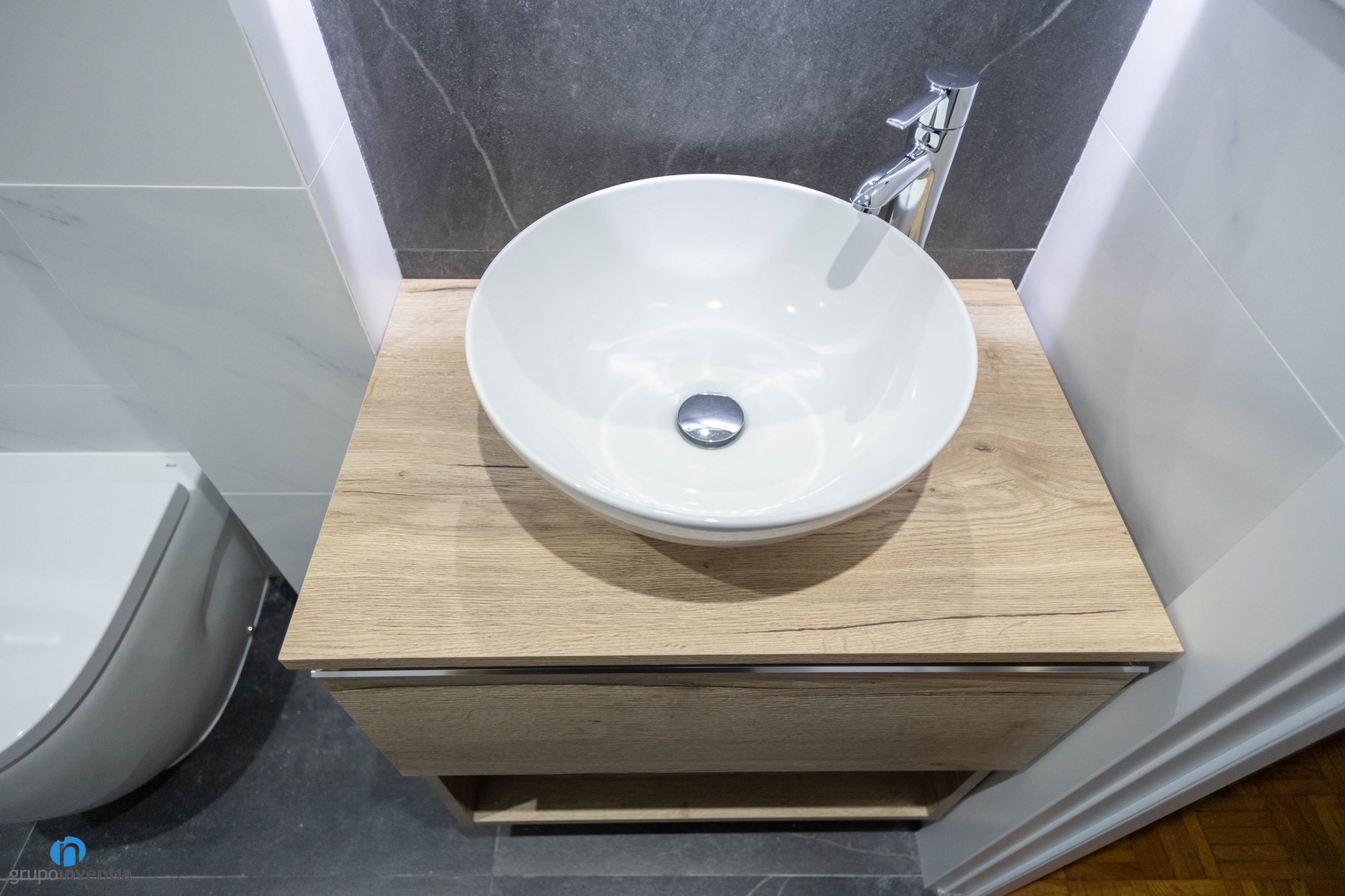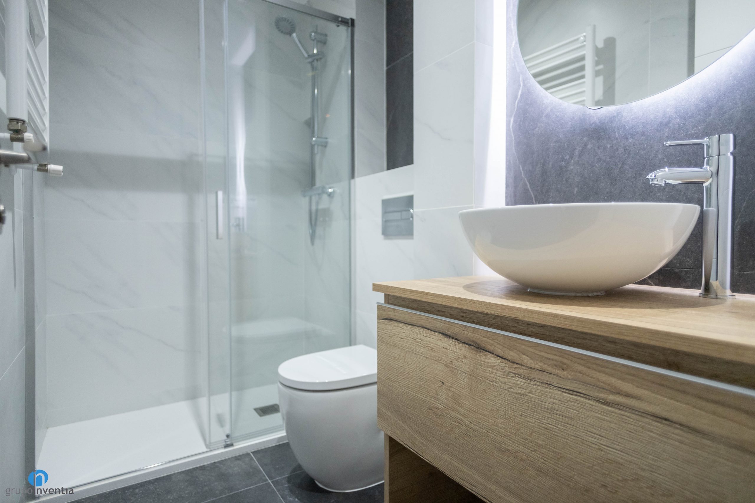 Tras la reforma integral el cuarto de baño cuenta con un equipamiento sanitario de tres piezas moderno y funcional. A la derecha de la entrada se coloca un mueble de baño flotante con acabado en madera. Sobre él descansa un lavabo de diseño redondo con grifería de acabado en plata. Le sigue un inodoro con la cisterna oculta en la pared. Sin duda un elemento que genera mayor espacio visual en el baño. Por último se ha colocado un plato de ducha que queda protegido por unas mamparas de puertas correderas.