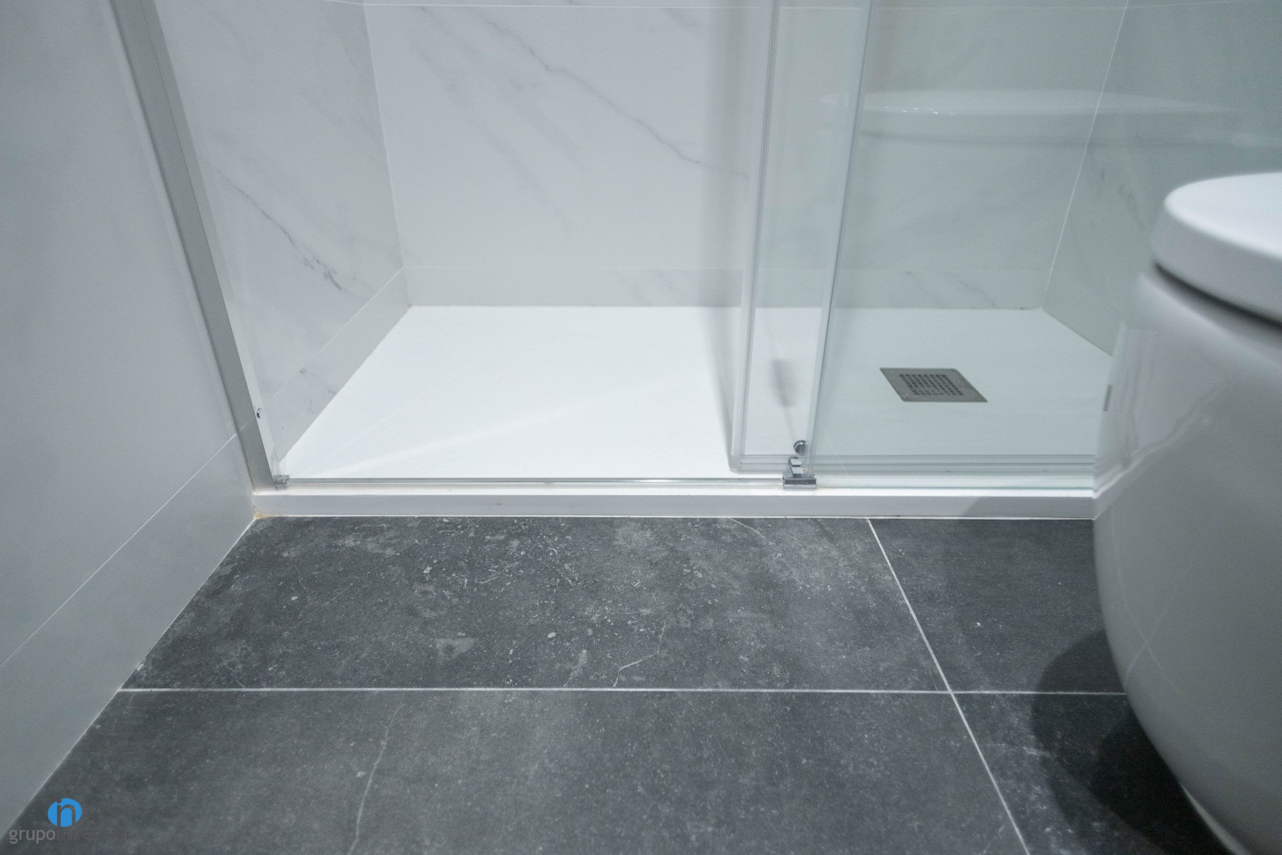 La mayoría de las paredes se han alicatado con baldosas de color blanco con un acabado que imita el mármol. En cambio la pared del lavabo se ha alicatado con baldosas grises con un acabado en piedra. Una buena opción en cuanto a diseño interior, ya que combina con las nuevas baldosas que se han colocado. El suelo del baño es de un material resistente, duradero y apto para estancias propensas a generar humedad.