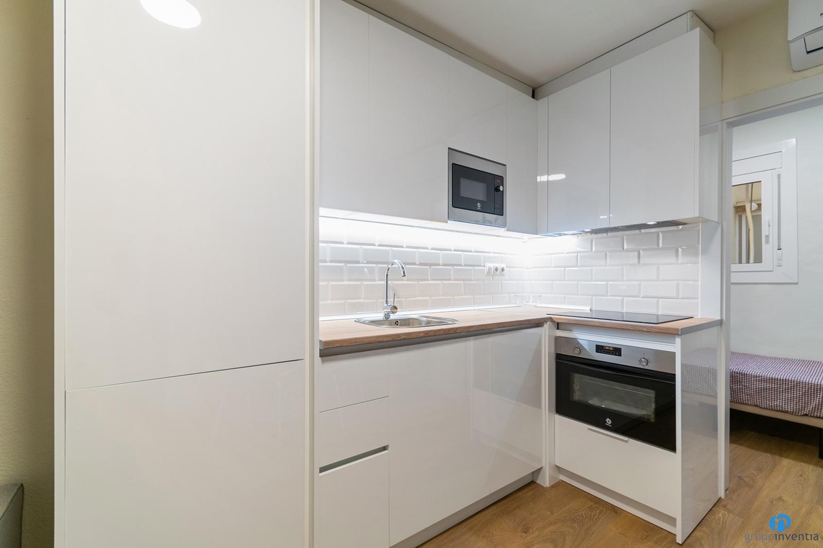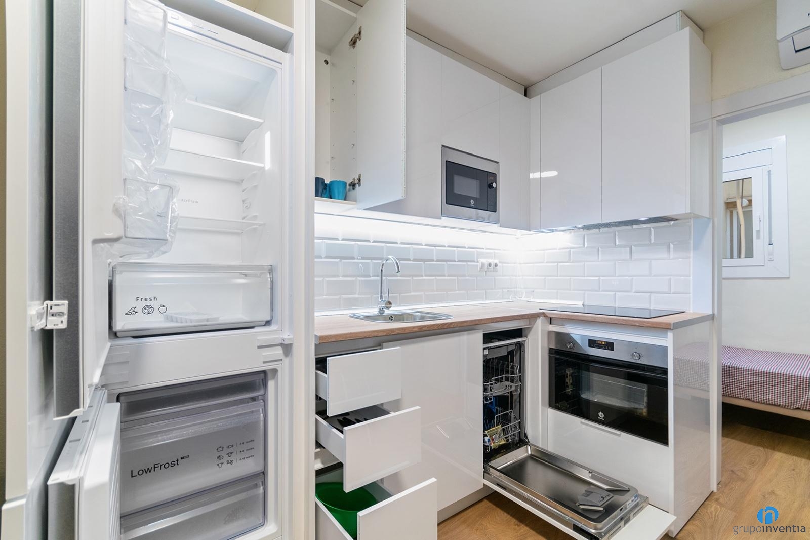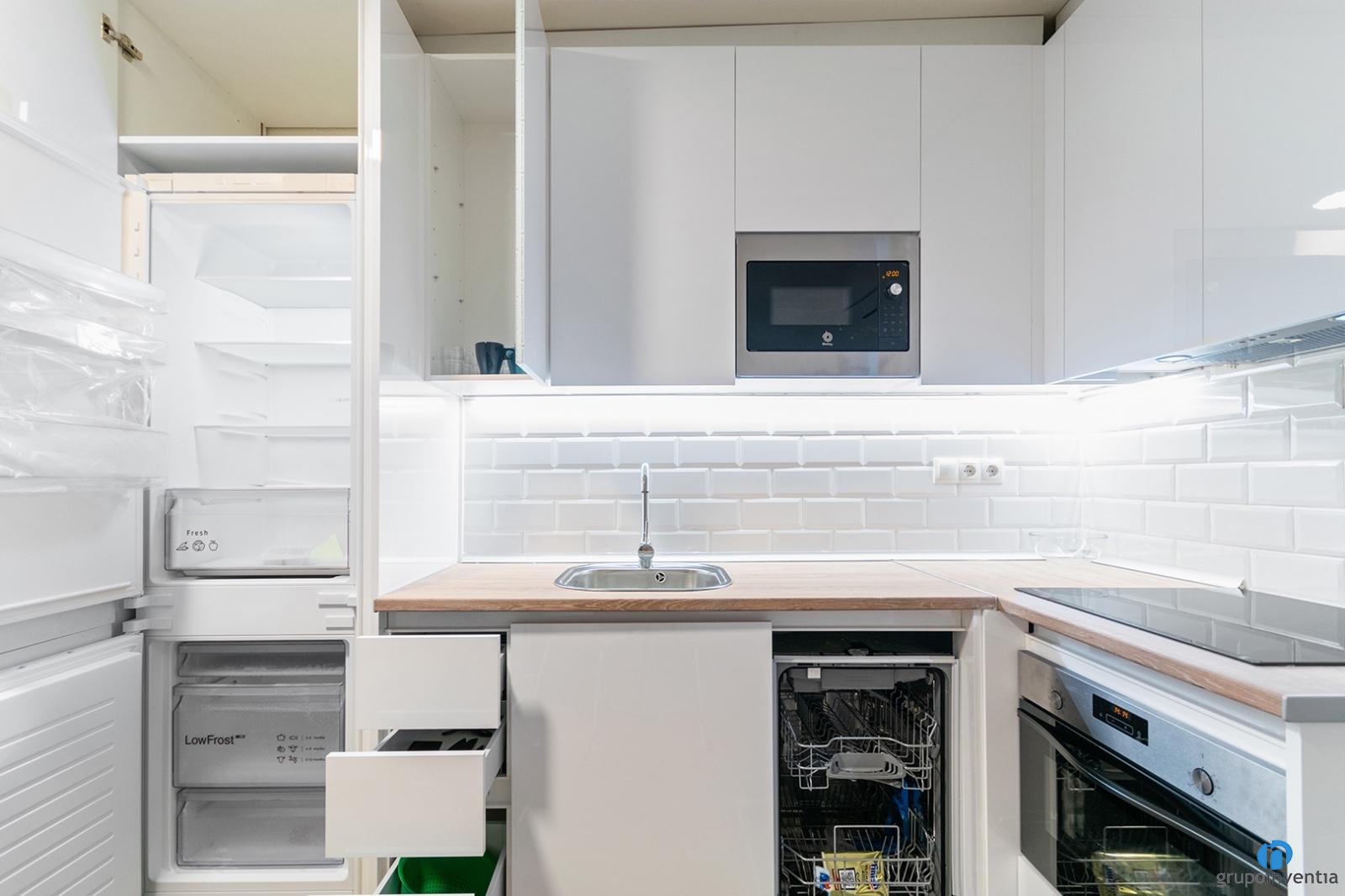 En el extremo izquierdo encontramos la nevera, camuflada por las mismas puertas del armario de cocina. Seguidamente nace la encimera en forma de L, equipada con un fregadero y una placa de inducción acompañada por una campana extractora. Además, ofrece una superficie amplia de apoyo y de trabajo.