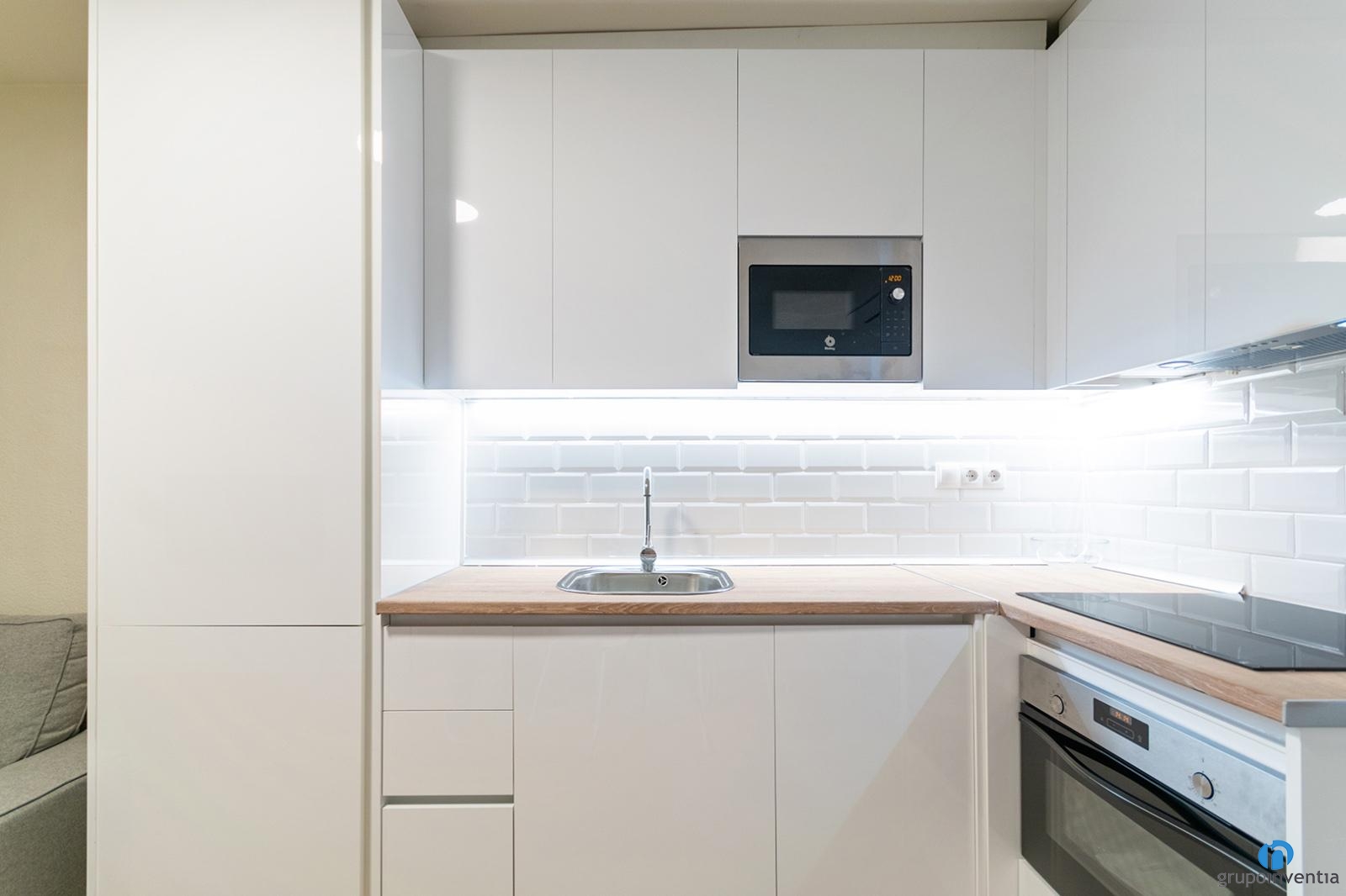 La nueva cocina es abierta y tiene una distribución en forma de L. De este modo permite una movilidad excelente y cada elemento se ubica en el lugar más funcional. El mueble de cocina es de color blanco y se integra con la imagen global de la vivienda. Se combina con encimeras de madera a juego con el parquet y baldosas biseladas de color blanco.