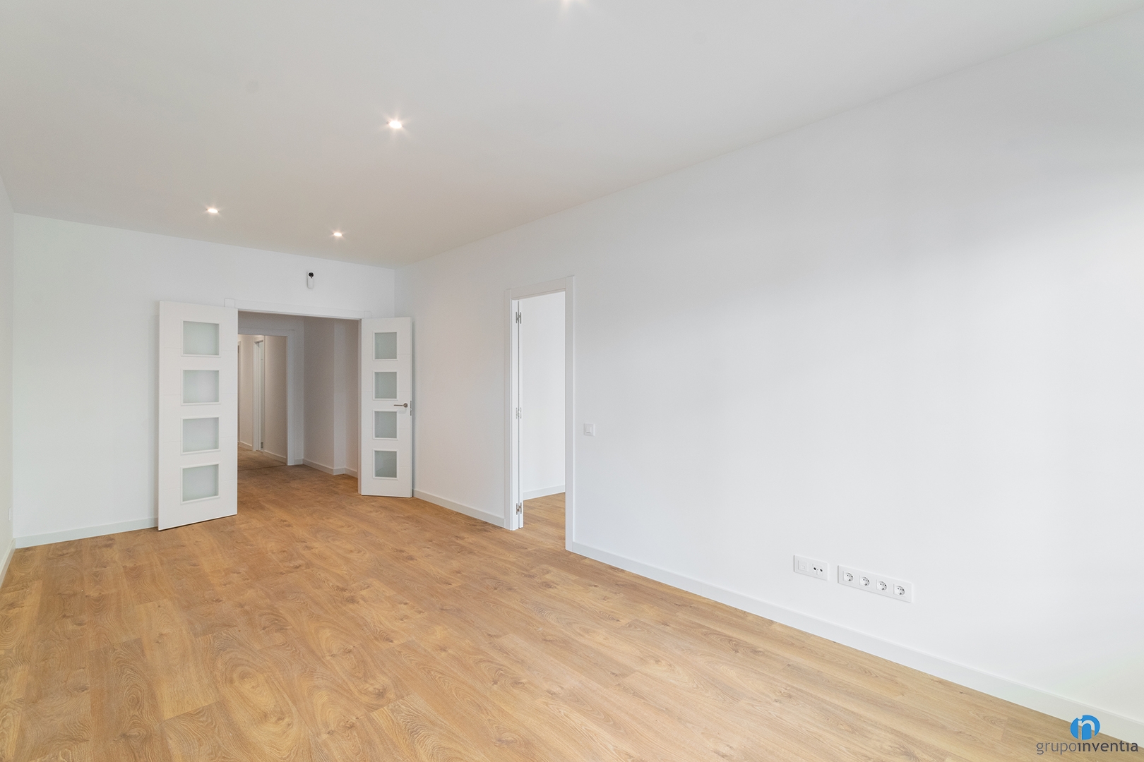 Las paredes se han pintado de blanco. El mismo color de los nuevos marcos y puertas. Combina a la perfección con el pavimento de parquet que hemos instalado en zonas comunes y dormitorios. Ahora tiene el aspecto de un verdadero hogar.