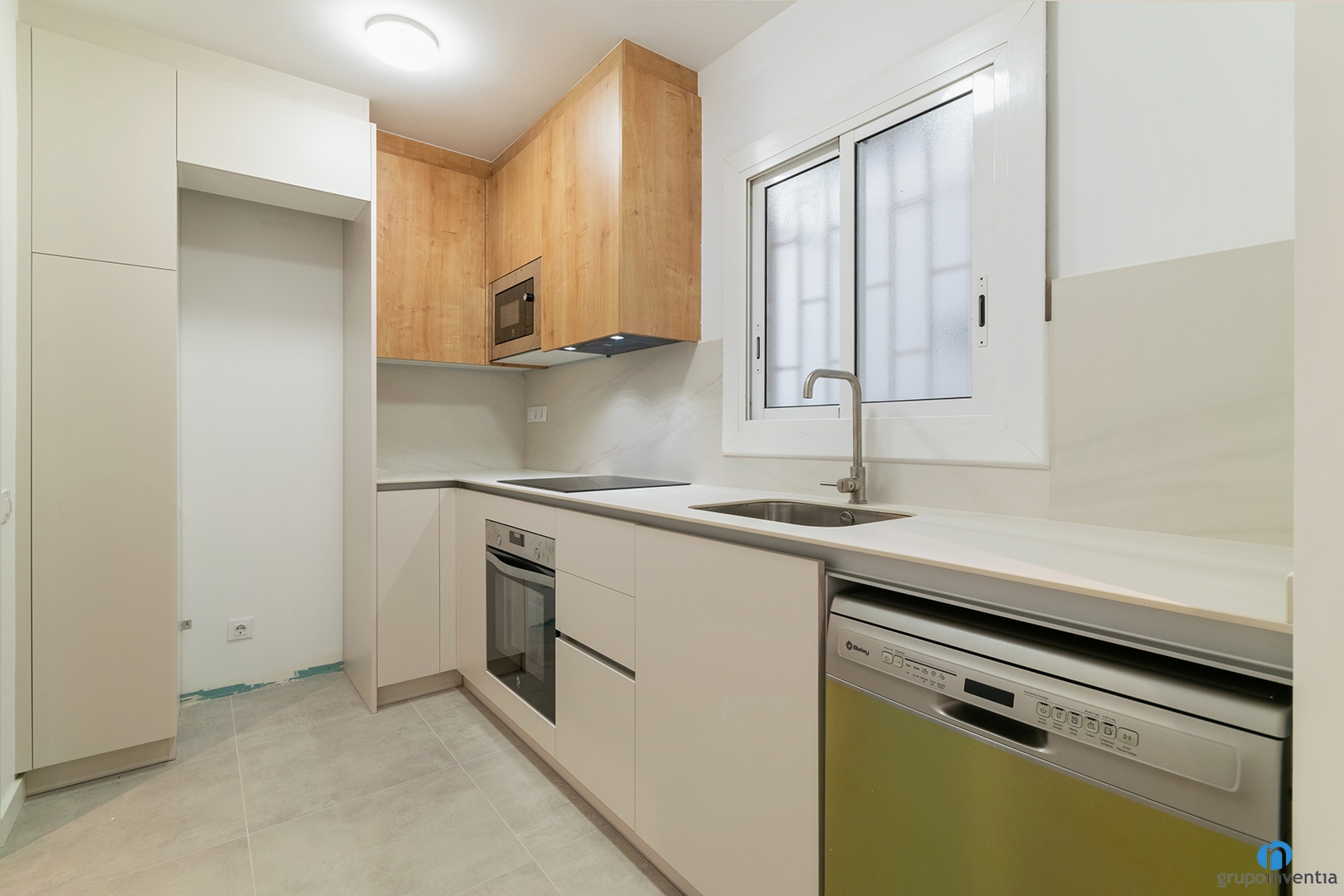El mueble de cocina también se utiliza para integrar el horno, el lavavajillas y el microondas. Sobre la encimera encontramos una placa de cocción y un fregadero de un seno. Todo ello envuelto por una imagen en tonos neutros y acabados en madera. Hemos conseguido una reforma de cocina muy funcional.