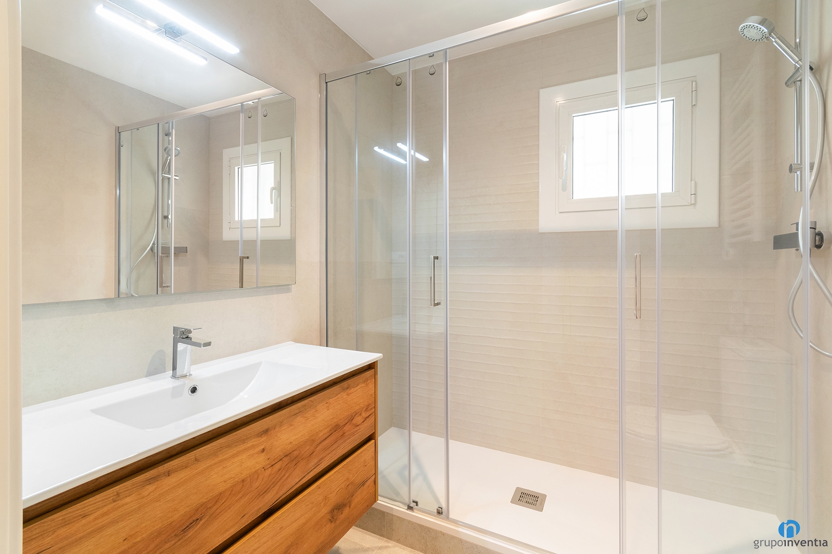 Dentro de esta reforma integral en Barcelona nos hemos encargado de renovar dos cuartos de baño. Ahora la vivienda cuenta con dos espacios de aseo totalmente equipados y con un ambiente muy fresco. Hemos alicatado las paredes con azulejos beige y hemos instalado muebles de baño con acabados en madera.
