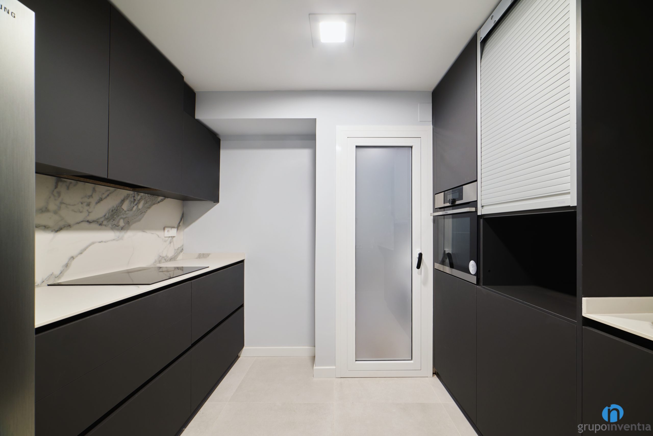 En el extremo del lado izquierdo hemos colocado una nevera de doble puerta. Acto seguido nace una encimera equipada con una placa vitrocerámica. Dispone de capacidad de almacenaje con varios armarios y cajones tanto en la parte inferior como superior. Todo ello en una combinación con mueble de cocina negro y encimera de color blanco.