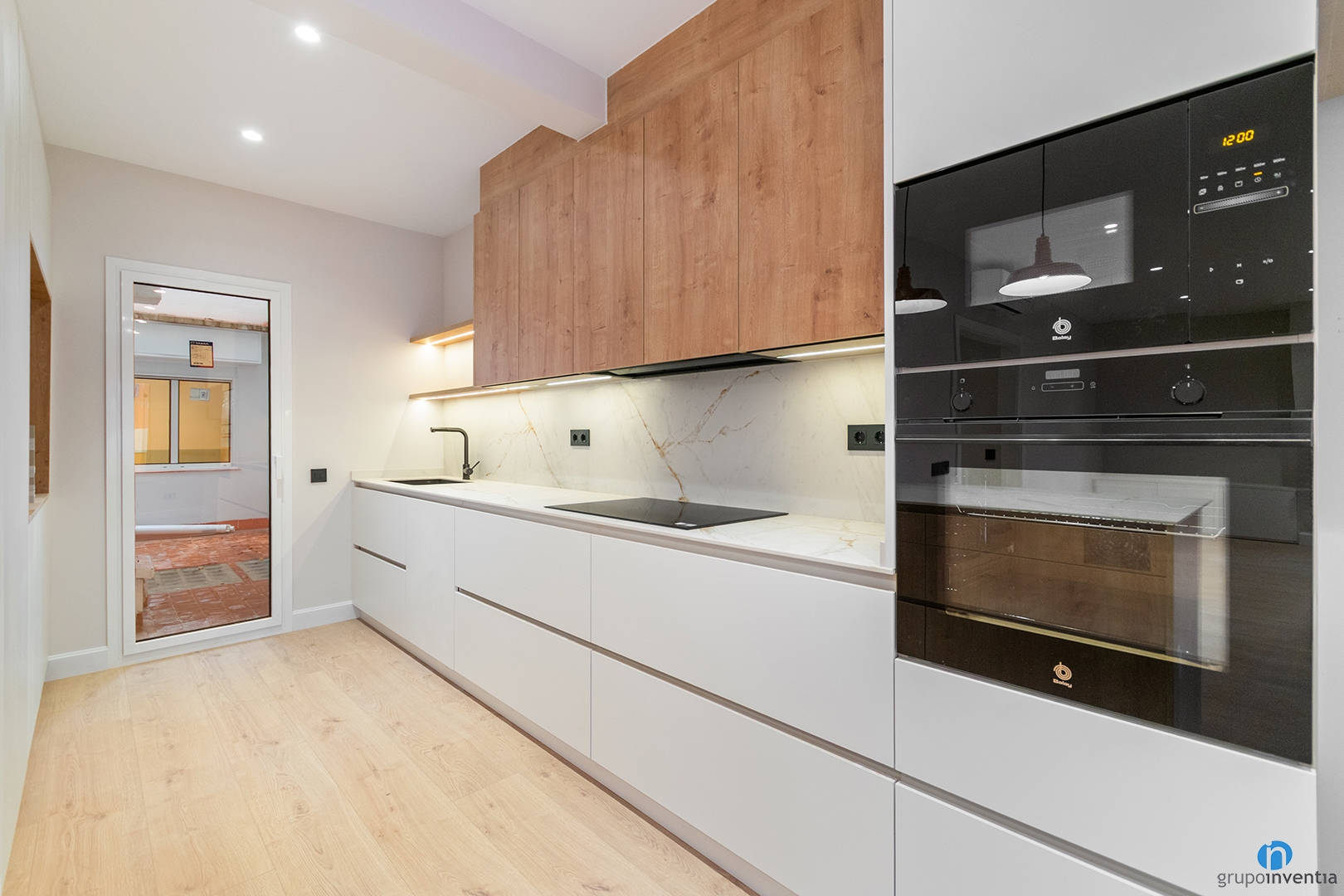 La cocina cuenta con una gran capacidad de almacenaje mediante armarios y cajones. Los muebles inferiores son de color blanco y aportan luminosidad. Los armarios superiores presentan un acabado en madera natural, aportando calidez al conjunto.