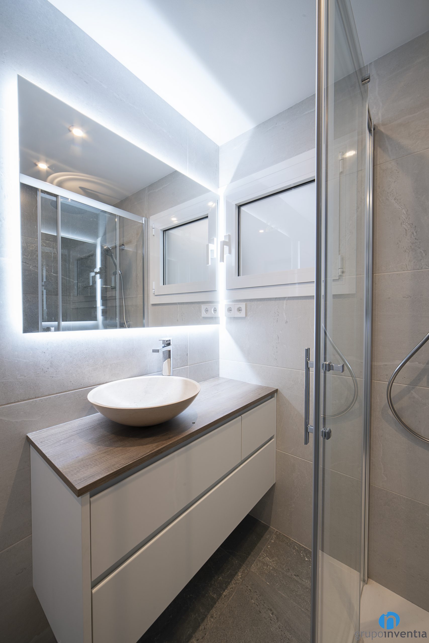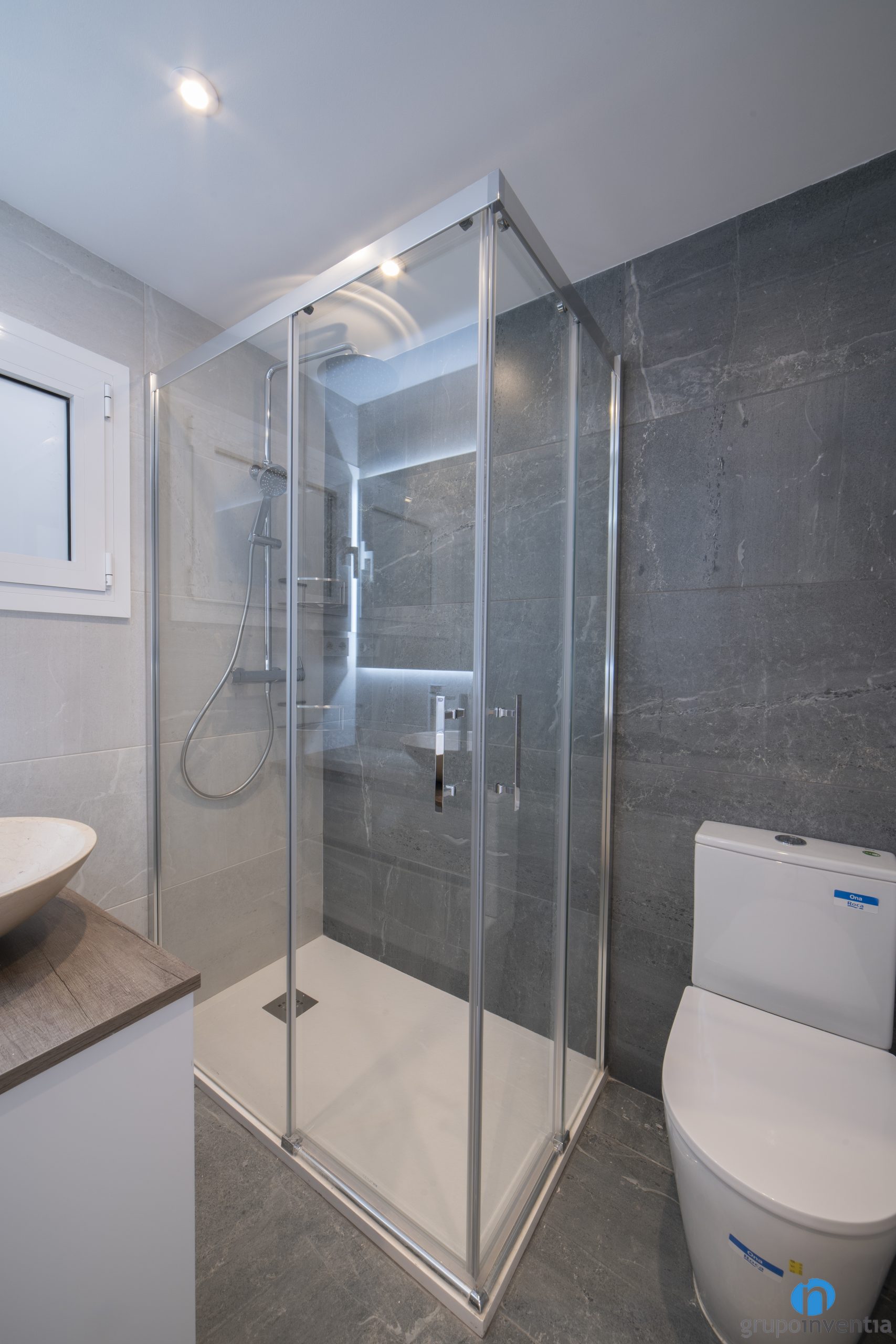 El cuarto de baño cuenta con un nuevo lavabo con mueble de almacenaje, un inodoro y un plato de ducha. La zona de aguas queda protegida por unas mamparas de puertas correderas transparentes. De este modo no se le resta espacio visual al aseo y el resto del espacio que protegido de salpicaduras.