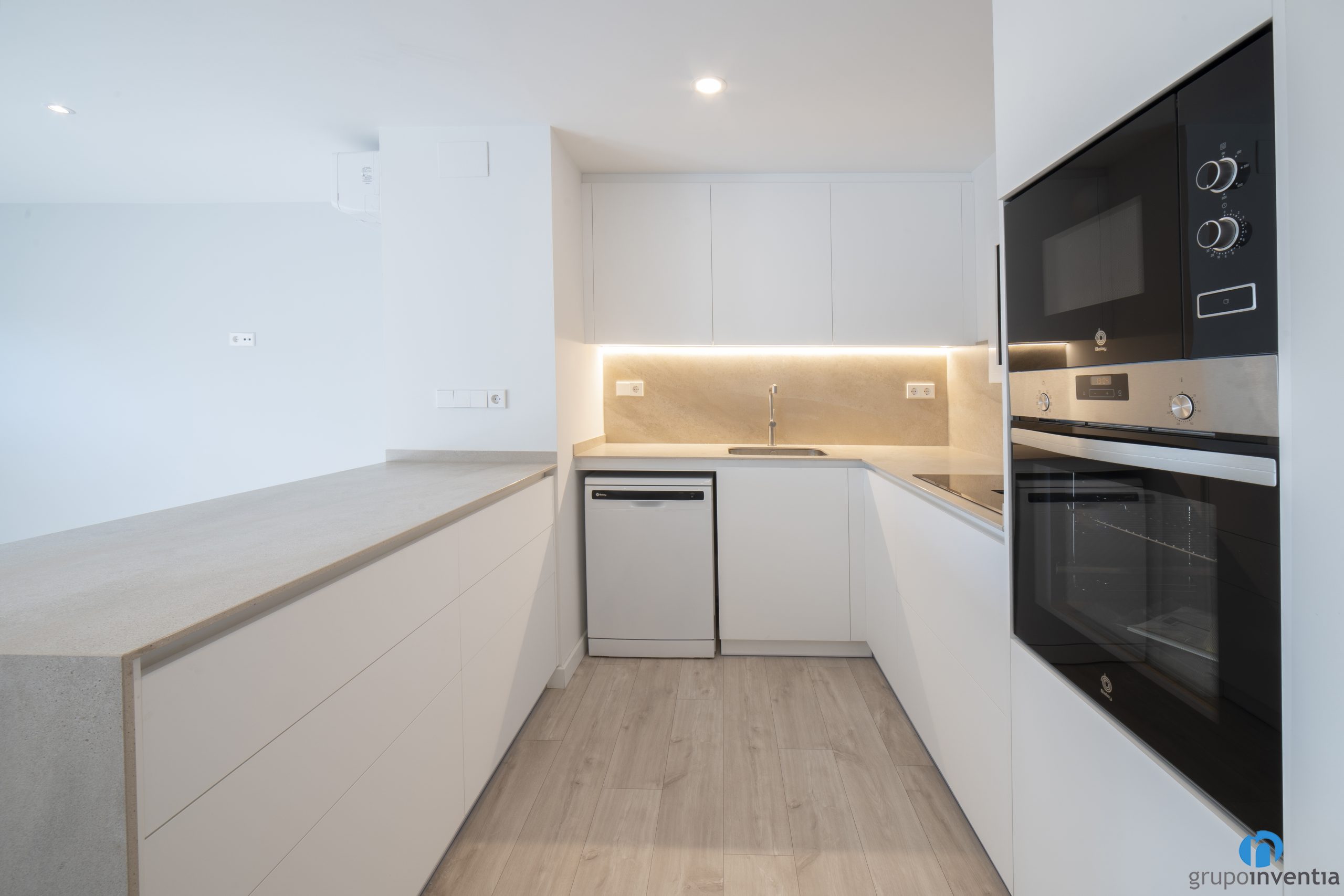 La parte abierta la ocupa una barra de cocina con doble función. Por un lado, amplía la superficie de apoyo y de trabajo en la cocina. Del mismo modo también puede utilizarse como barra de desayuno. Todo ello en un ambiente neutro que sigue la línea decorativa del resto de la vivienda.