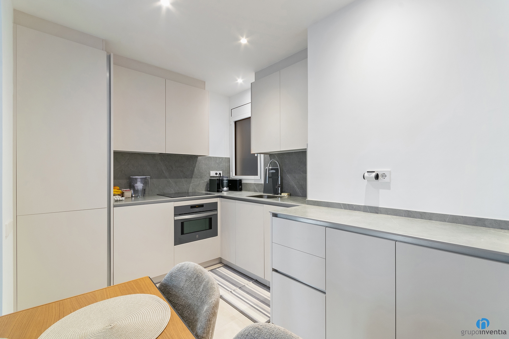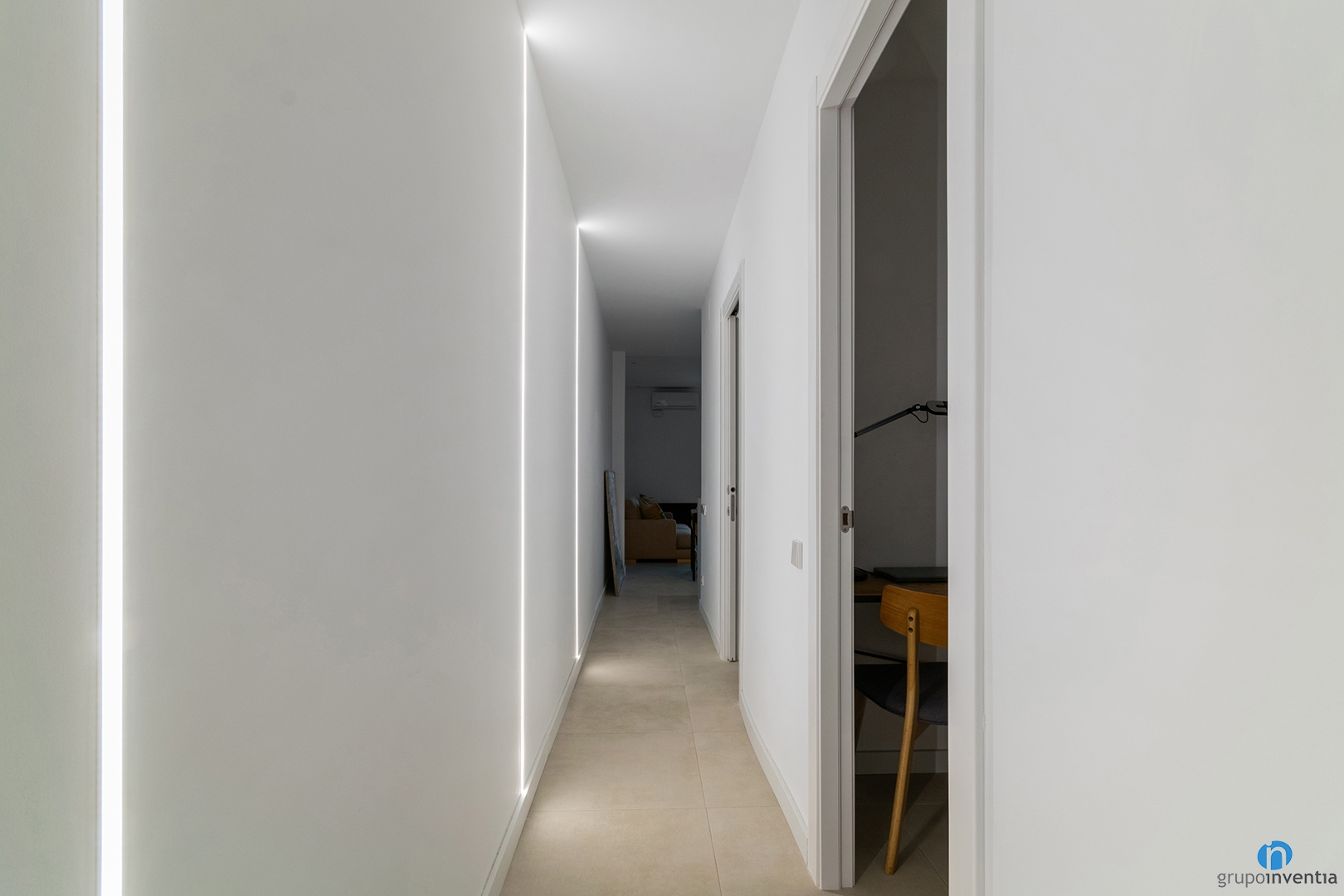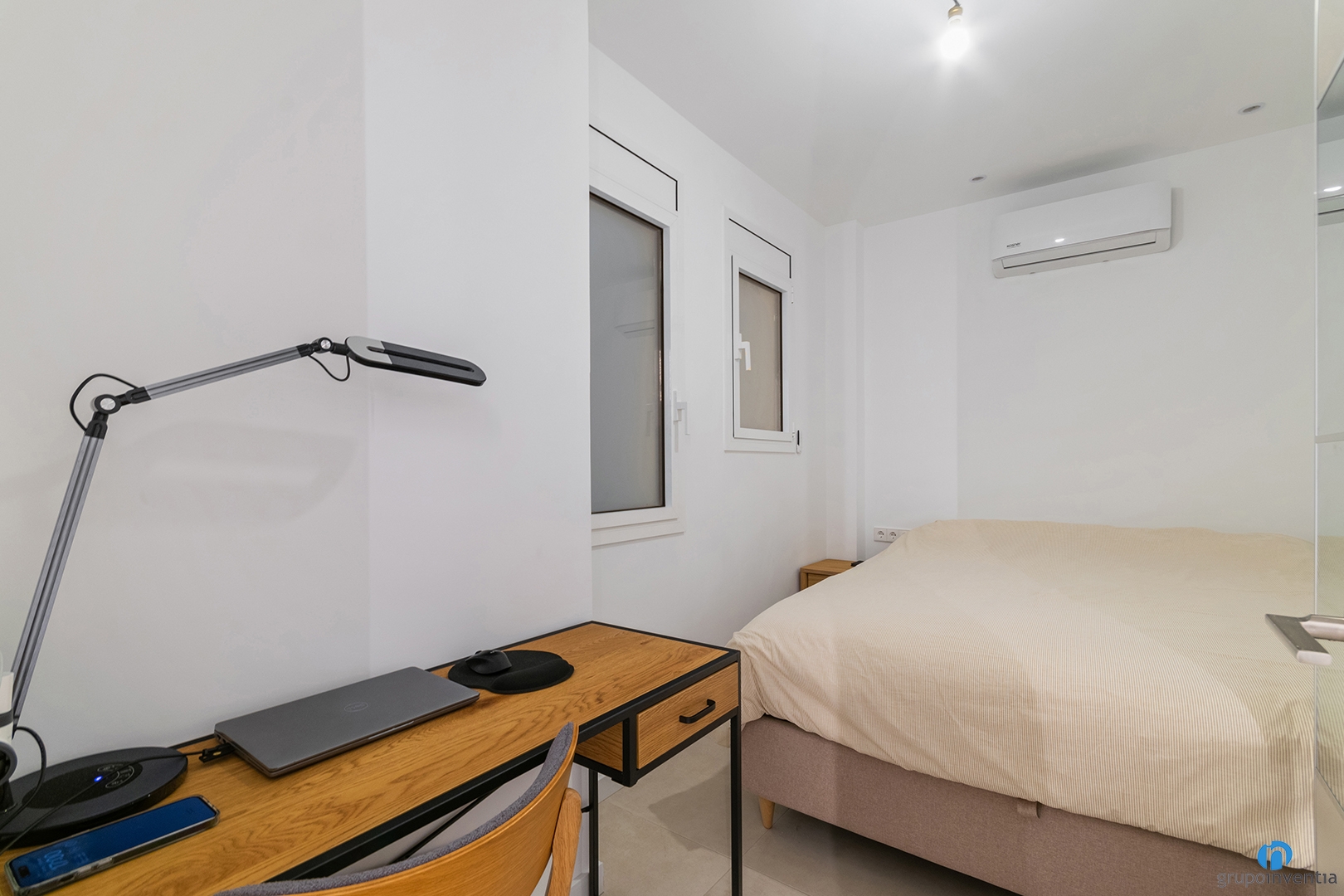 Se combina con un suelo de baldosas en tono beige que aporta un toque cálido al nuevo interiorismo. En la distribución interior también quedan bien definidos los espacios con un mobiliario funcional. Los dormitorios siguen la estética general y se presentan como un espacio ideal para el descanso.