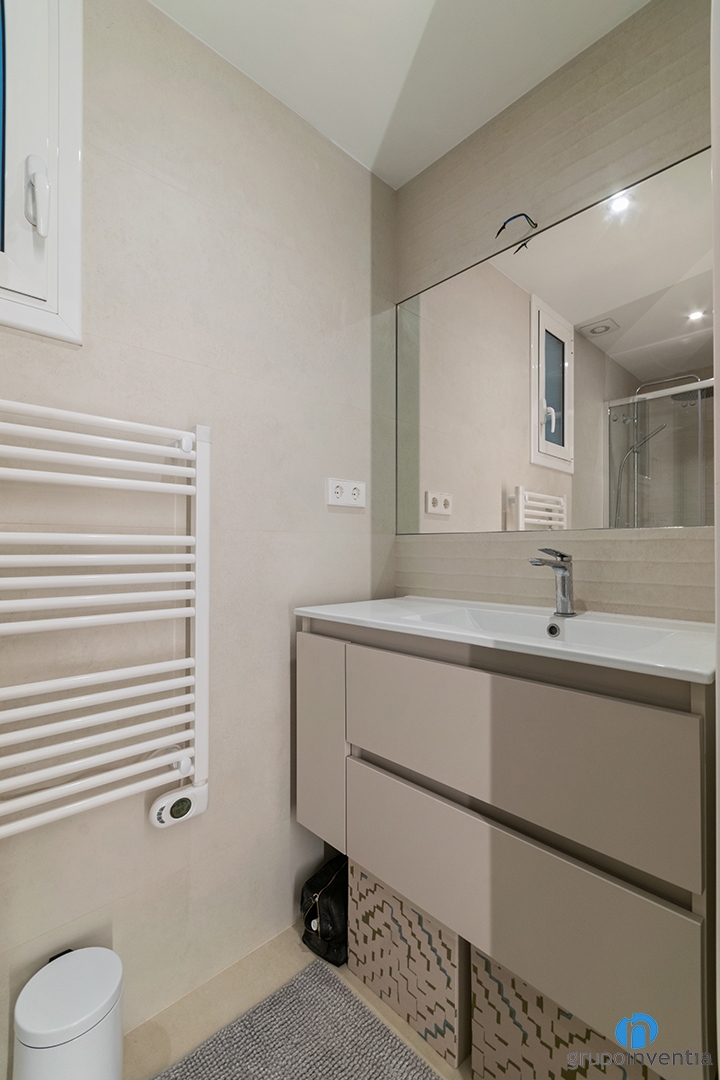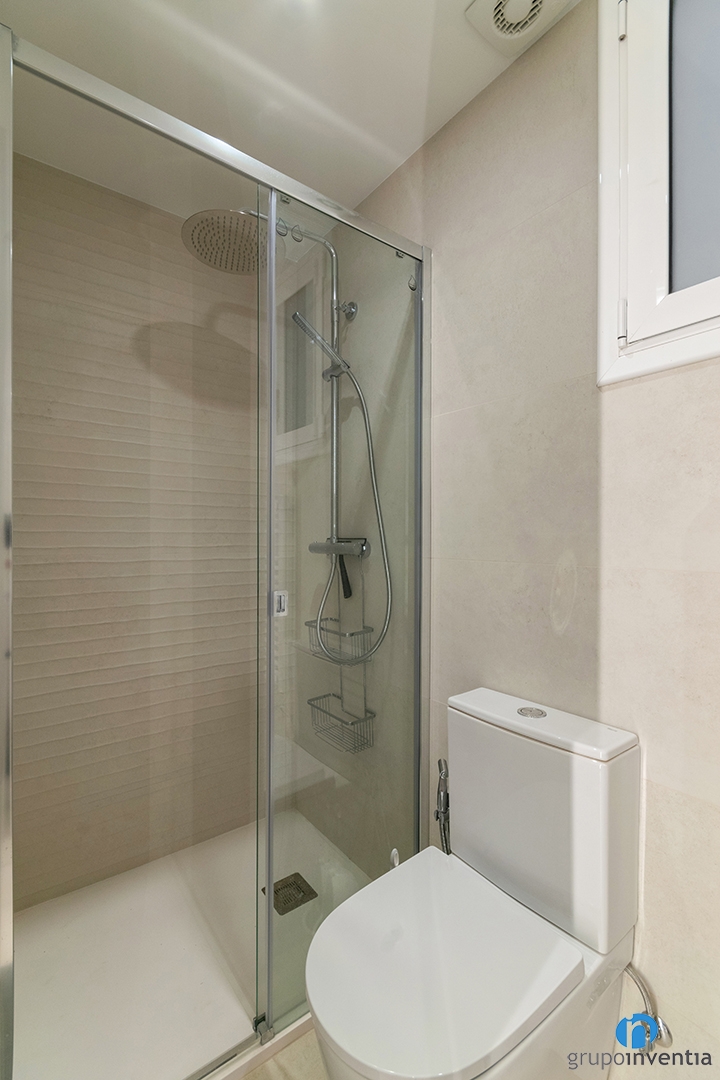 El cuarto de baño está listo para ofrecer las mejores prestaciones en su uso. Cuenta con un lavabo con mueble incorporado, un inodoro y un plato de ducha. En líneas generales una reforma de baño muy completa y que ofrece un uso funcional.