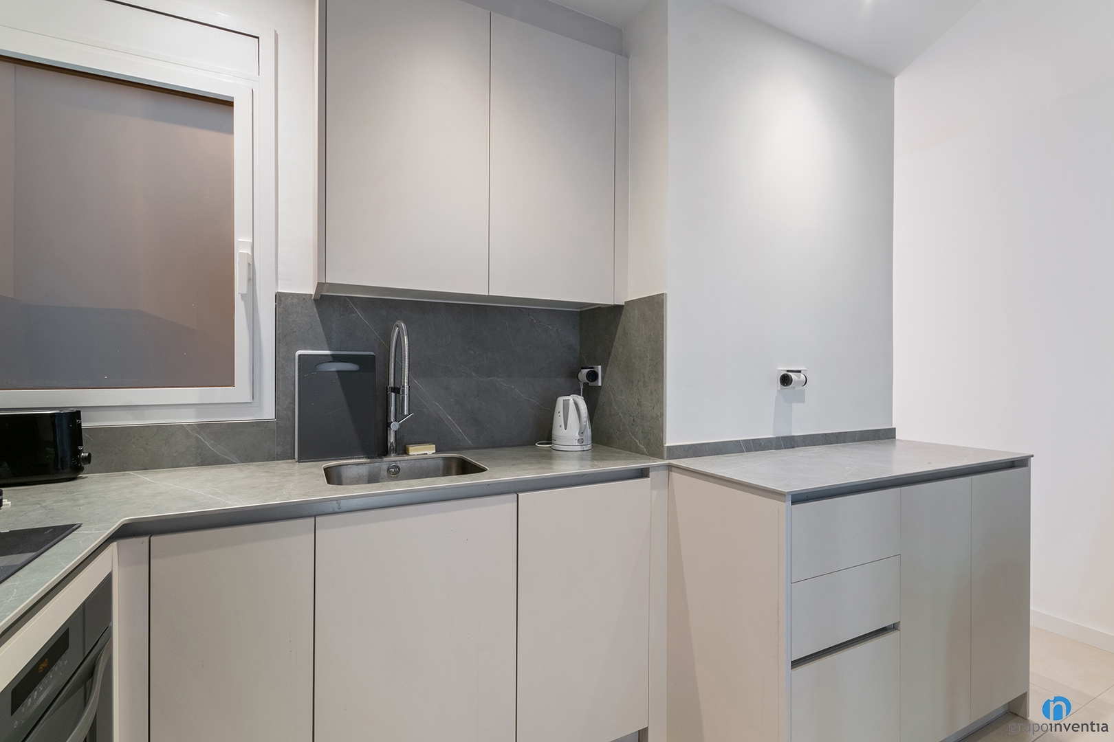 En el siguiente tramo de encimera hemos instalado el fregadero y también hay espacio para colocar pequeños electrodomésticos. La siguiente encimera está destinada a superficie de apoyo y de trabajo. Además, amplia el almacenaje de esta reforma de cocina con varios cajones y armarios.
