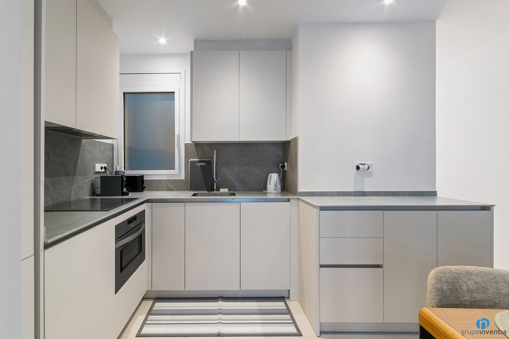 La reforma de cocina es abierta y está distribuida en forma de L. En el extremo del lado izquierdo hemos colocado la nevera. A partir de ahí nace el primer tramo de encimera, equipado con una placa de inducción. Tanto en la parte superior como inferior cuenta con capacidad de almacenaje y también hemos integrado el horno.