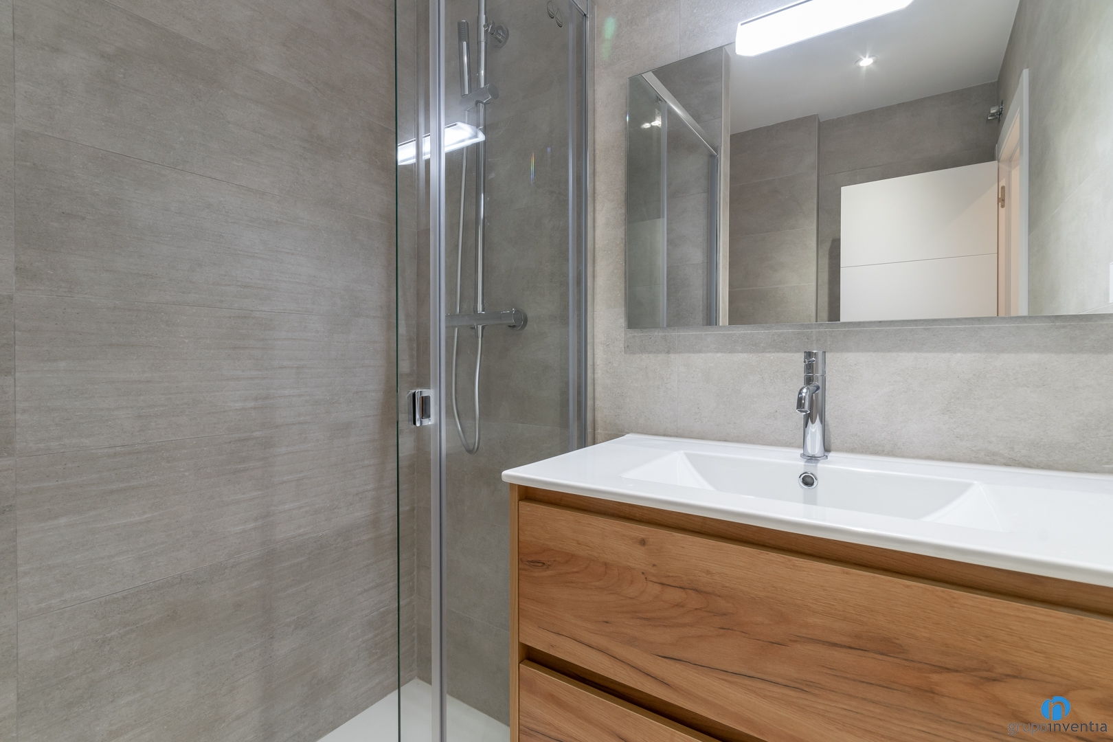Para esta reforma de baño también hemos trabajado en una nueva imagen. Ahora las paredes y el pavimento están cubiertos con baldosas de tono piedra. Generan un ambiente fresco y se potencia la sensación de amplitud. Gracias a esta imagen global destaca con creces el mueble de baño con acabado en madera oscura.