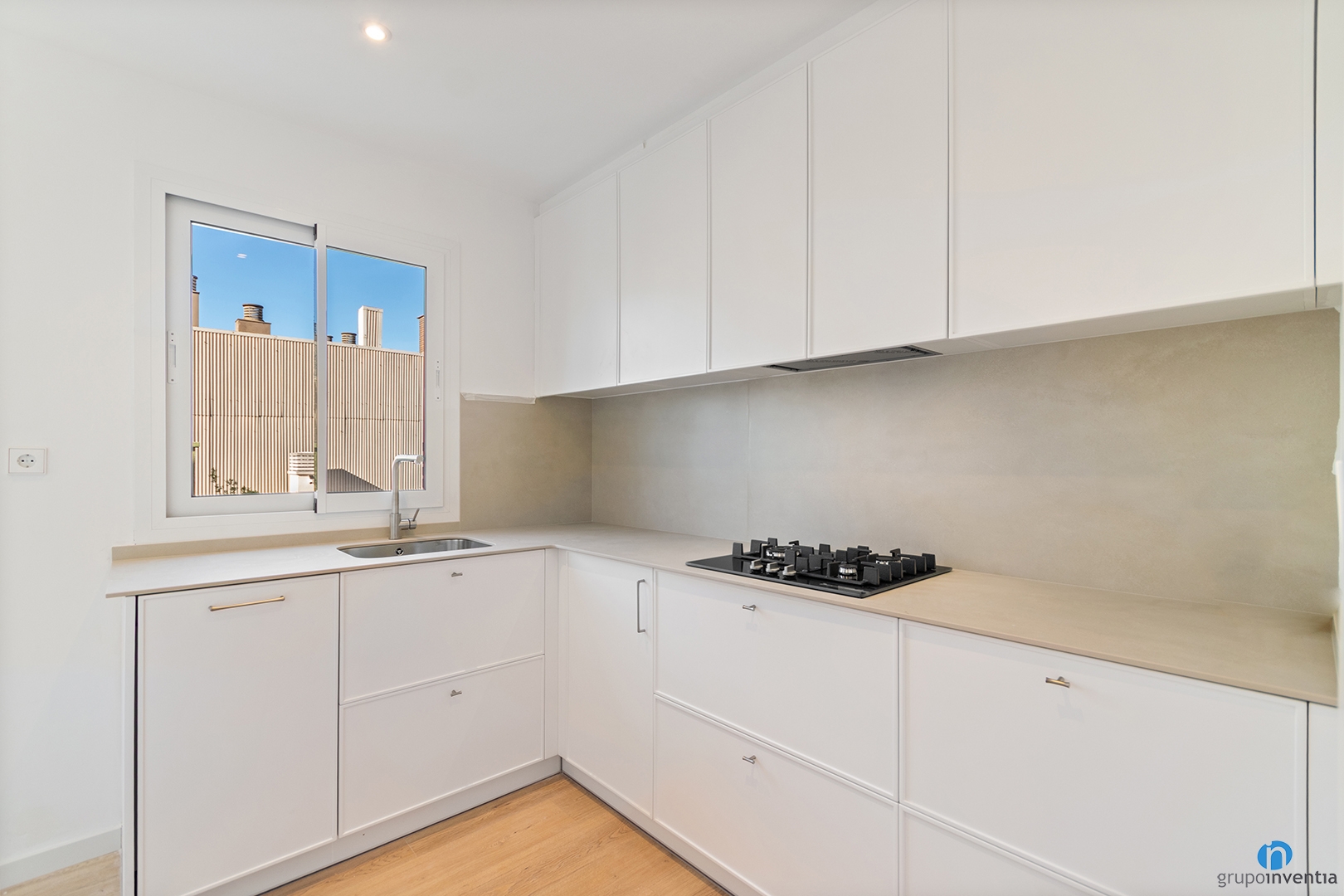 La cocina presenta un diseño minimalista que aprovecha al máximo la entrada de luz natural. Los armarios blancos de líneas rectas contrastan suavemente con la encimera en tonos arena. Esta combinación genera un espacio de trabajo visualmente limpio y muy funcional para el día a día.