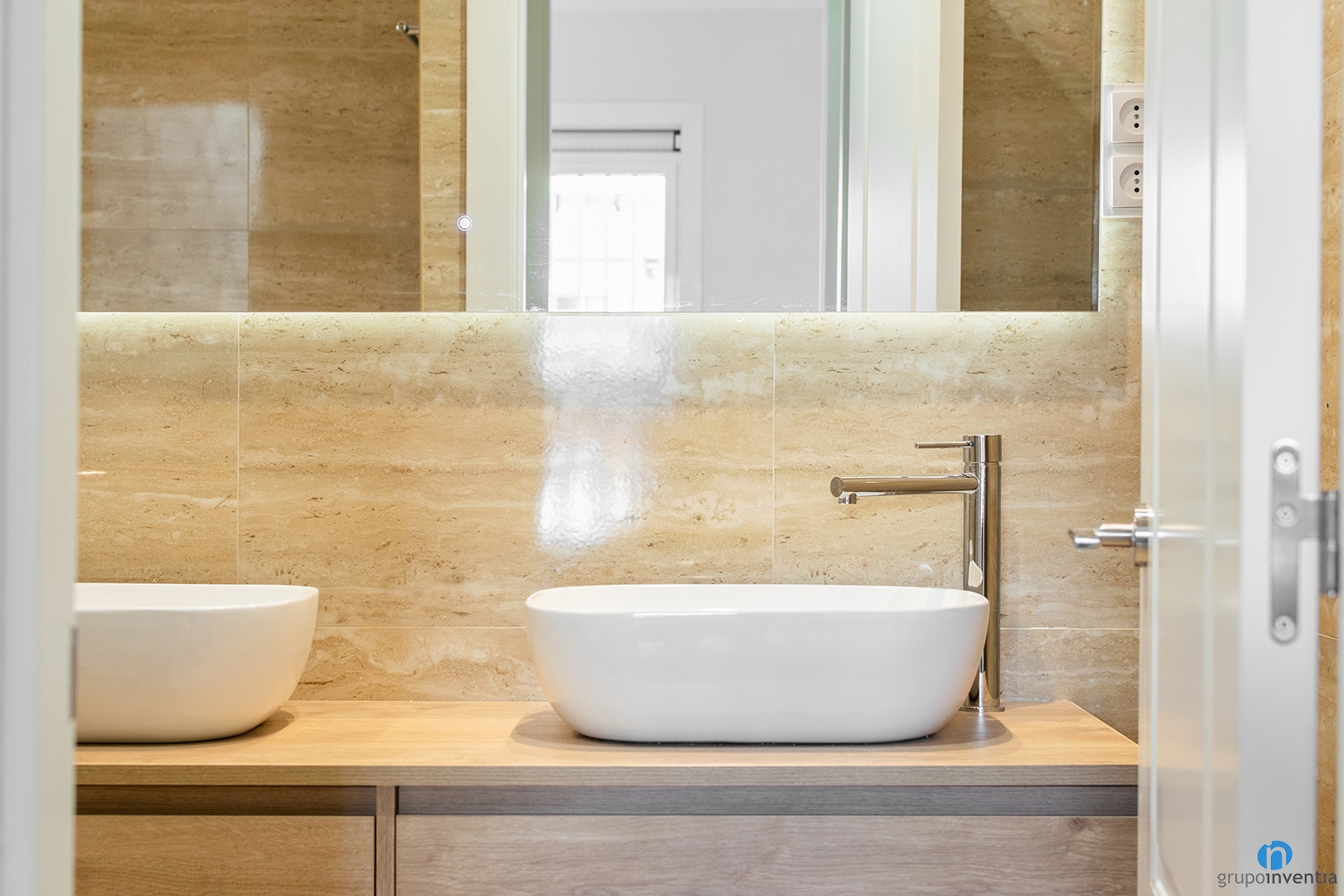 Los dos cuartos de baño han sido proyectados bajo un concepto de máximo confort y elegancia. El baño principal destaca por su mueble de madera con doble lavabo de tipo bol. El revestimiento de piedra natural en las paredes crea una atmósfera relajante de estilo spa.