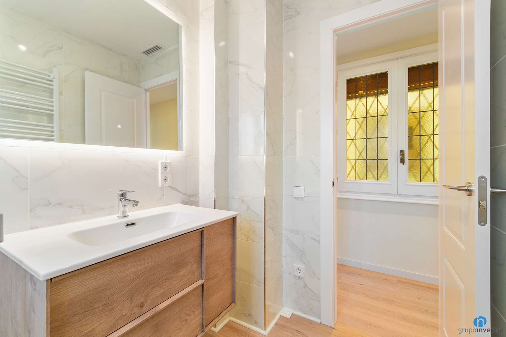 El segundo baño mantiene la coherencia visual con azulejos que imitan el mármol de gran formato. Hemos instalado un mueble suspendido que aporta ligereza y facilita la limpieza diaria del espacio. La mampara de perfilería mínima en la ducha potencia la amplitud visual del cuarto de baño.