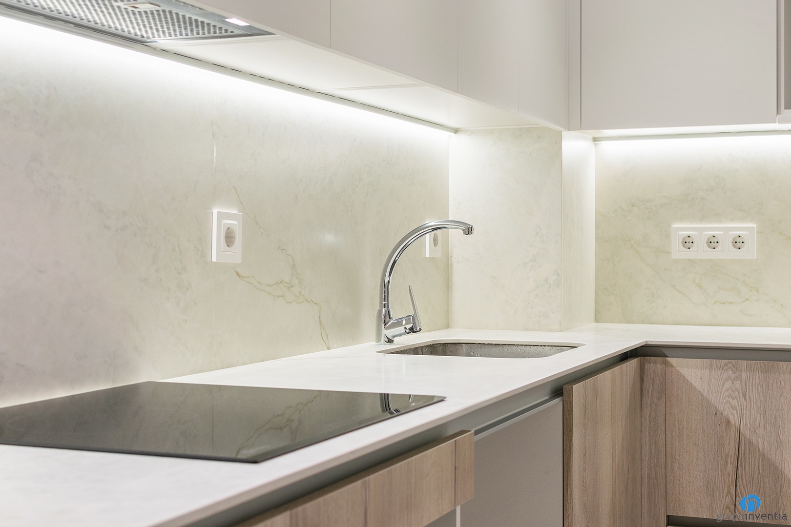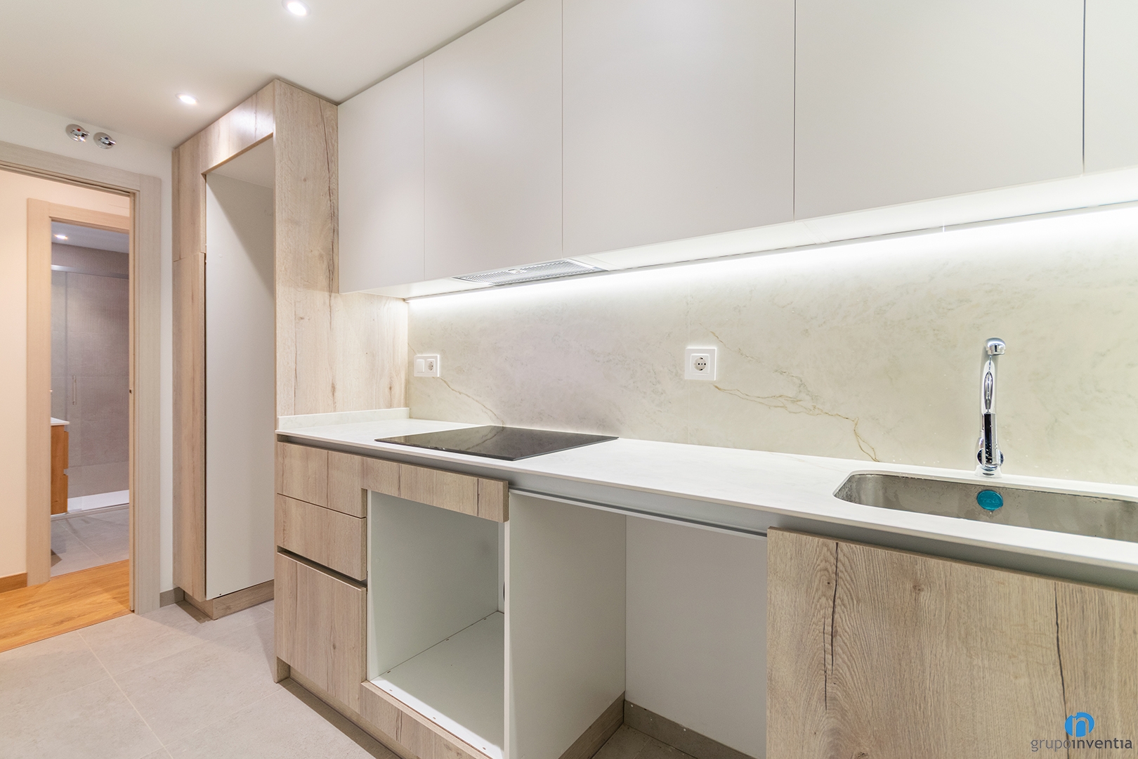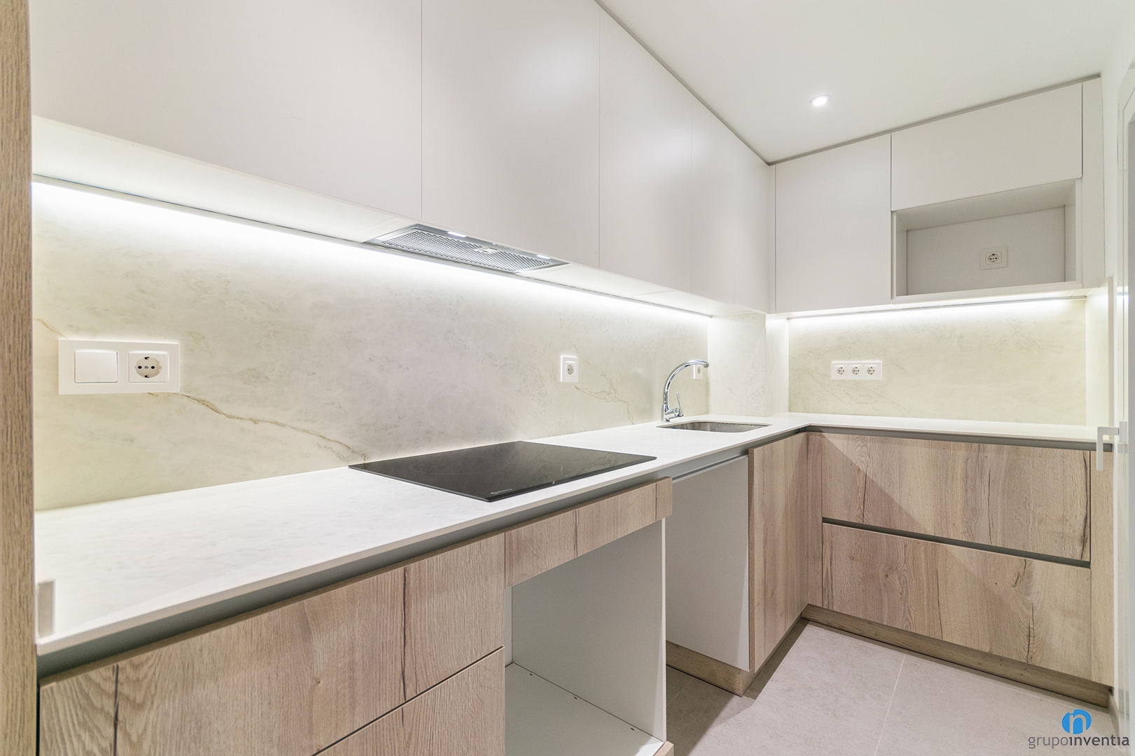 La reforma de cocina se ha realizado en un espacio propio. La distribución es en forma de L. En el extremo izquierdo encontramos un hueco a medida para la nevera. A continuación nace la primera encimera. Sobre ella se instalaron una placa de inducción y un fregadero de un solo seno. Debajo disponemos de huecos a medida para integrar el horno y el lavavajillas. Todo ello junto a generoso espacio de almacenaje.