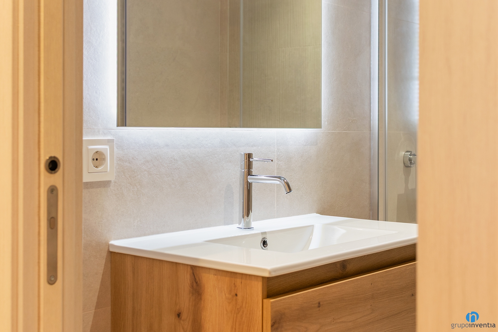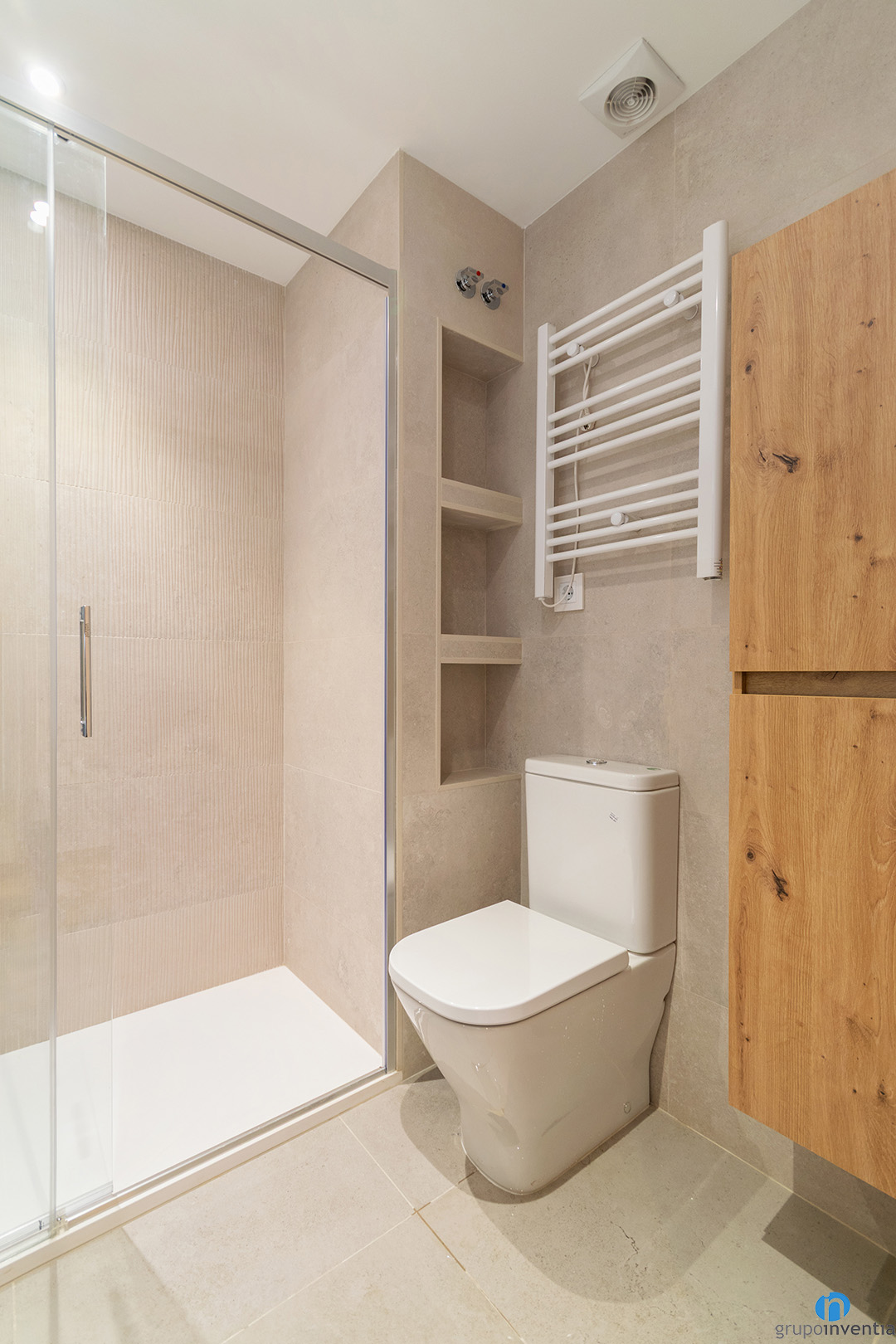 El diseño del baño mantiene la línea cromática del resto del piso. Los azulejos y baldosas son de tono beige. Este color crea un ambiente relajado, cálido y acogedor. El resultado es un baño moderno y muy funcional. Ideal para un uso diario cómodo y elegante.