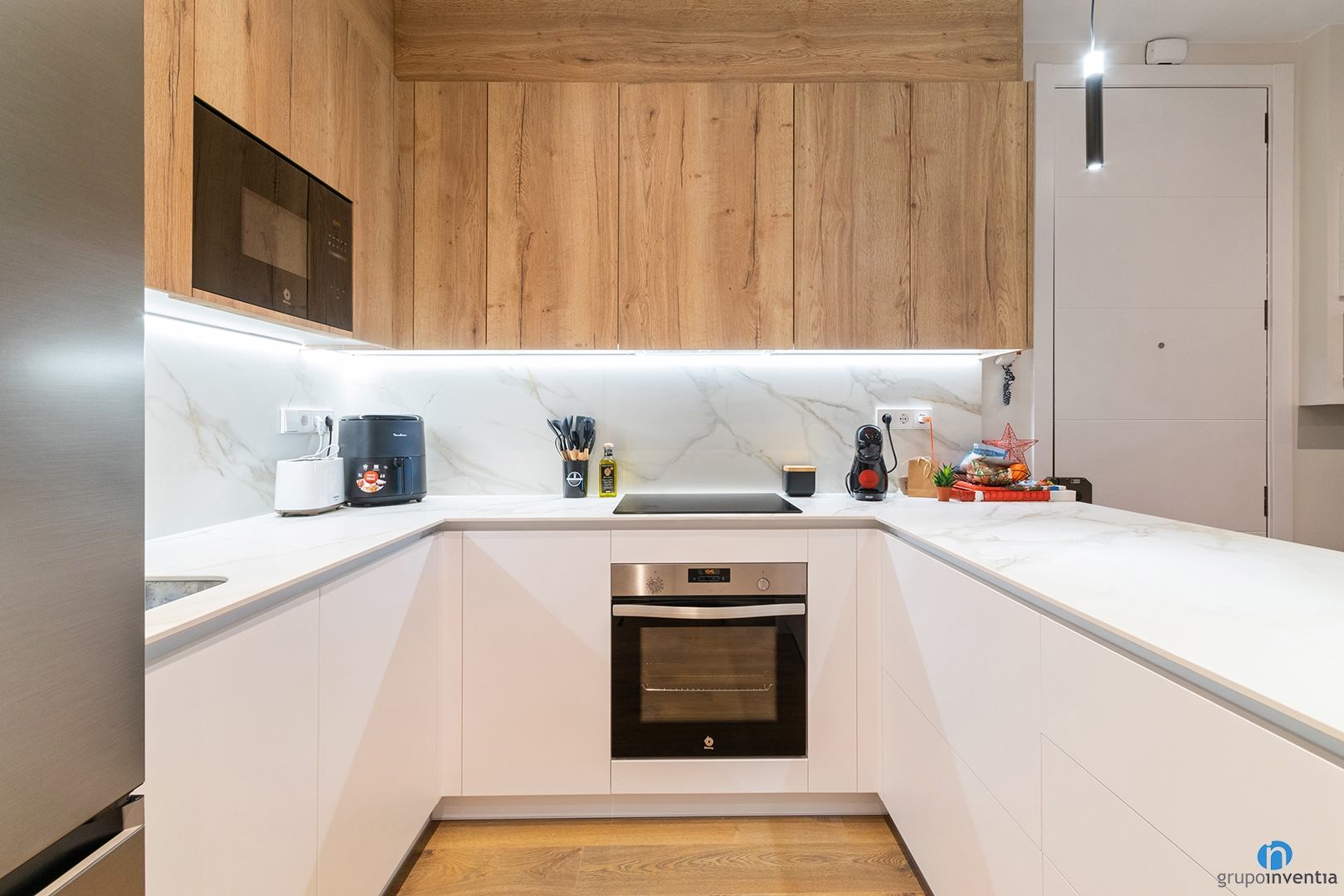 La cocina la encontramos justo a la derecha de la entrada del piso. Se trata de una reforma de cocina abierta y con distribución en forma de U. Además de un diseño de cocina integrado en el resto del piso, está equipada por completo.