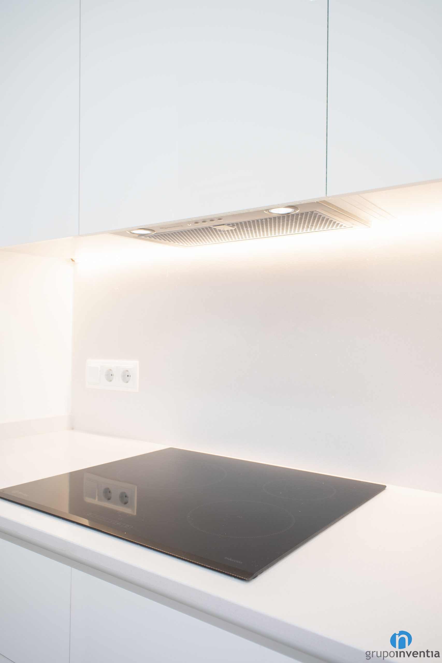 En el lado izquierdo encontramos un mueble de cocina con capacidad de almacenaje en la parte inferior y superior. También cuenta con una encimera que hemos equipado con una placa vitrocerámica. El extremo del mueble de cocina dispone de huecos a medida para integrar el horno y el microondas. La nevera queda camuflada por las mismas puertas el armario.