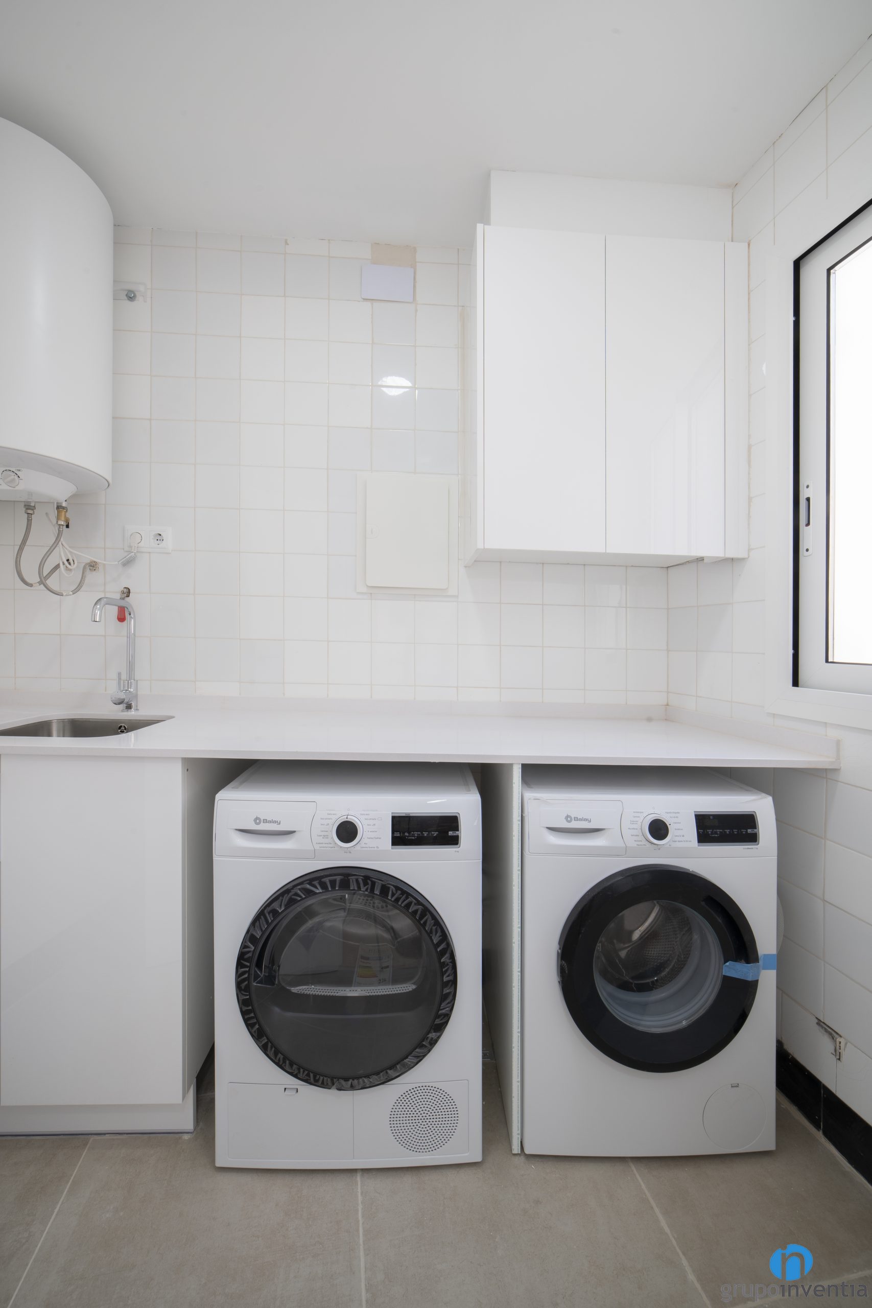 En el lado derecho de la cocina hay otra encimera. Es amplia y ofrece una gran superficie de apoyo y de trabajo. A su vez está equipada con un fregadero de un seno. Esta reforma de cocina cuenta con una habitación anexa que funciona de galería. Ahí hemos colocado las nuevas lavadora y secadora.
