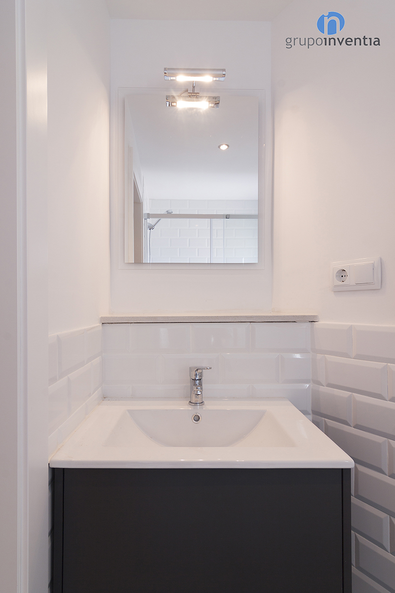 En cuanto al diseño, se optó por alicatar la pared hasta media altura con azulejos biselados de color blanco y pintar del mismo tono la pared restante. La combinación del color claro de las paredes con un tono más oscuro del pavimento consigue generar mayor sensación de amplitud.