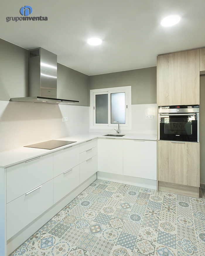 Además de un bonito diseño, con un pavimento hidráulico, esta reforma de cocina cuenta con una gran capacidad de almacenaje, con armarios y cajones en toda la parte inferior de la encimera.