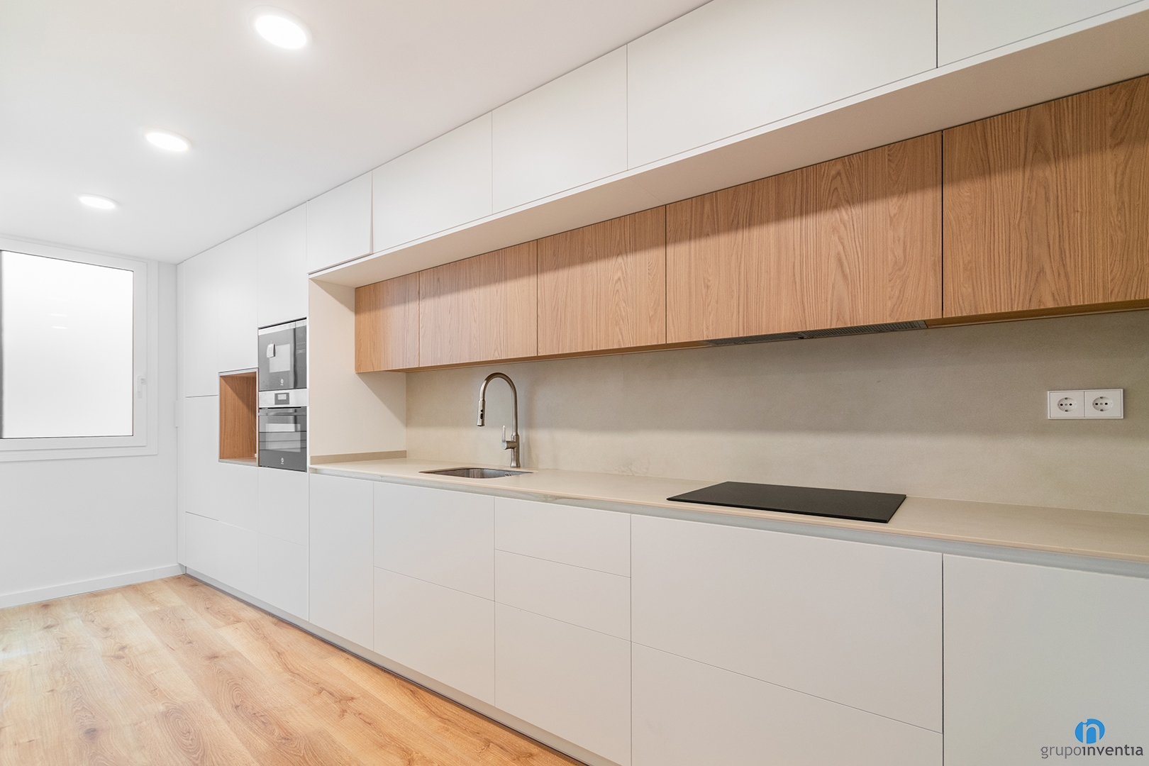El mueble de cocina es de color blanco y presenta detalles en madera. Con esta combinación reforzamos la sensación de amplitud creando un ambiente luminoso y agradable.