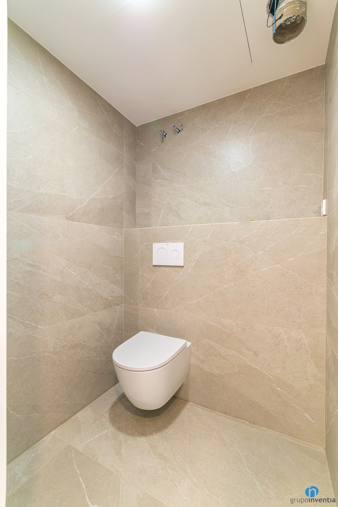 El cuarto de baño se ha renovado por completo. Hemos alicatado las paredes con azulejos beige. Este acabado crea un ambiente cálido y muy equilibrado. También aporta una imagen moderna y serena.