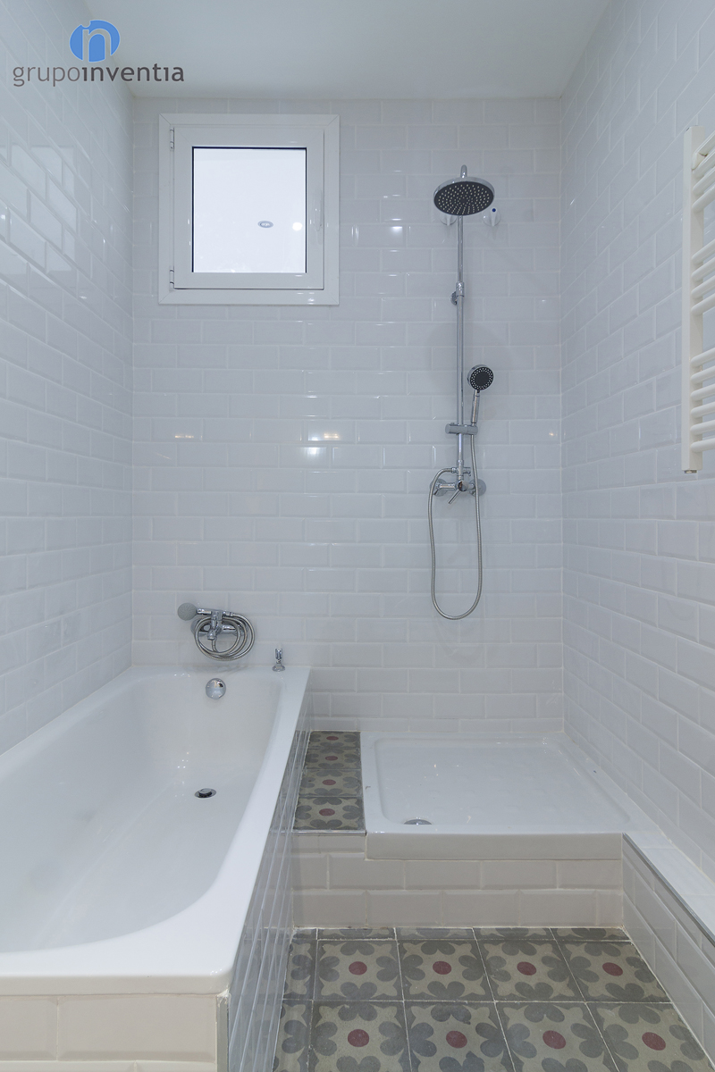 Para la reforma de baño se aportó por un diseño capaz de potenciar la luminosidad de la estancia al máximo. Para ello, las paredes se alicataron por completo con azulejos biselados de color blanco y se instaló un pavimento hidráulico.