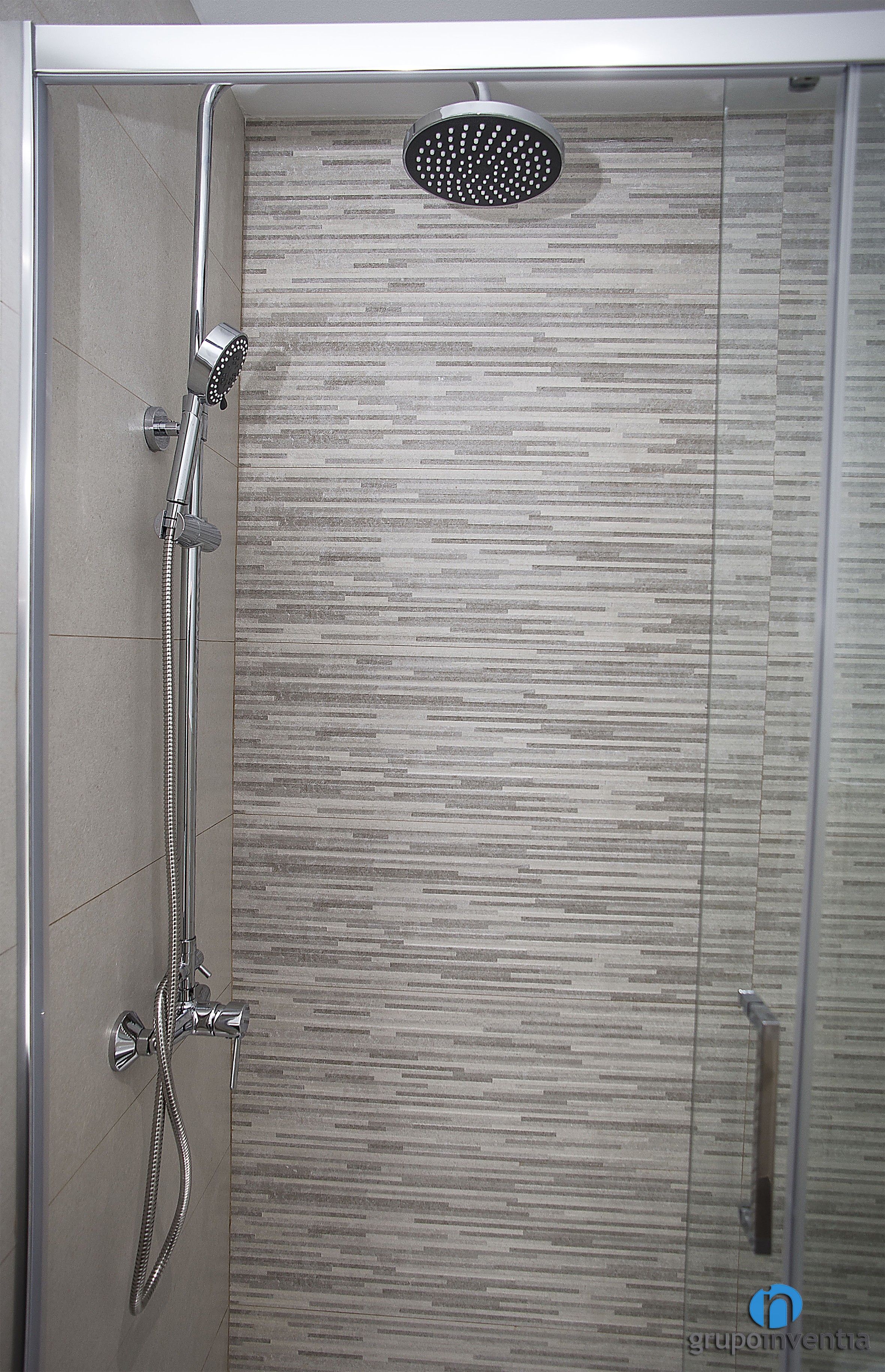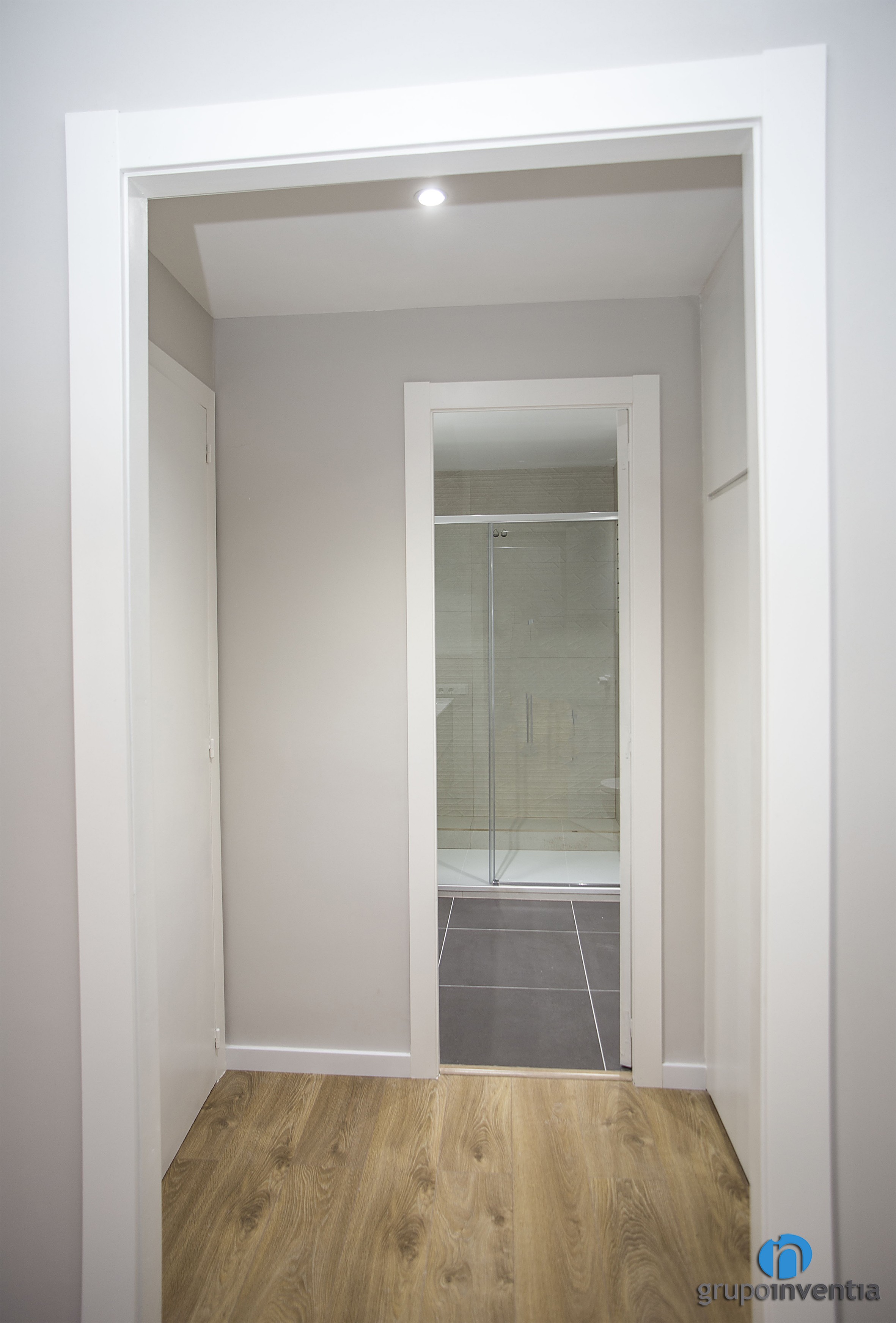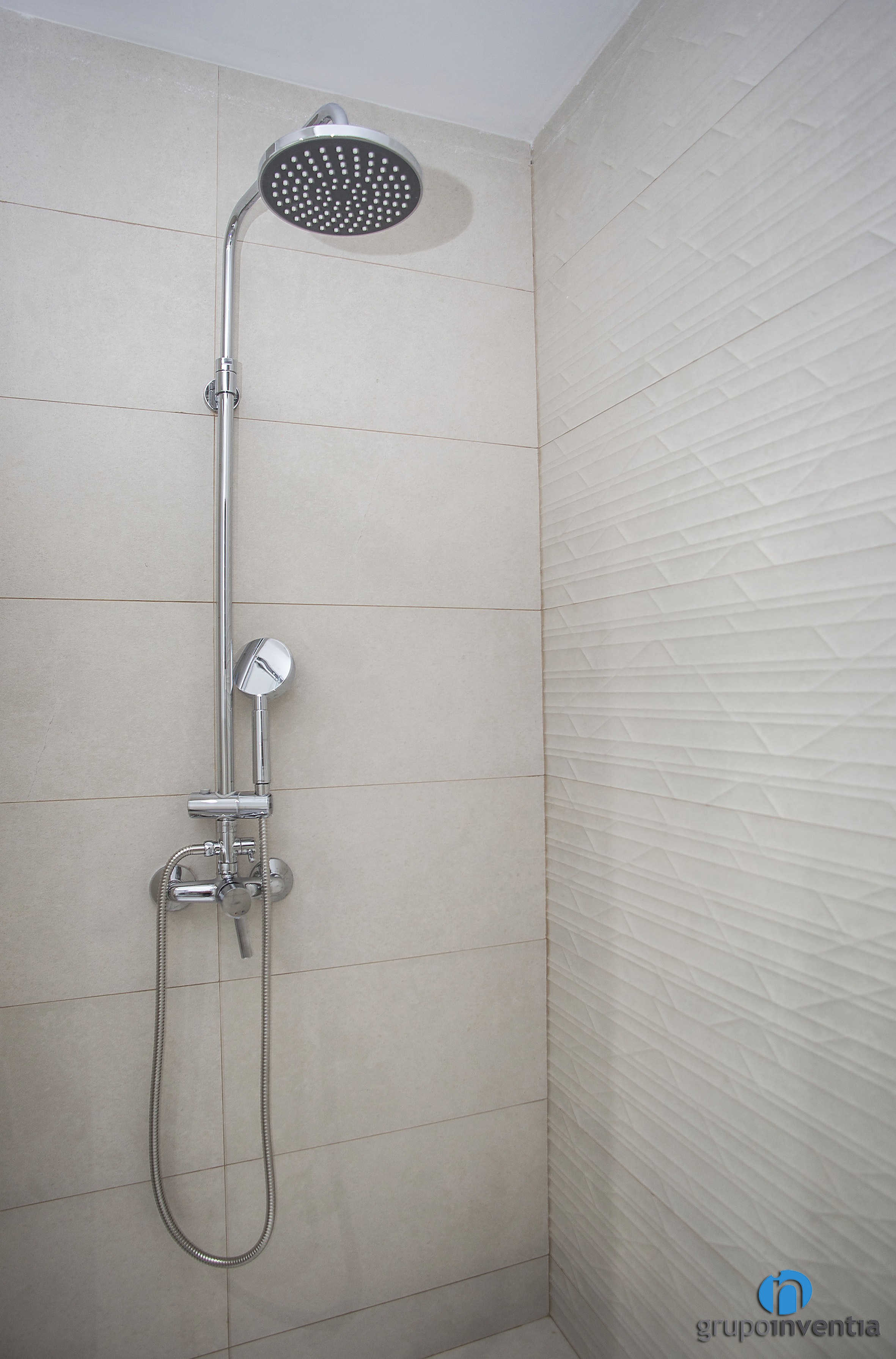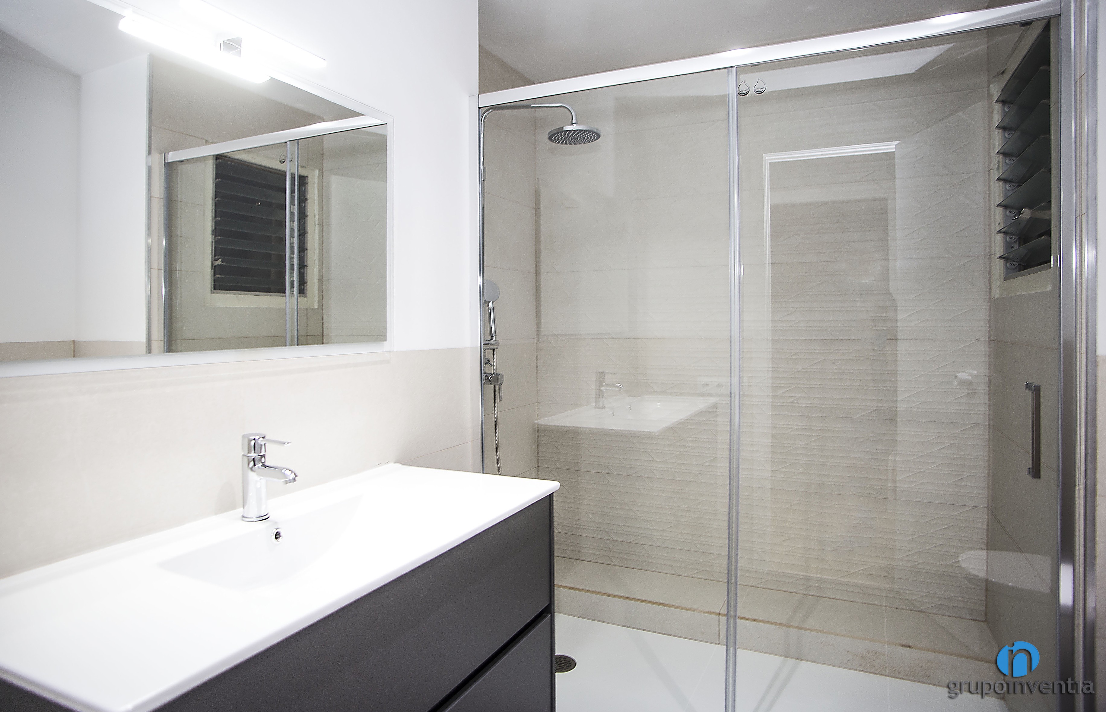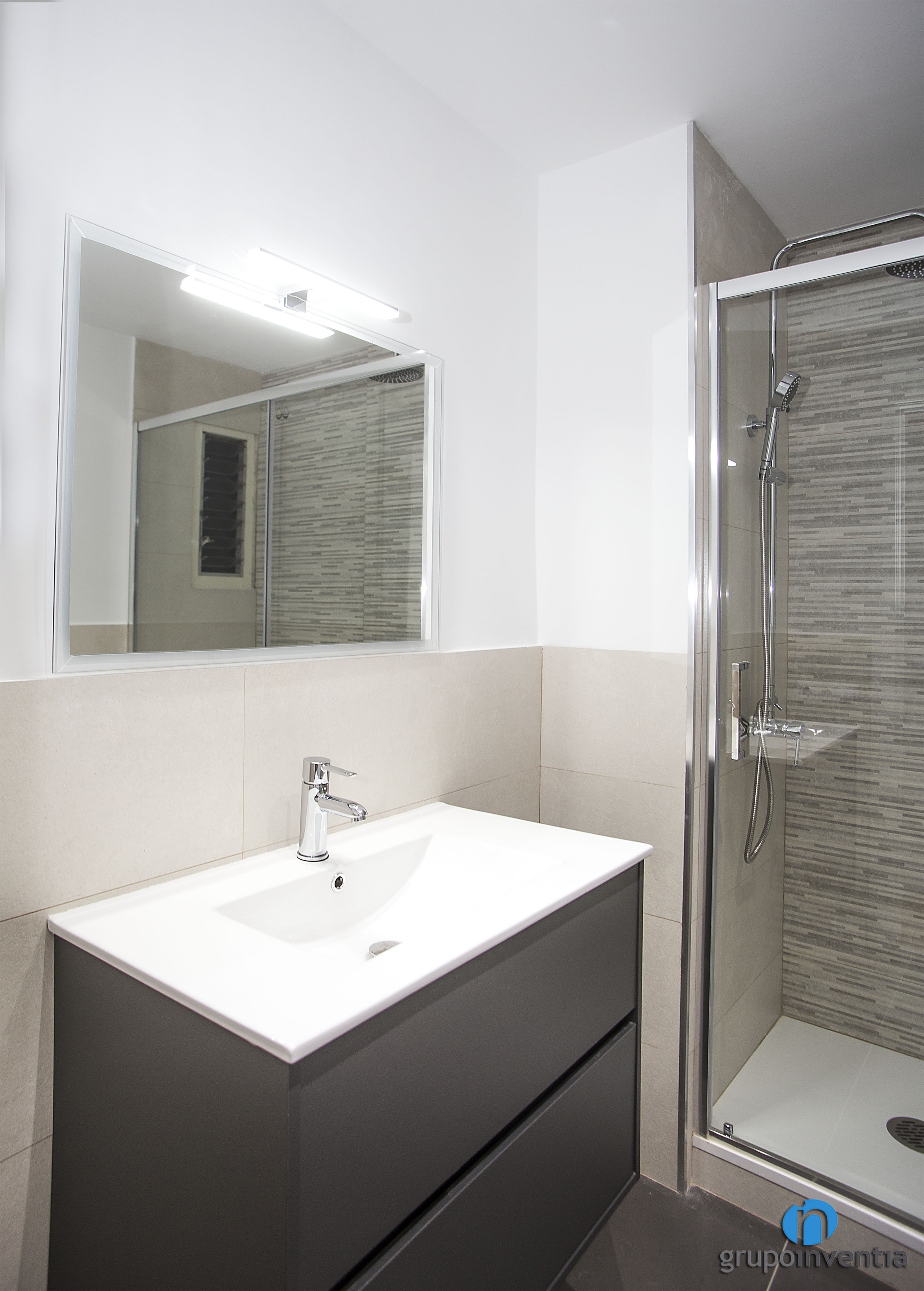 En cuanto a los cuartos de baño, en ellos se aplicó el mismo diseño con las paredes alicatadas a media altura con azulejos beige y el resto pintado de blanco. Tras esta reforma, ambas estancias cuentan con un lavabo con cajonera incorporada, un inodoro y una ducha protegida con mamparas de puertas correderas.