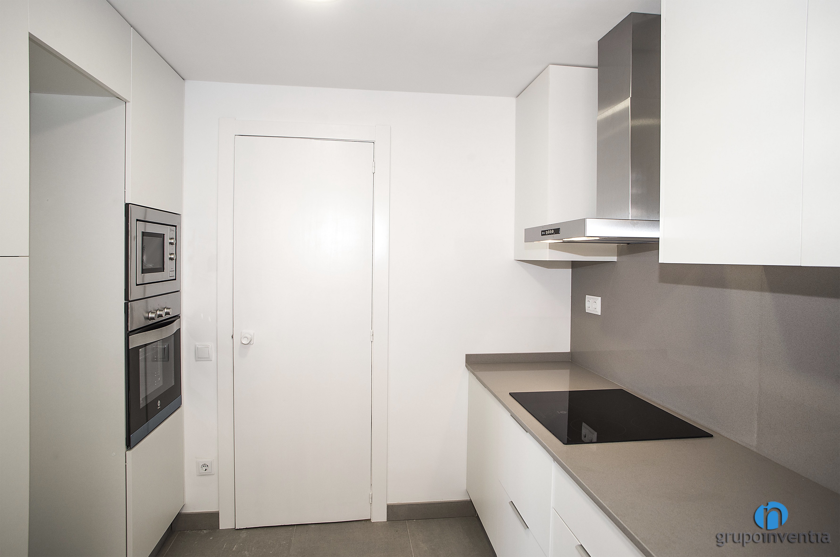 La cocina ocupa su propio espacio y para la disposición de sus nuevos elementos se utilizó una distribución a dos frentes. En la parte de la izquierda se colocó un alargado tramo de encimera que, además de ofrecer una amplia superficie de apoyo, está equipado con una placa vitrocerámica y un fregadero individual. Además, cuenta con capacidad de almacenaje tanto en su parte inferior como superior. Ya en la parte derecha se dispuso un mueble de cocina en el que se encastraron los nuevos electrodomésticos.