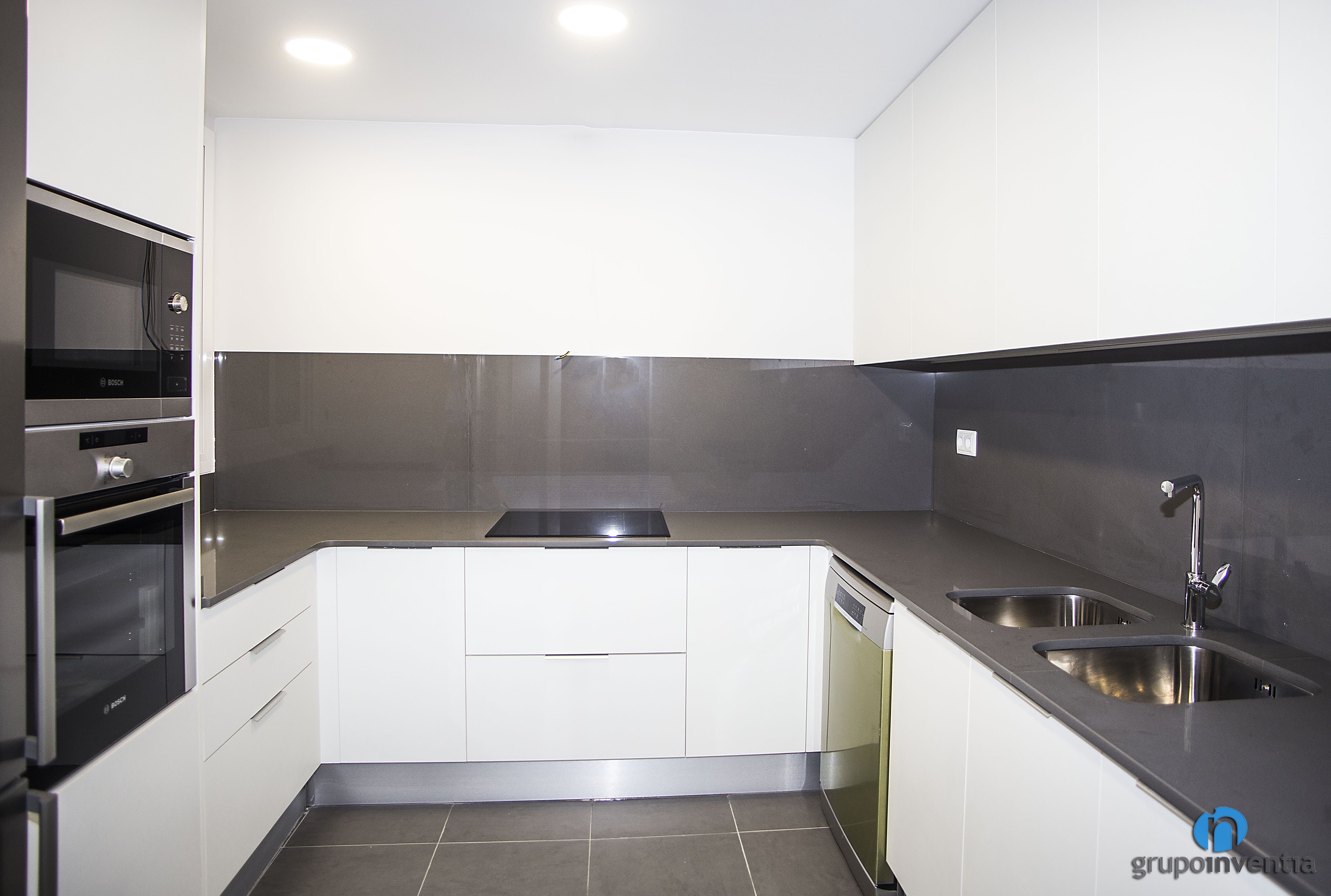 En la parte derecha se colocó el primer tramo de encimera y se equipó con un fregadero doble. Además, cuenta con un lavavajillas en su parte inferior. La encimera tuerce hacia la izquierda y da paso a un segundo tramo equipado con una placa vitrocerámica. En la parte izquierda continúa la encimera y en el extremo se encastraron el resto de electrodomésticos.