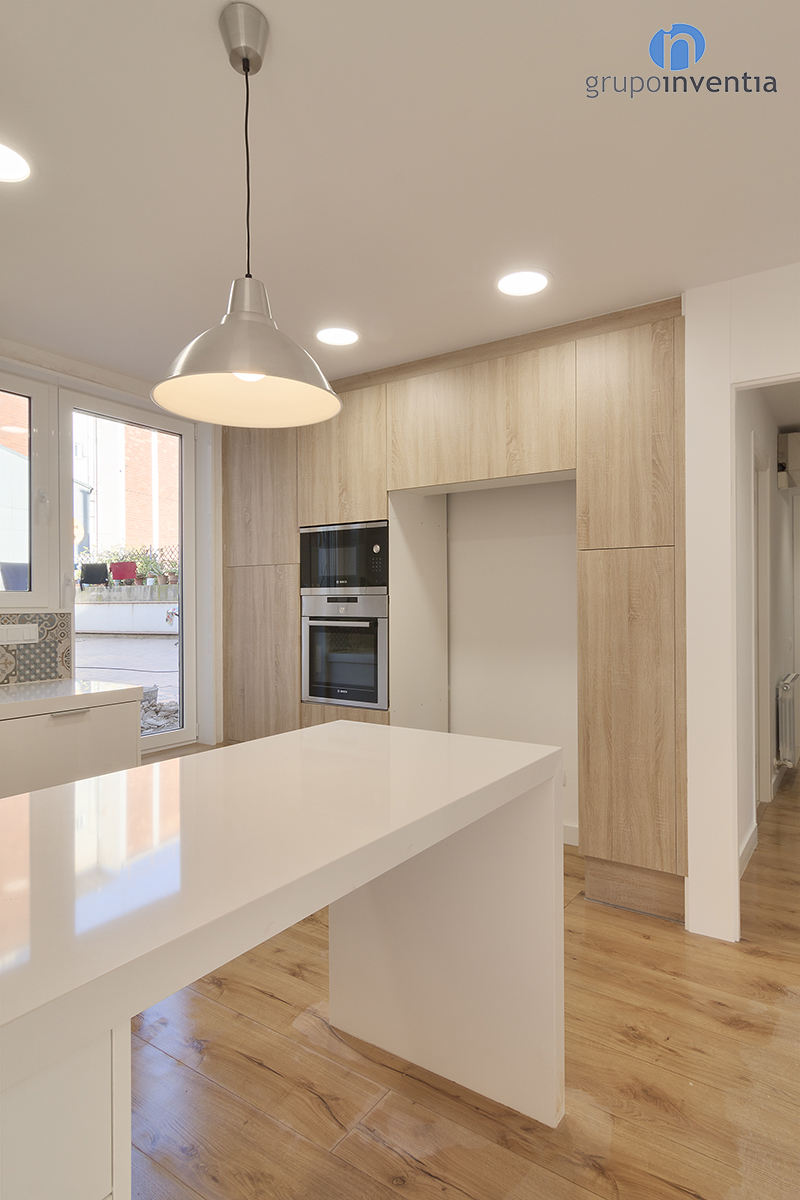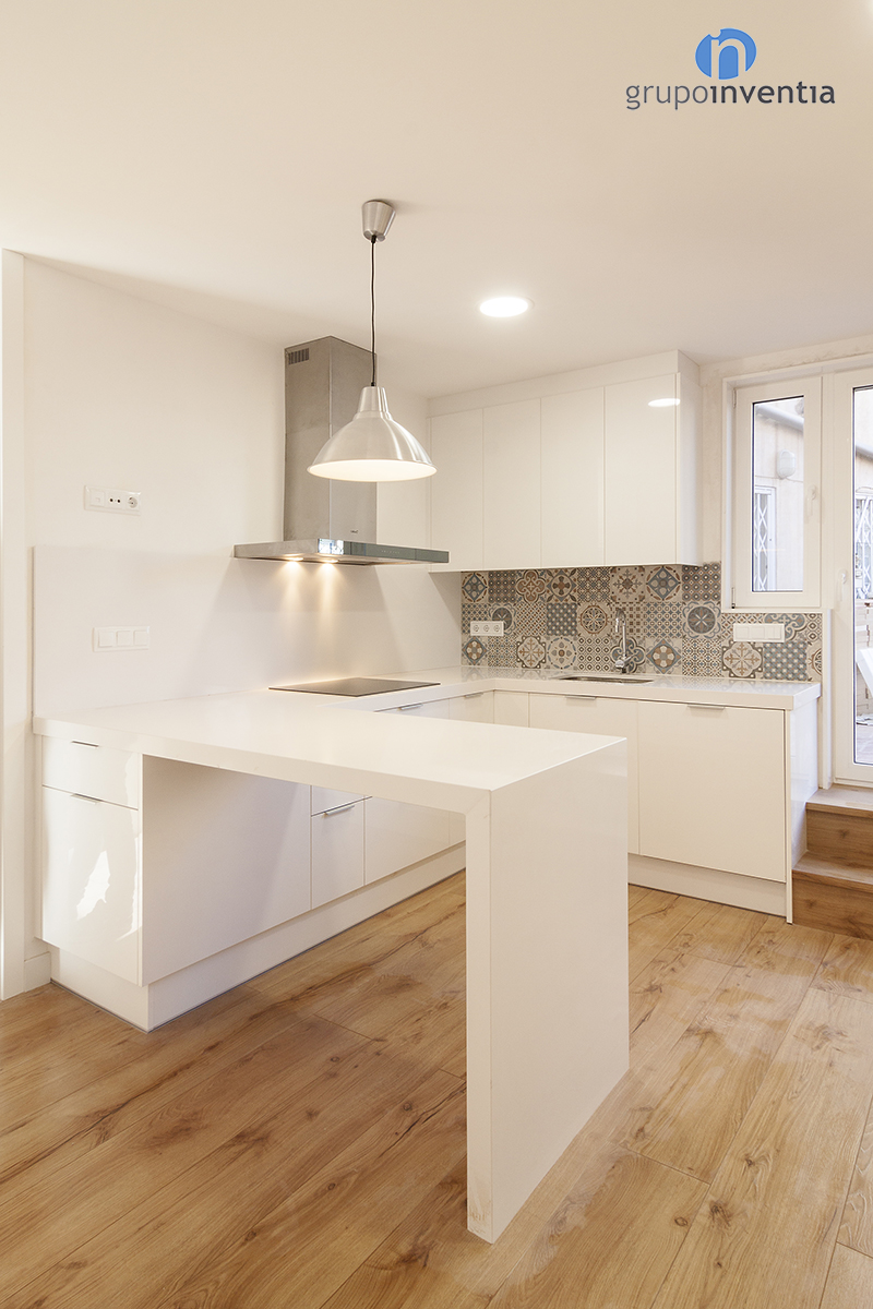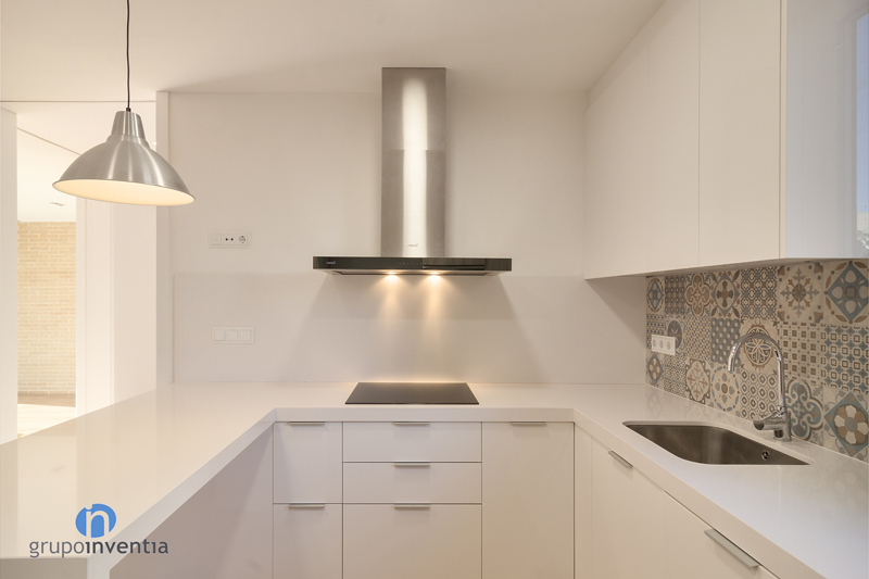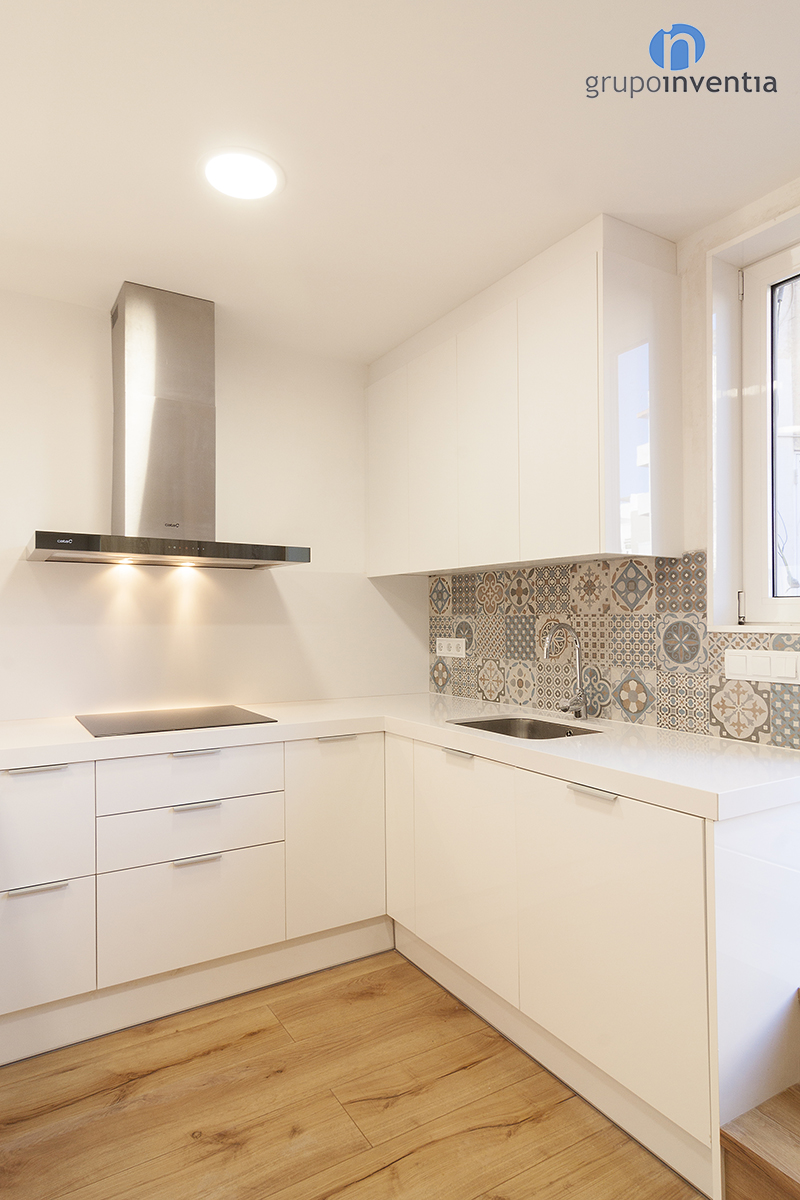 Por su parte, los electrodomésticos se colocaron justo en frente de la entrada a la cocina, todos ellos encastrados y compuestos por una nevera, un horno y un microondas. En cuanto al diseño, en esta reforma de cocina destaca el color blanco, en todo el mueble, y el alicatado en hidráulico de la pared de la zona del fregadero.