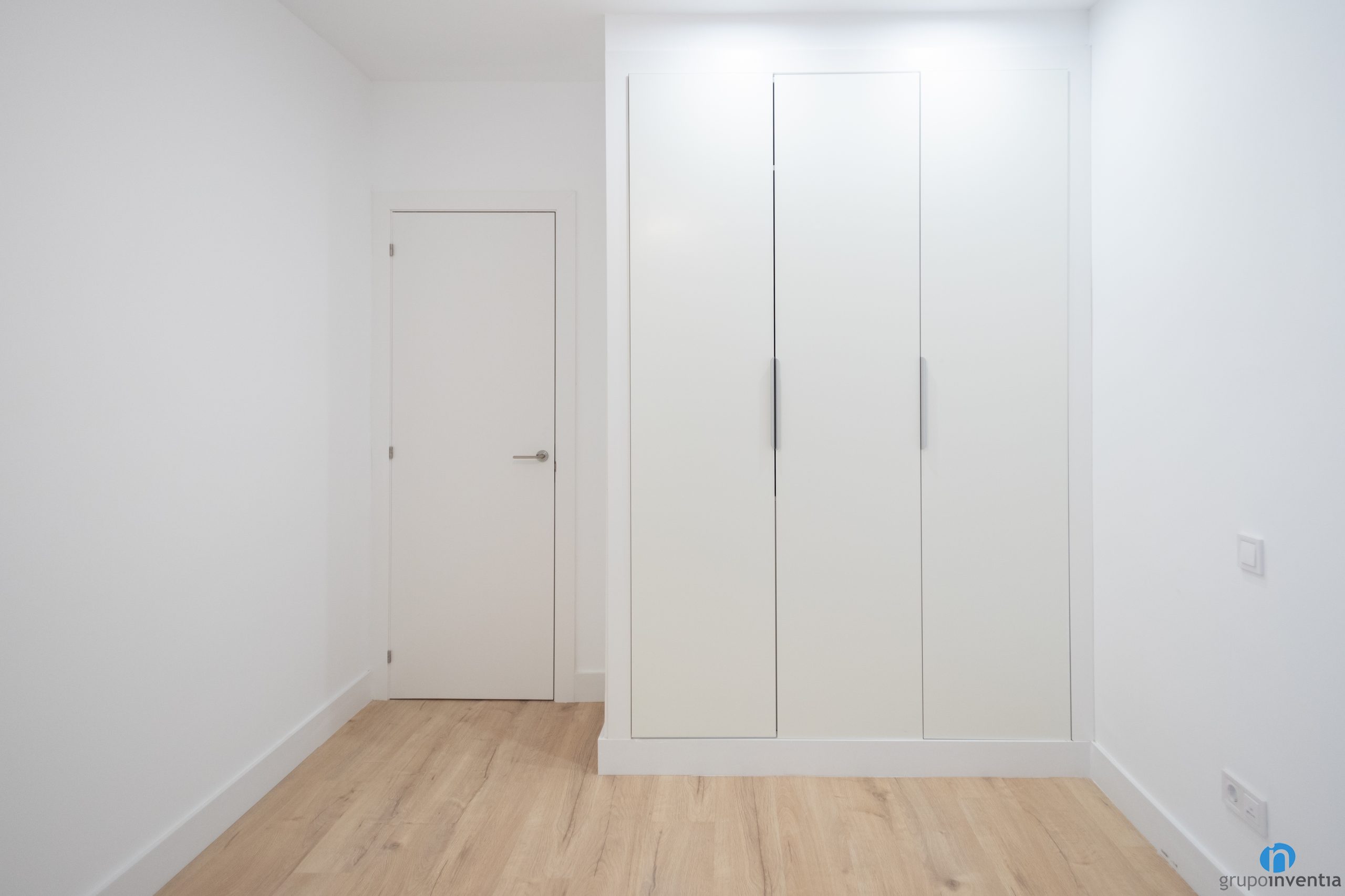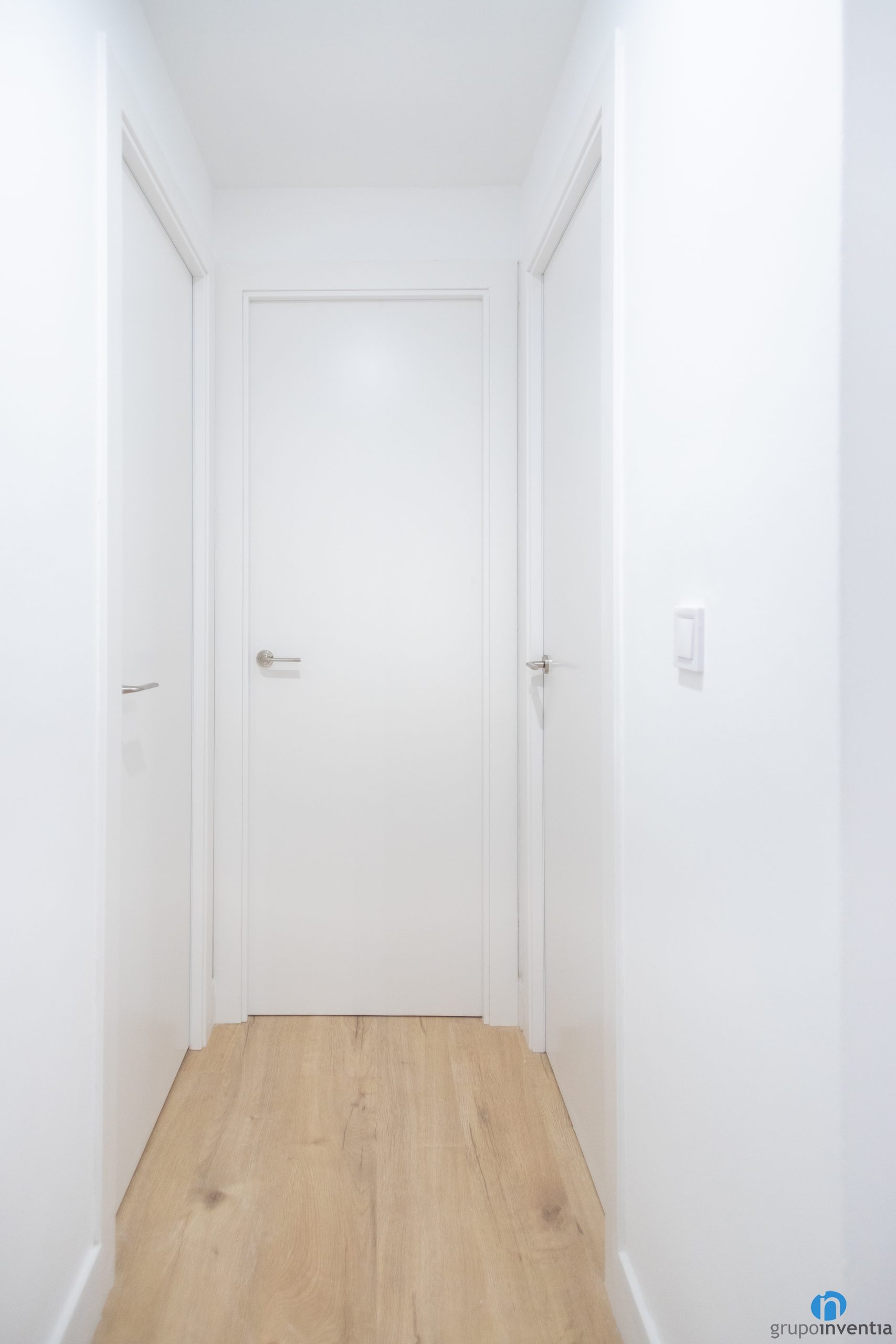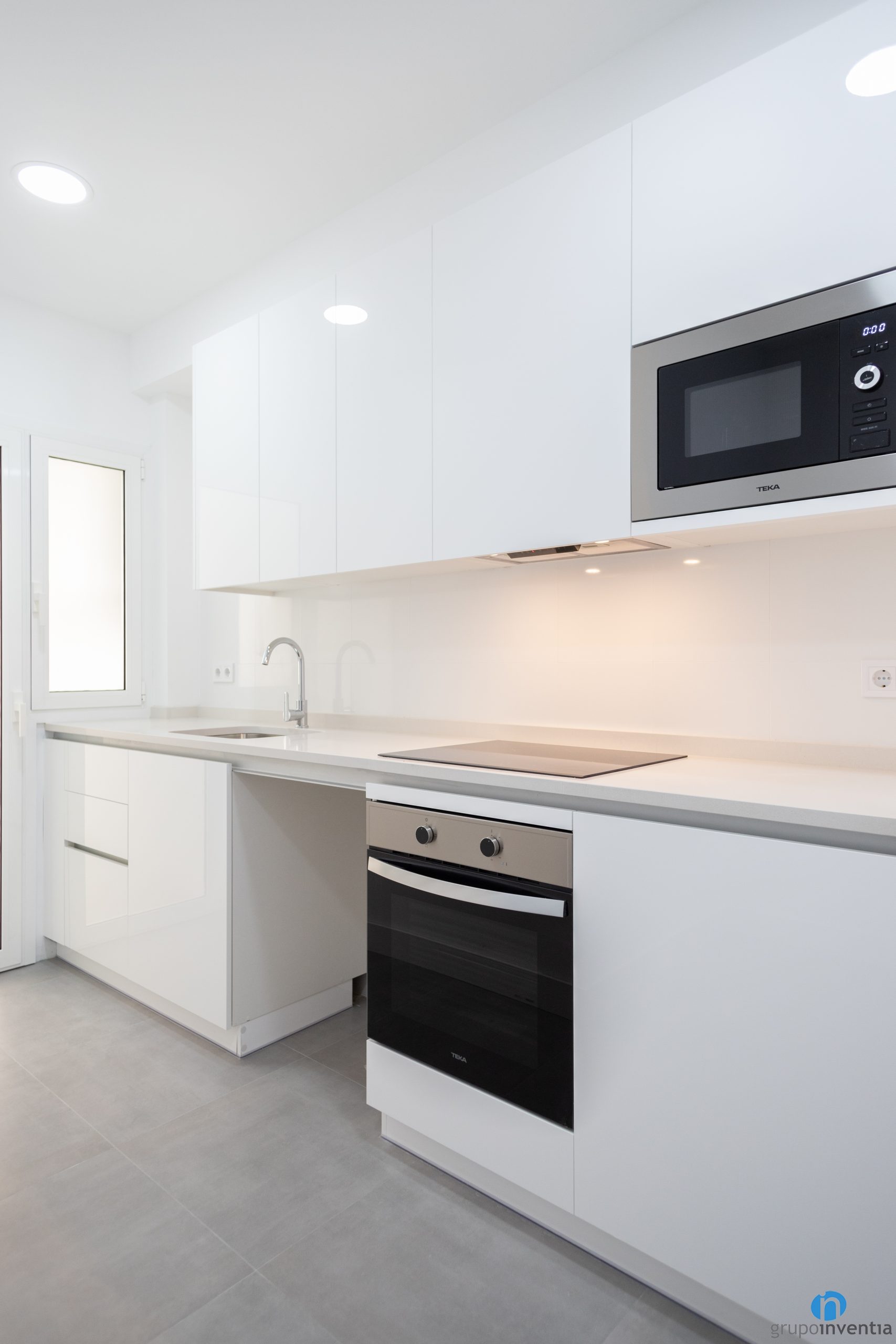 Sobre la encimera, que es de color blanco como todo el mueble de cocina, se han instalado una placa vitrocerámica y un fregadero de un seno. A su vez en los armarios inferiores de la cocina también se ha dejado un hueco a medida para poder integrar el lavavajillas. A través de esta cocina se accede a una galería y hemos cambiado la puerta original por una de carpintería de aluminio.