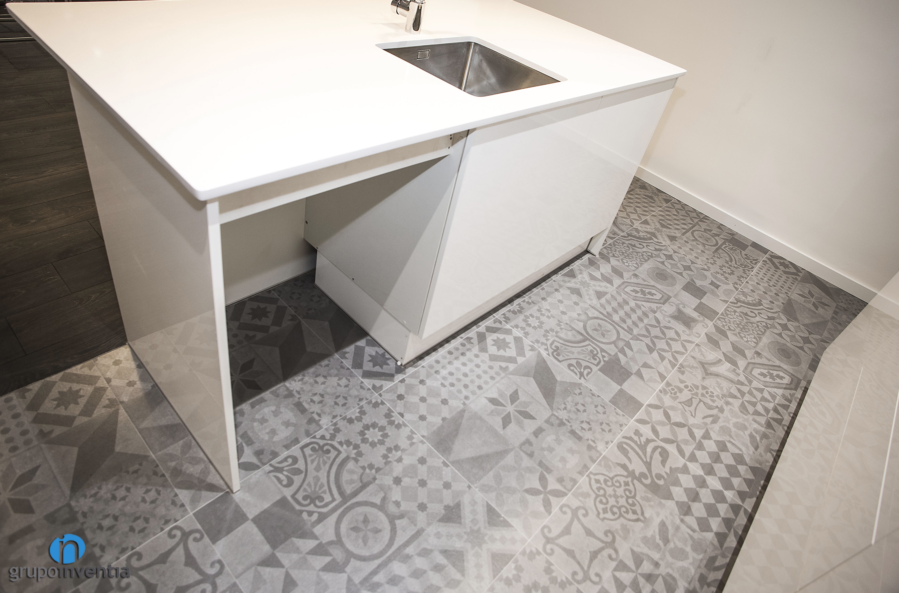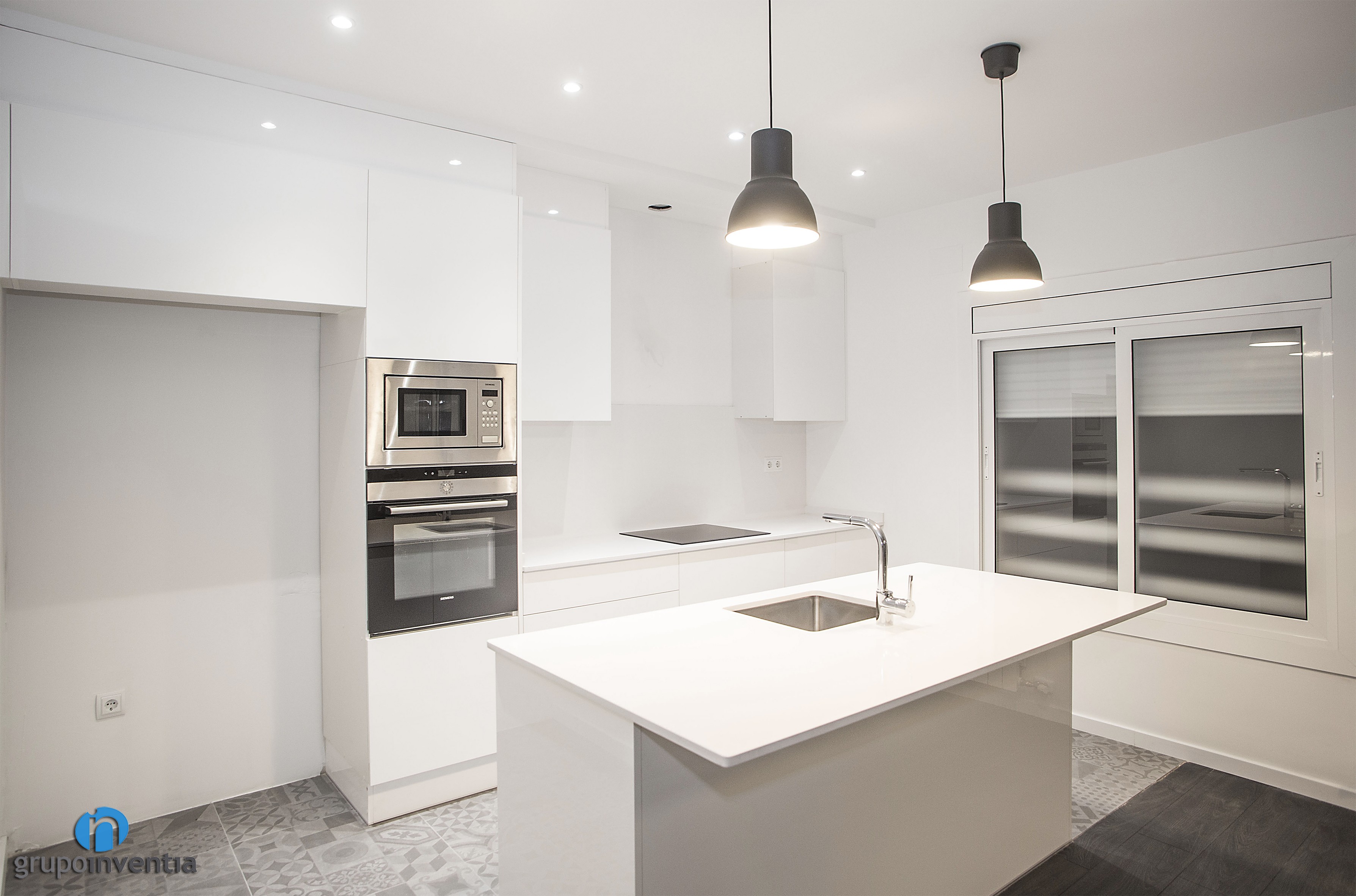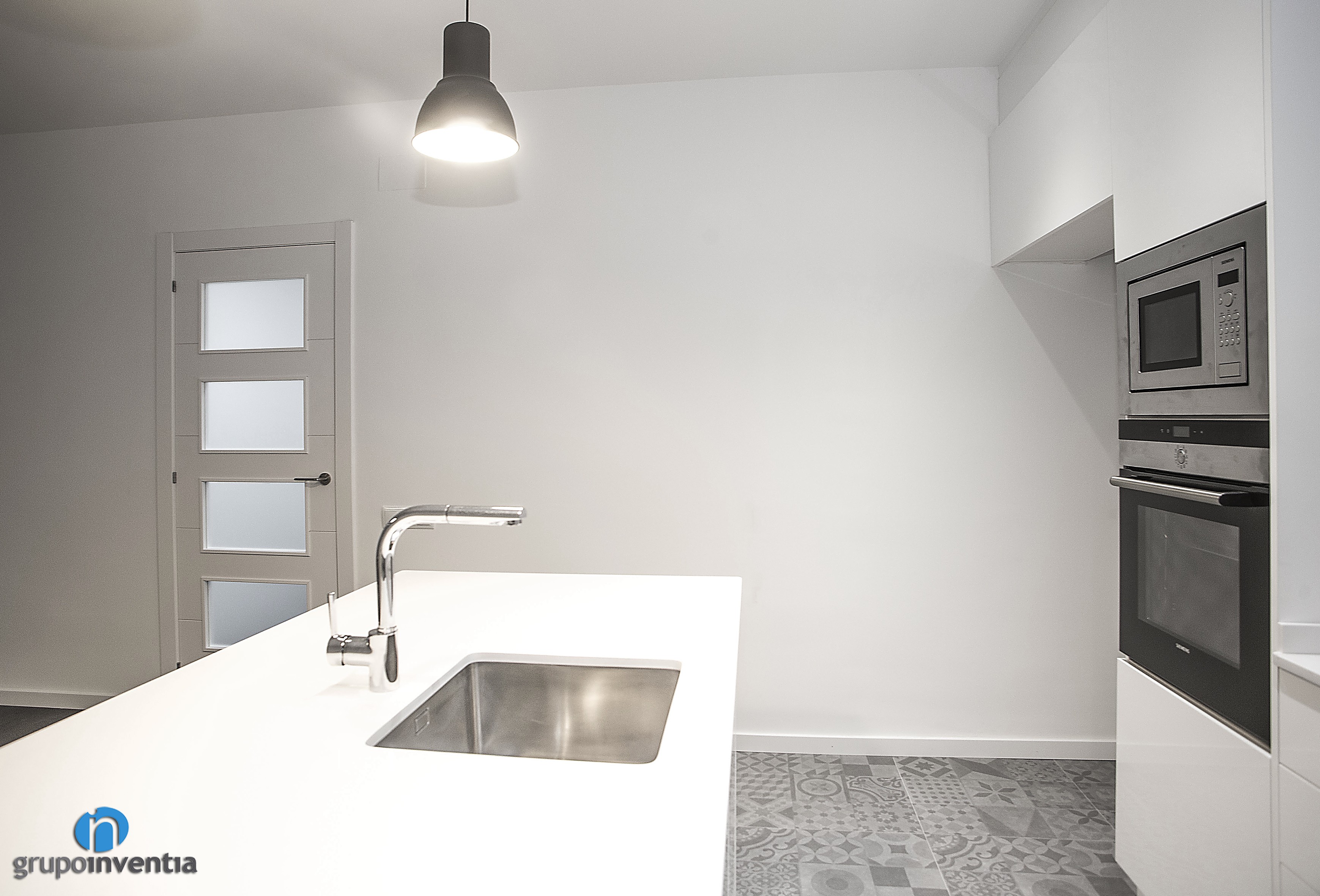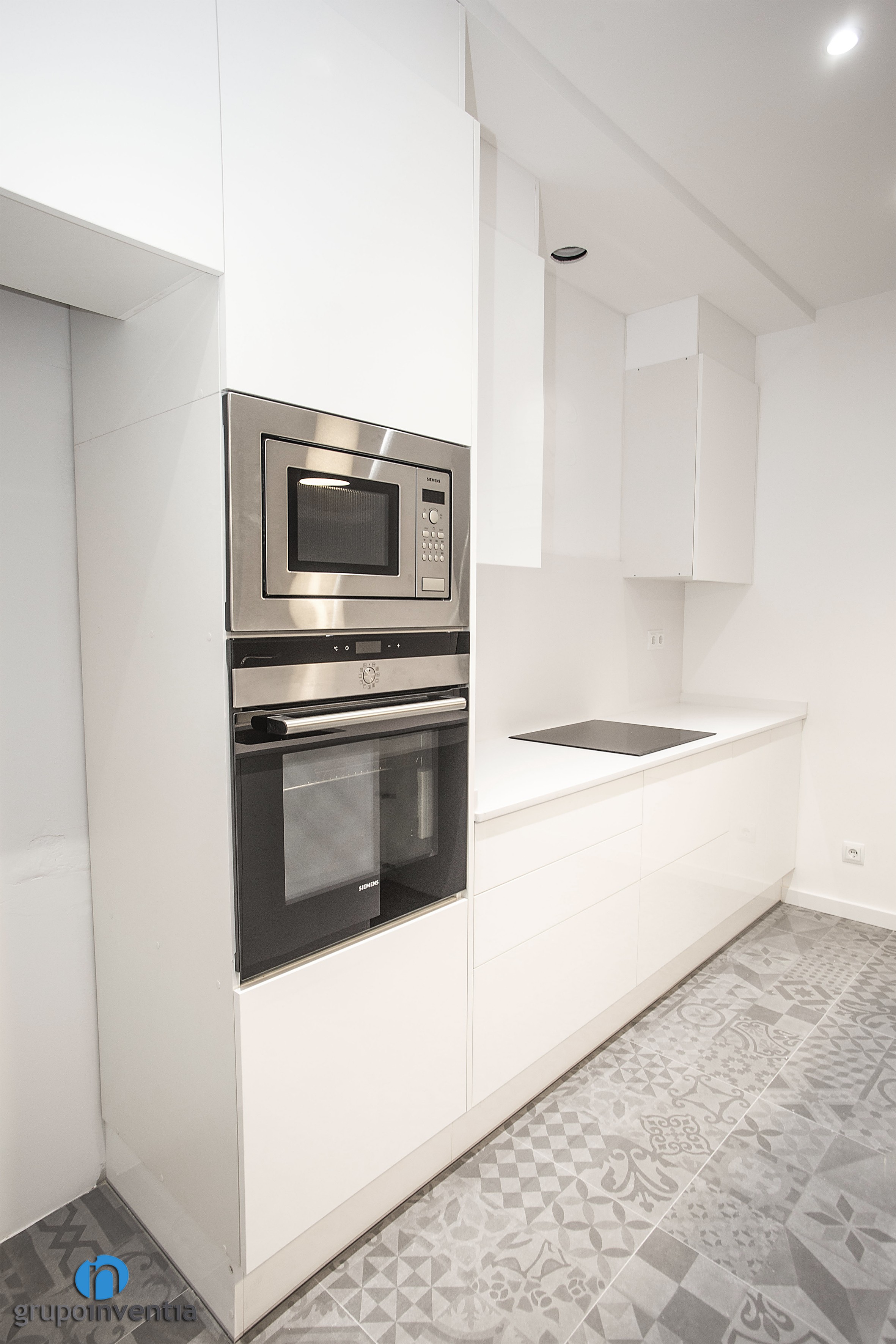 La cocina es abierta al salón y para la colocación de sus nuevos elementos se optó por una distribución a dos frentes. En el extremo de la izquierda se dispusieron huecos a medida para encastrar la nevera, el horno y el microondas. Seguidamente nace la encimera, equipada con una placa vitrocerámica y con capacidad de almacenaje tanto en su parte inferior como superior.