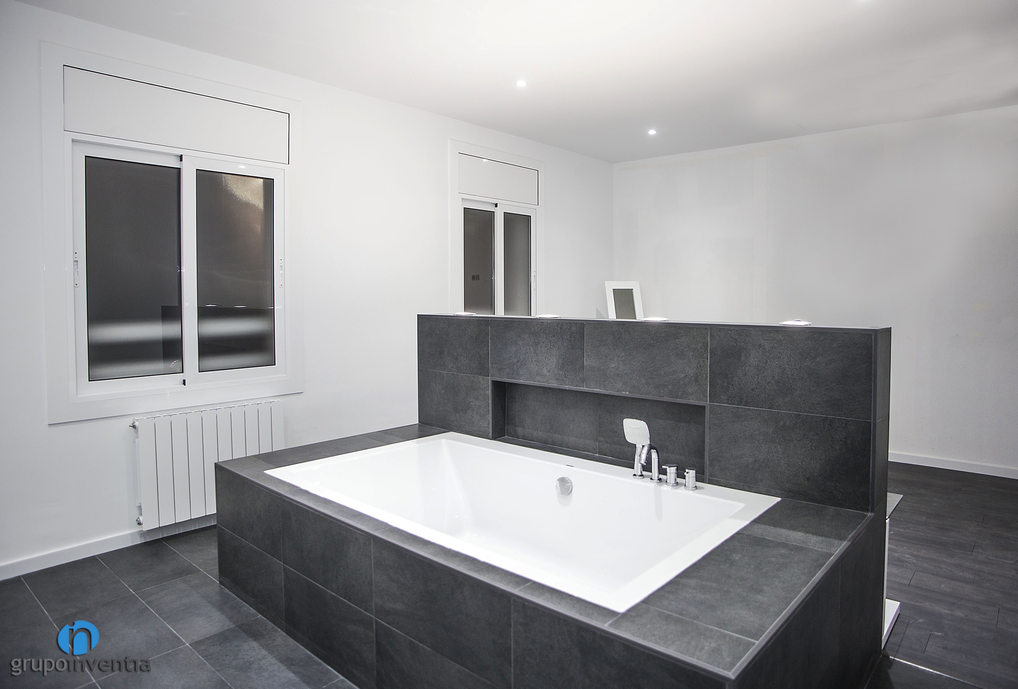 Para ver los elementos de baño, primero debemos ir al dormitorio, ya que detrás de el cabecero de obra que se construyó, se instaló una bañera. Desde la misma estancia se accede al cuarto de baño, que vio mejorado tanto su diseño como su equipamiento sanitario. En éste se instalaron un lavabo con cajonera incorporada, un inodoro y una ducha.