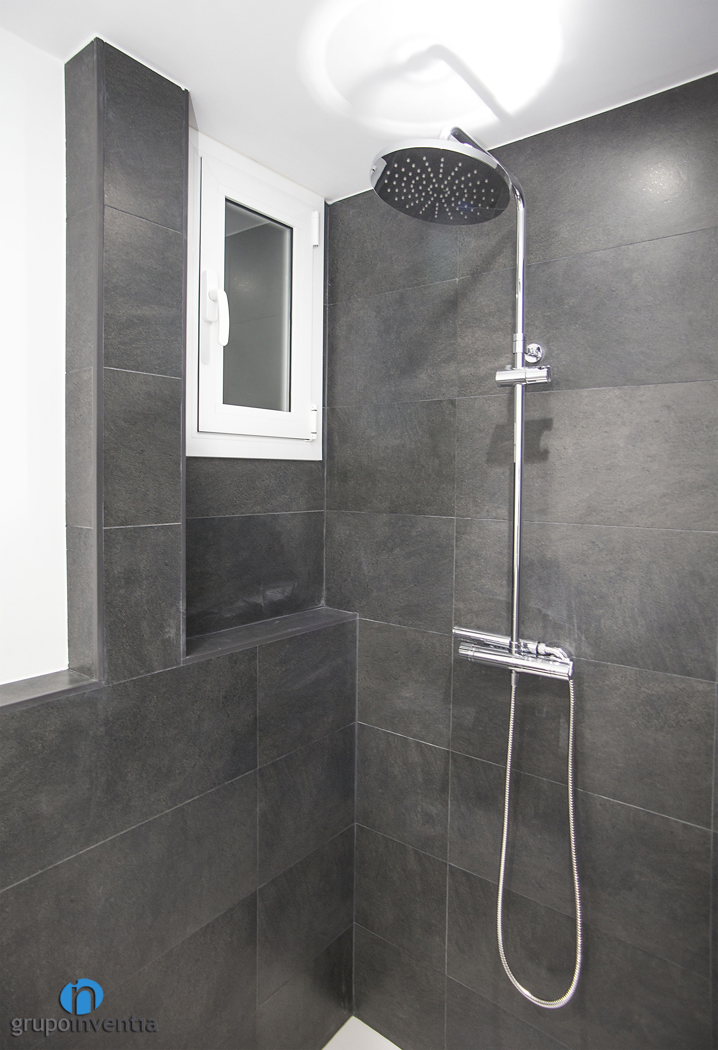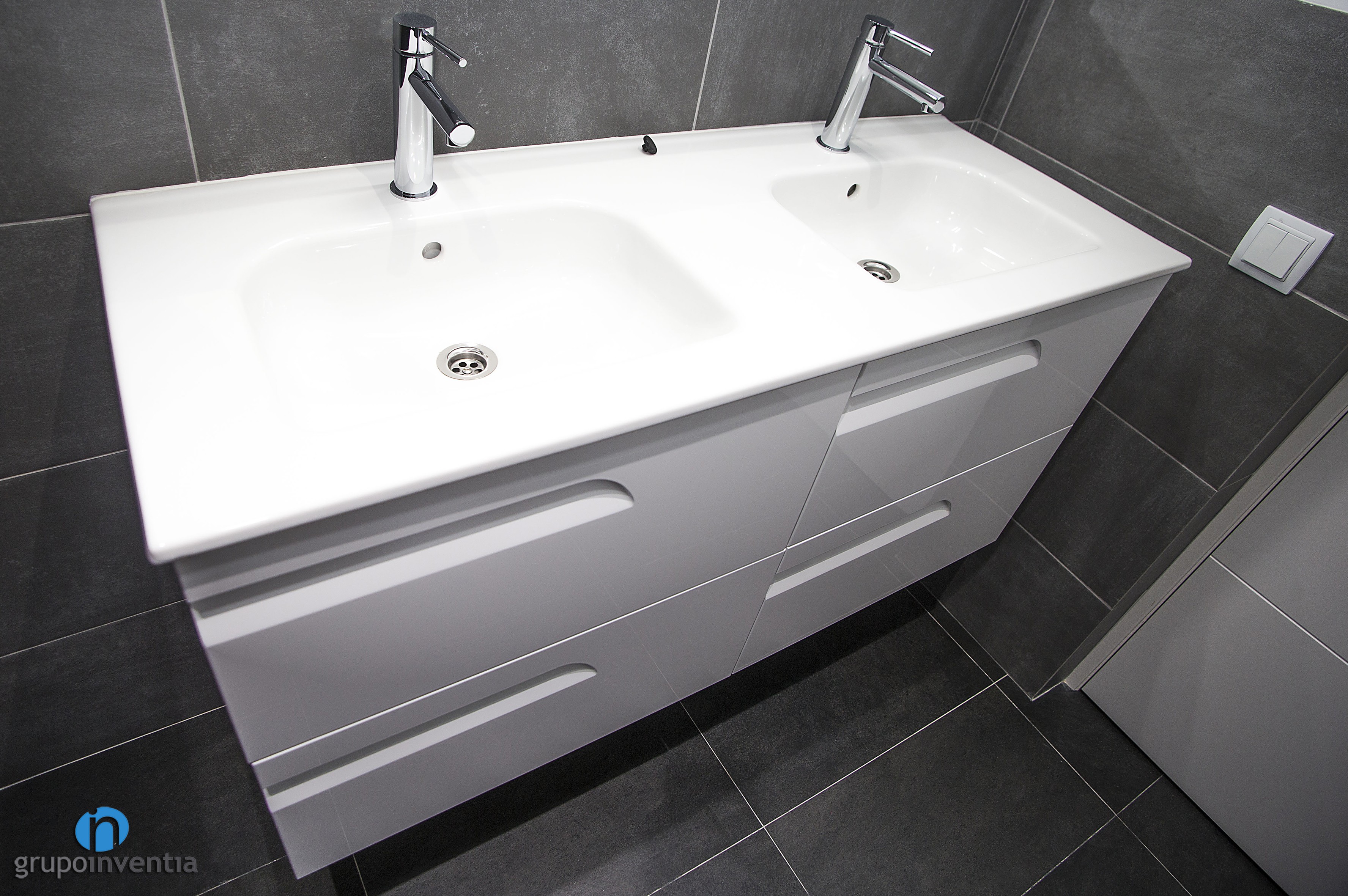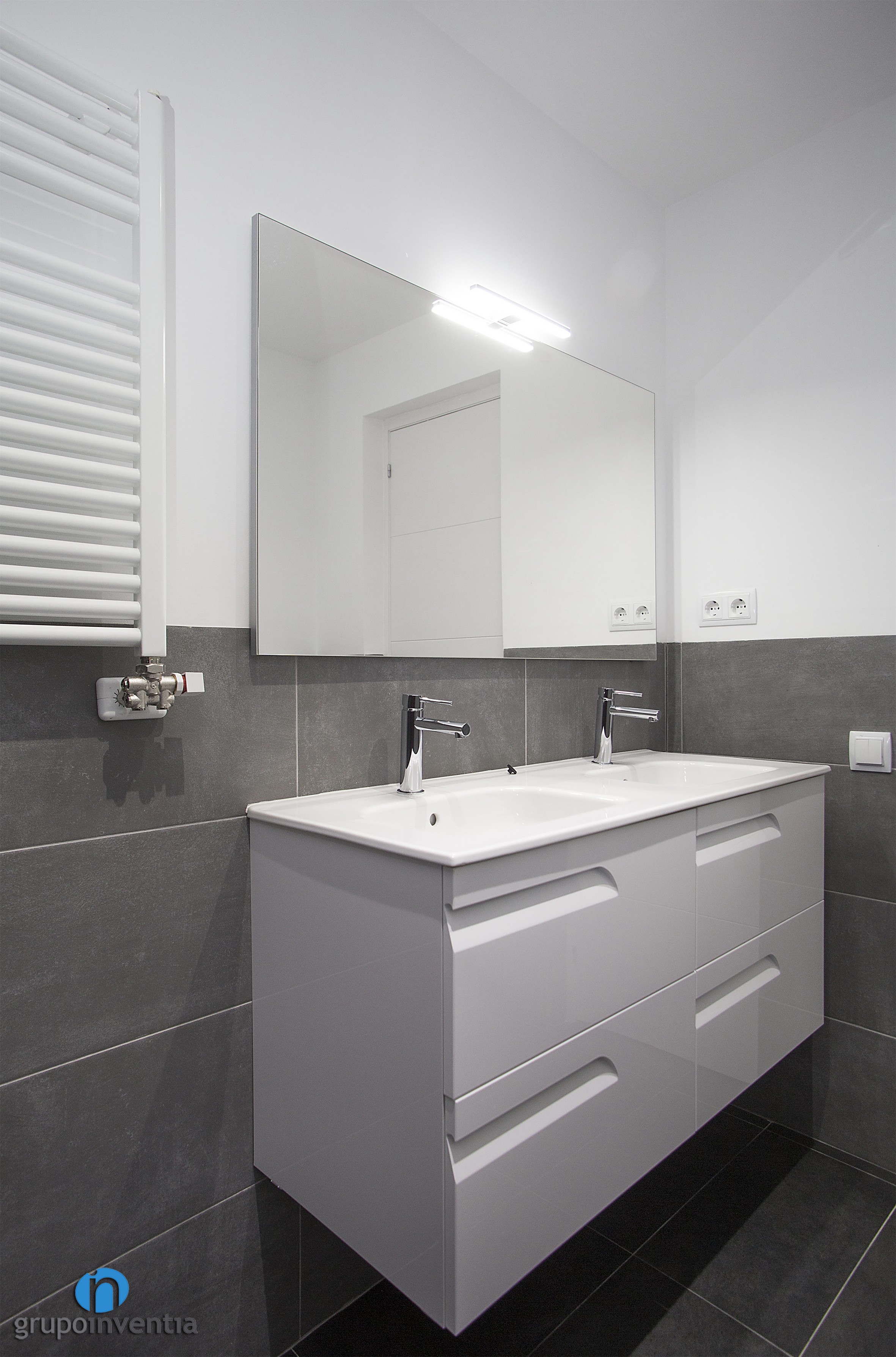 Para el diseño se apostó por un alicatado a media altura con azulejos de color gris, a excepción de los de la ducha, que son más oscuros. El resto de la pared se pintó de blanco, generando así un agradable contraste que genera mayor sensación de amplitud y luminosidad.