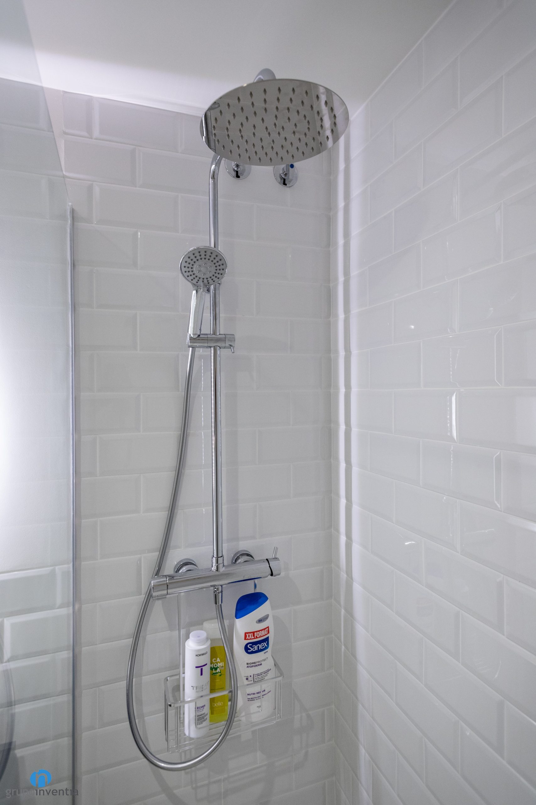 También se ha renovado la zona de aguas colocando un plato de ducha rectangular. Se ha generado un espacio amplio y que se adapta a todo tipo de momentos. Es una ducha a ras de suelo que permite una excelente movilidad. Para proteger el resto del cuarto de baño de salpicaduras se ha colocado una mampara estática y transparente.