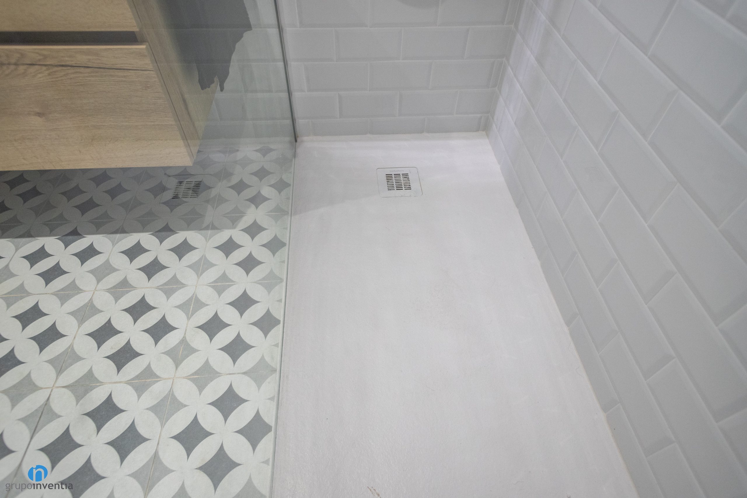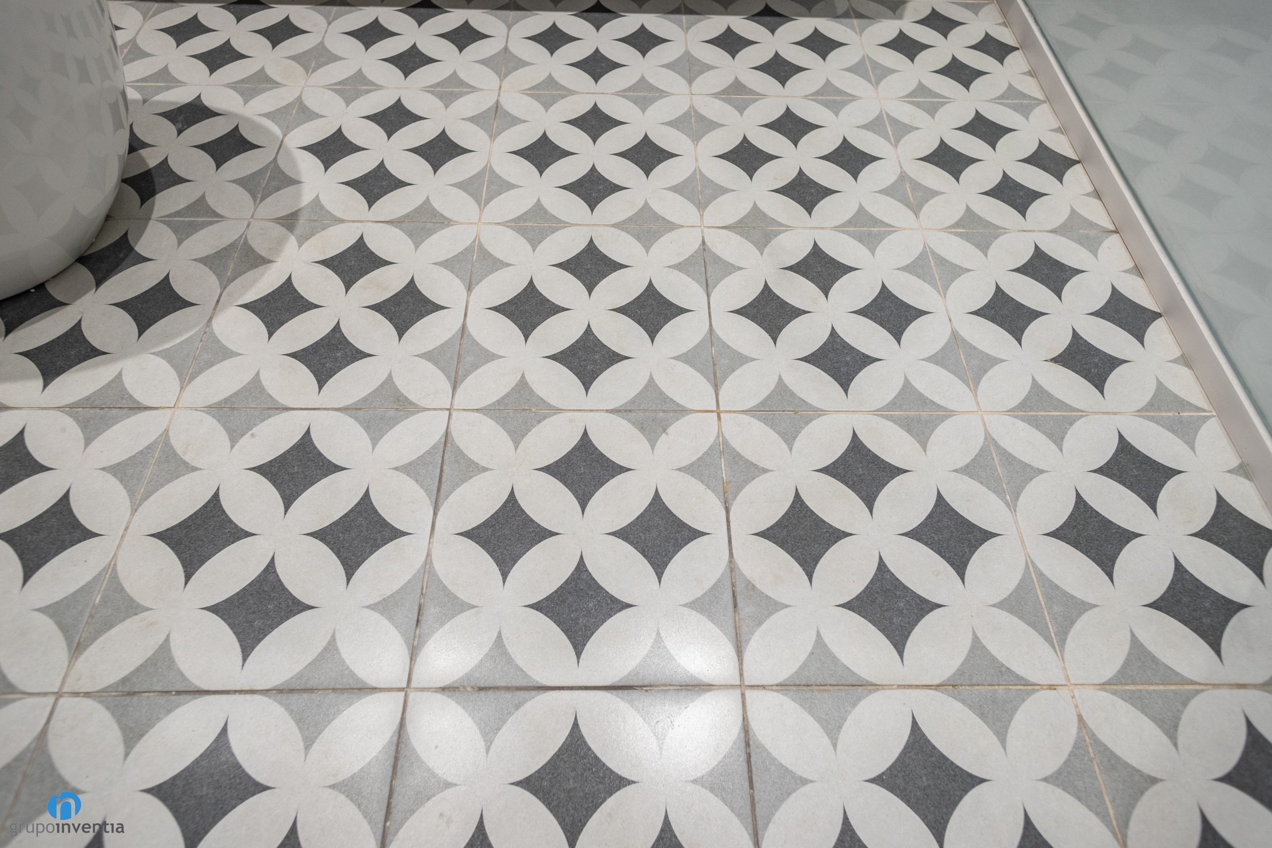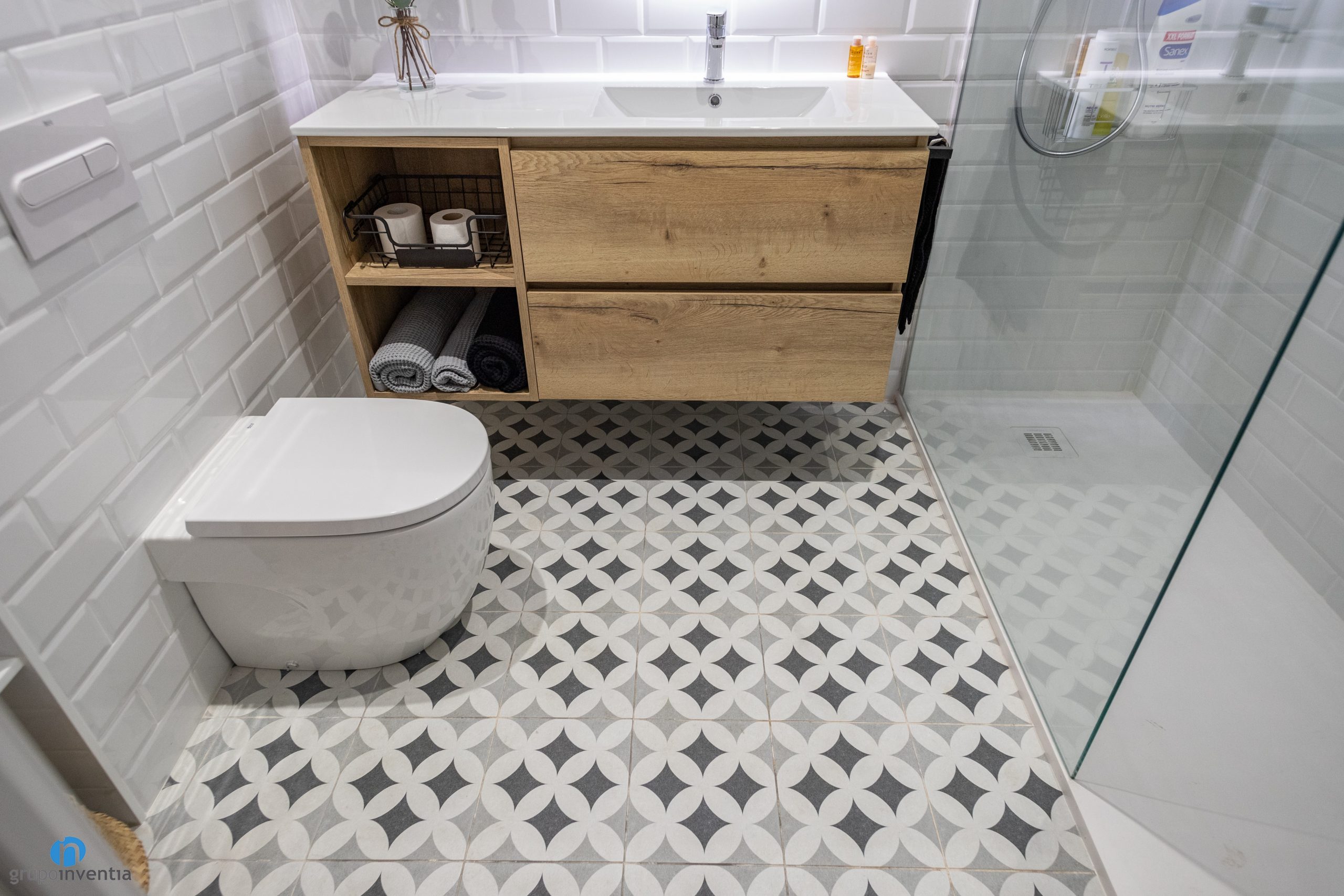 En el interiorismo de este cuarto de baño también es protagonista el nuevo pavimento que se ha colocado. Entre varias opciones se ha escogido con acierto un suelo tipo hidráulico que combina el fondo blanco con figuras en diferentes tonos de gris. Sin duda encaja en la imagen global de esta reforma de baño y le aporta mucha personalidad.