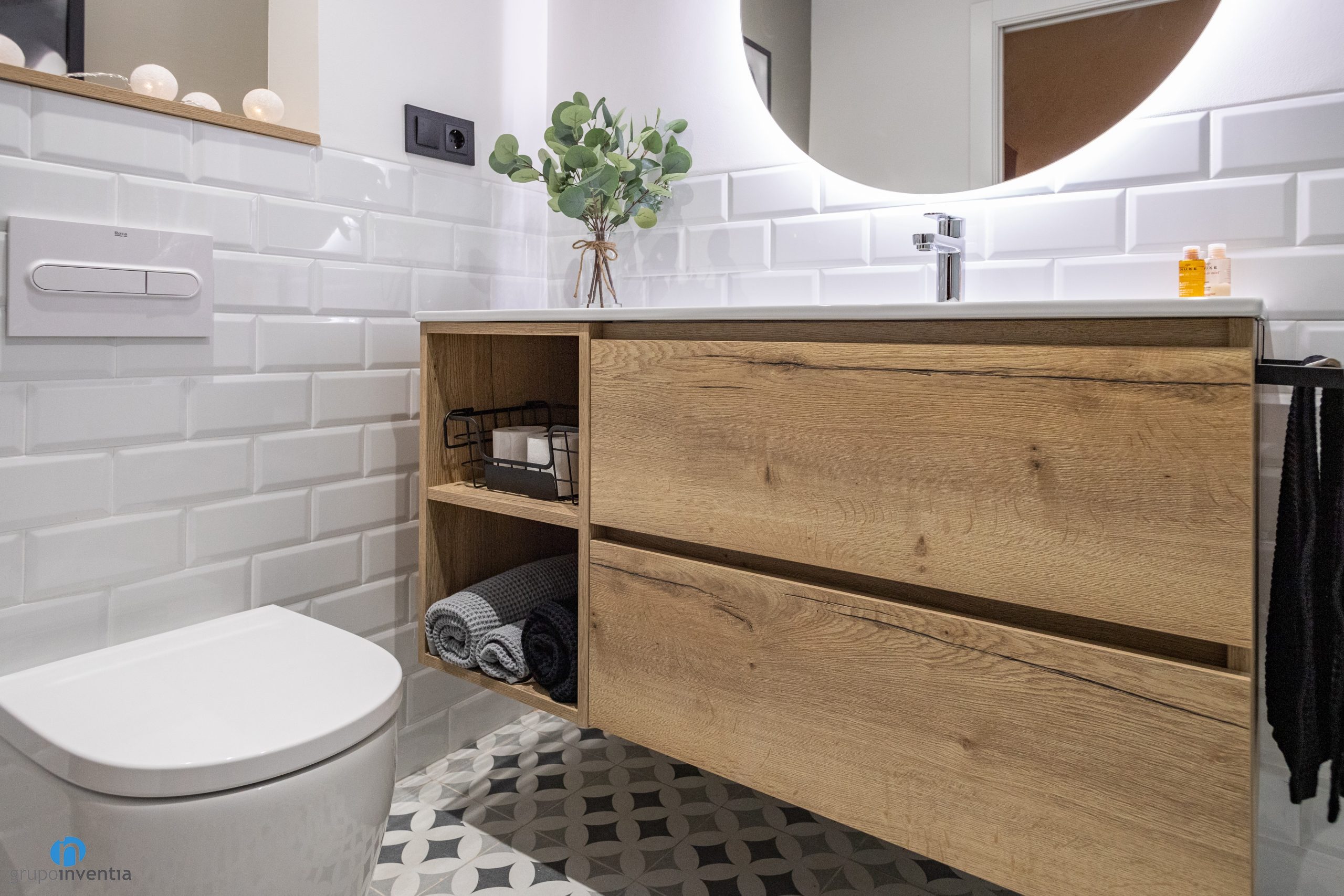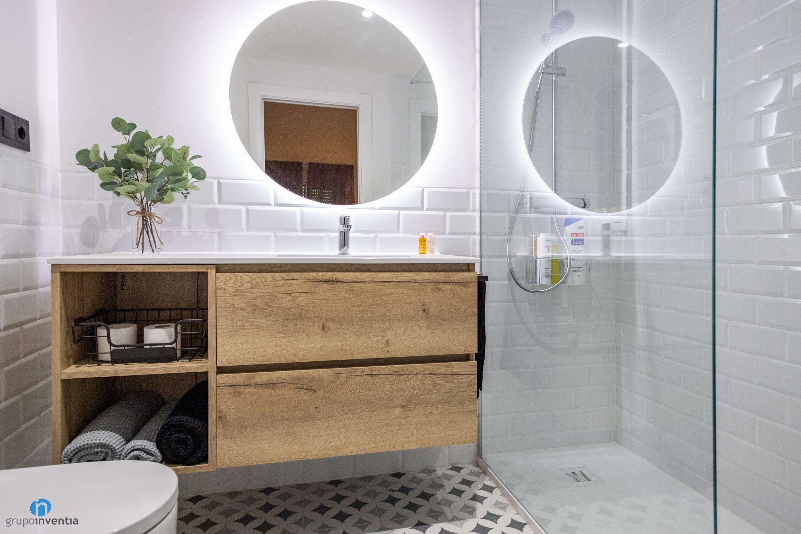 A estos acabados también les acompañan varios toques en madera. Los vemos en el mueble baño y en la estantería superior de la pared del inodoro. Como elementos de esta reforma de integral de baño también destacamos el espejo que se ha colocado sobre el lavabo. Tiene forma circular y cuenta con luces led que iluminan todo el espacio.