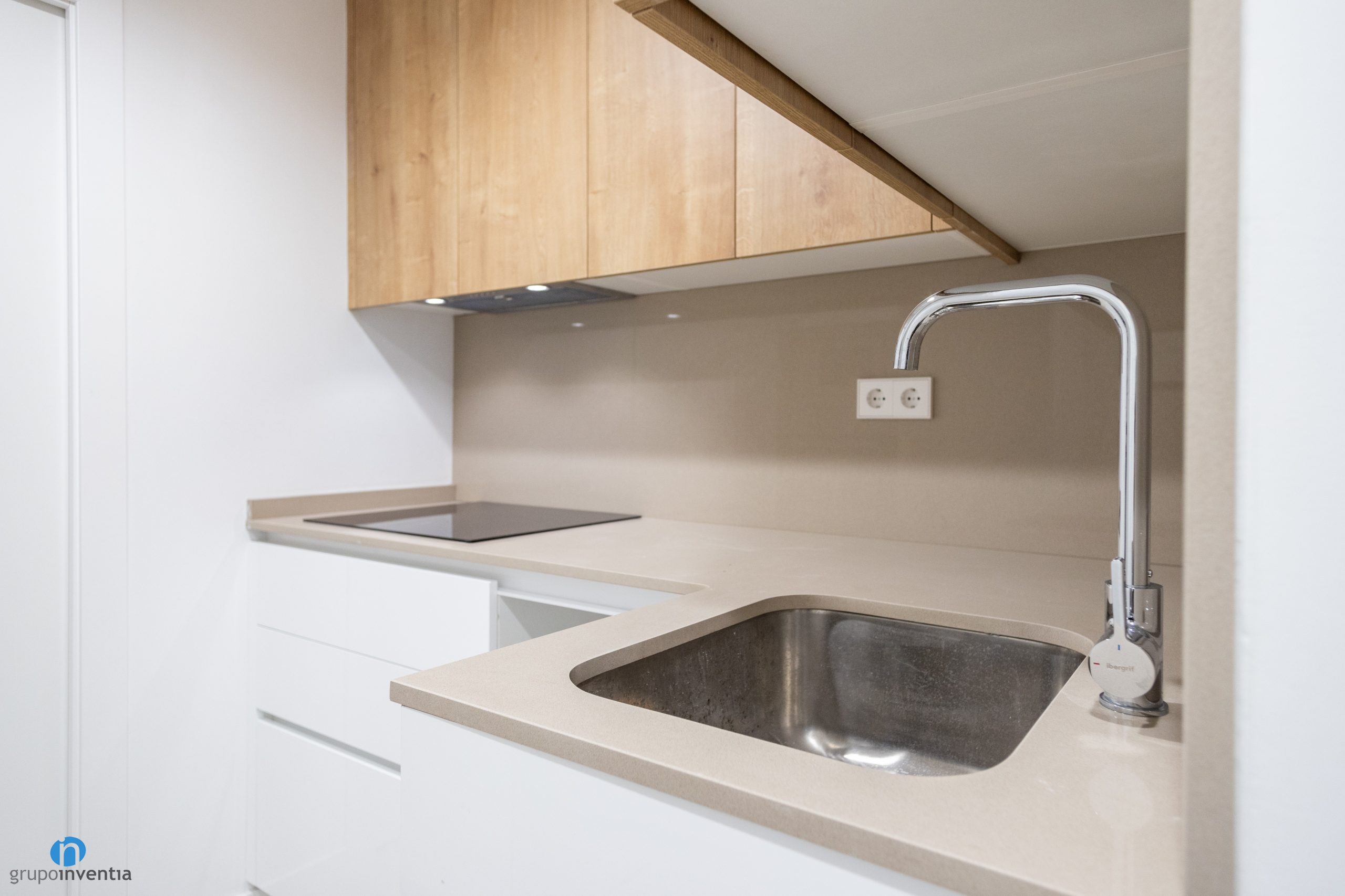 En la zona izquierda de esta reforma de cocina se ha dispuesto el mueble principal. Se distribuye en forma de L y ofrece una movilidad perfecta para todo tipo de tareas en la cocina. La encimera de color beige aporta una amplia superficie de apoyo y de trabajo. En el tramo de la izquierda se ha instalado una placa vitrocerámica, mientras que en el de la derecha se ha colocado el fregadero.
