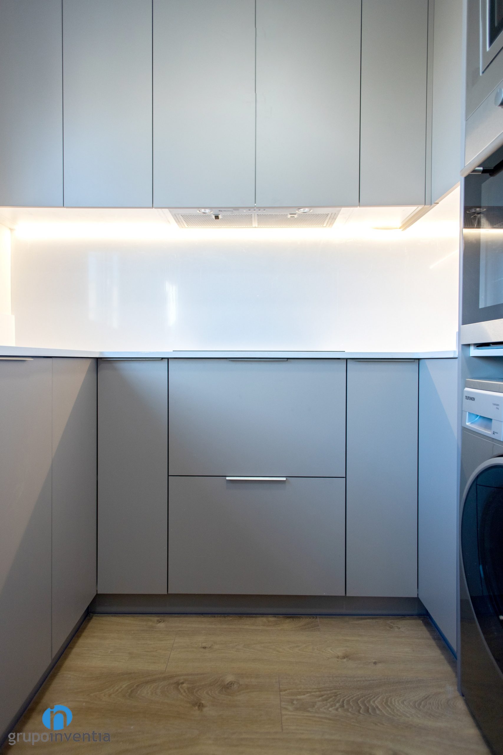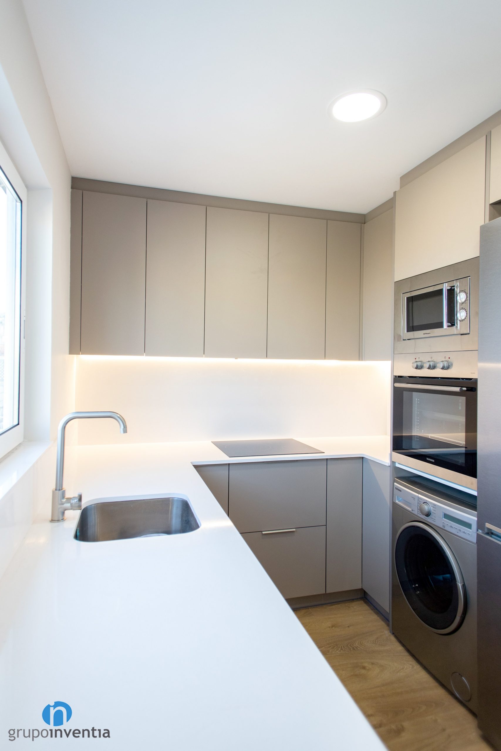 Se trata de una cocina abierta y distribuida en forma de U. La disposición de los elementos permite mucha movilidad en ella y la hace altamente funcional. En esta reforma cada elemento de cocina está en el lugar adecuado para ofrecer las mejores prestaciones. El lado derecho lo ocupan los electrodomésticos. En un mueble a medida se han encastrado la nevera, el horno y el microondas.